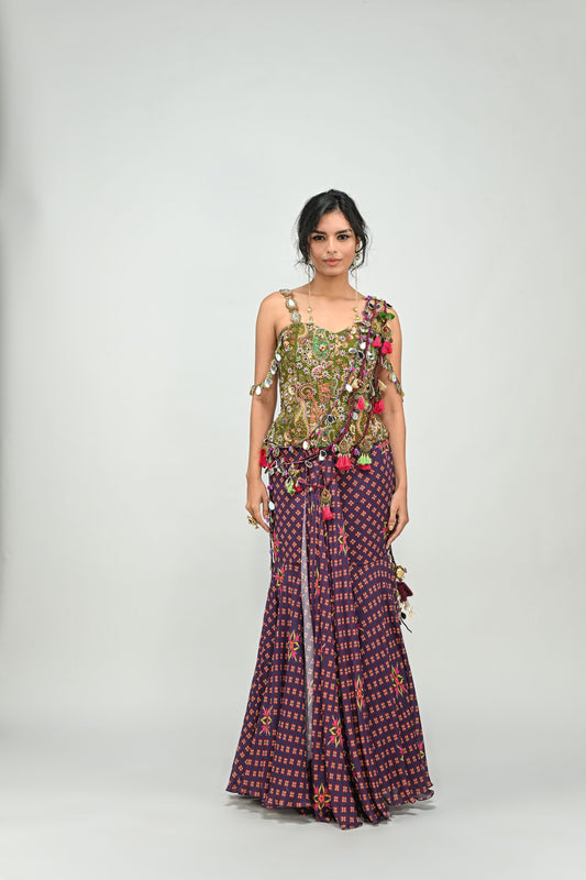 PLUM PRESTITCHED TASSEL SAREE PAIRED WITH BADLA EMBROIDERED GREEN CORSET