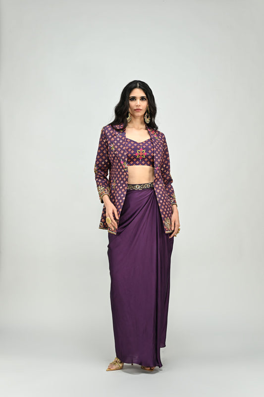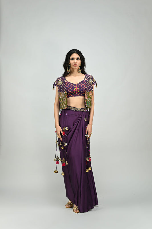 PLUM PATCH HIGHLIGHTED TASSEL JACKET DHOTI SKIRT SET