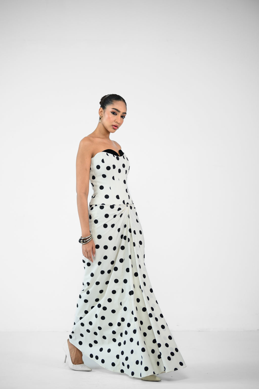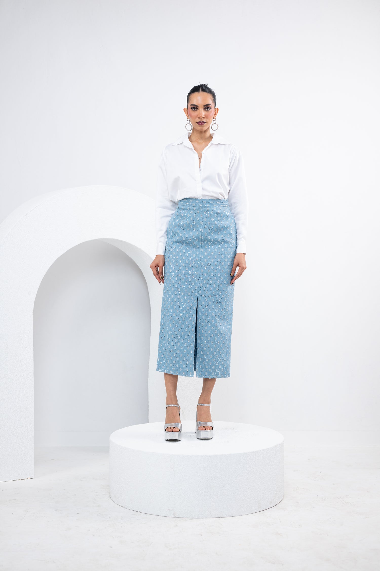 BLACK SHIRT DRESS WITH DOTTED DENIM BELT BAG