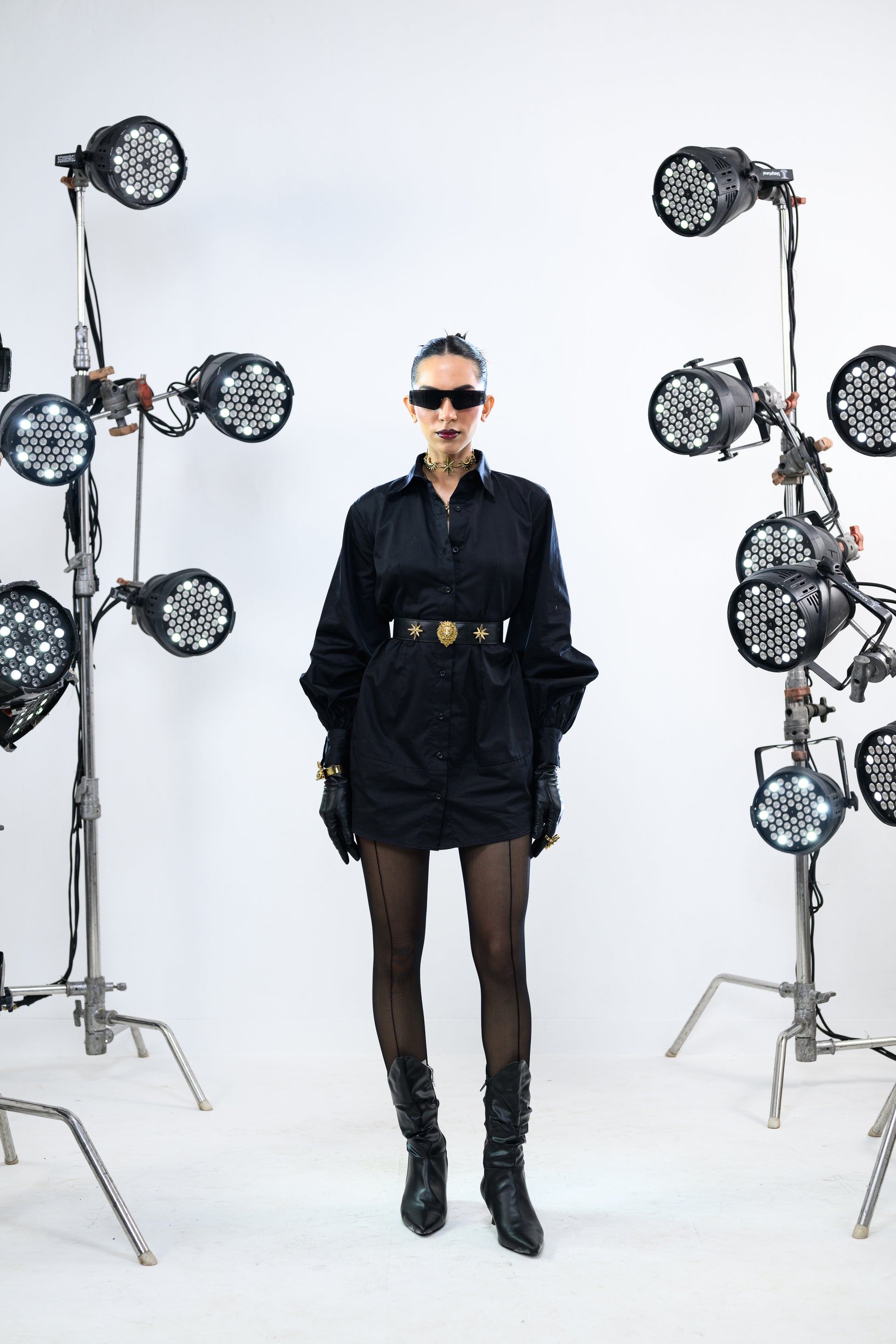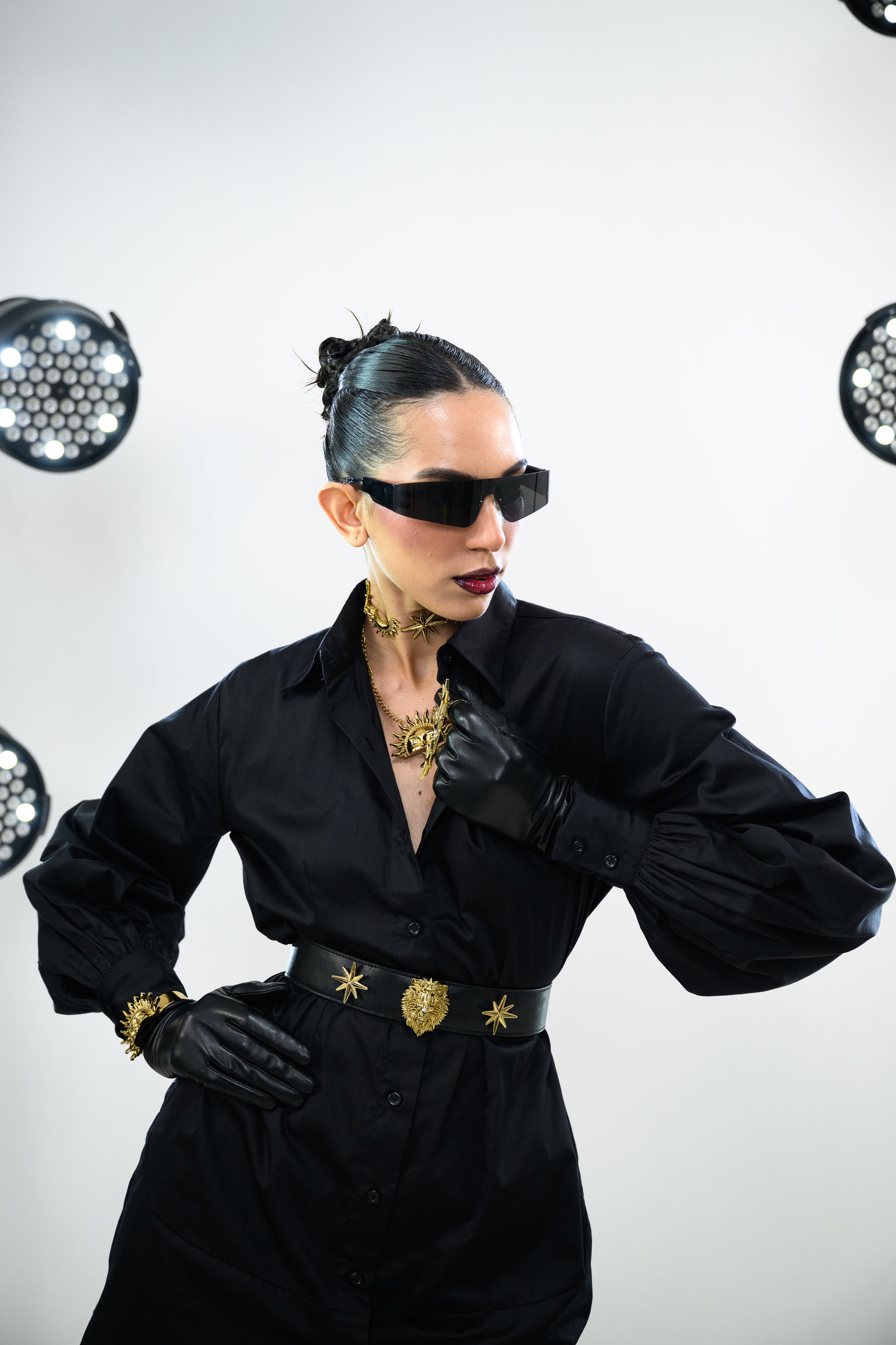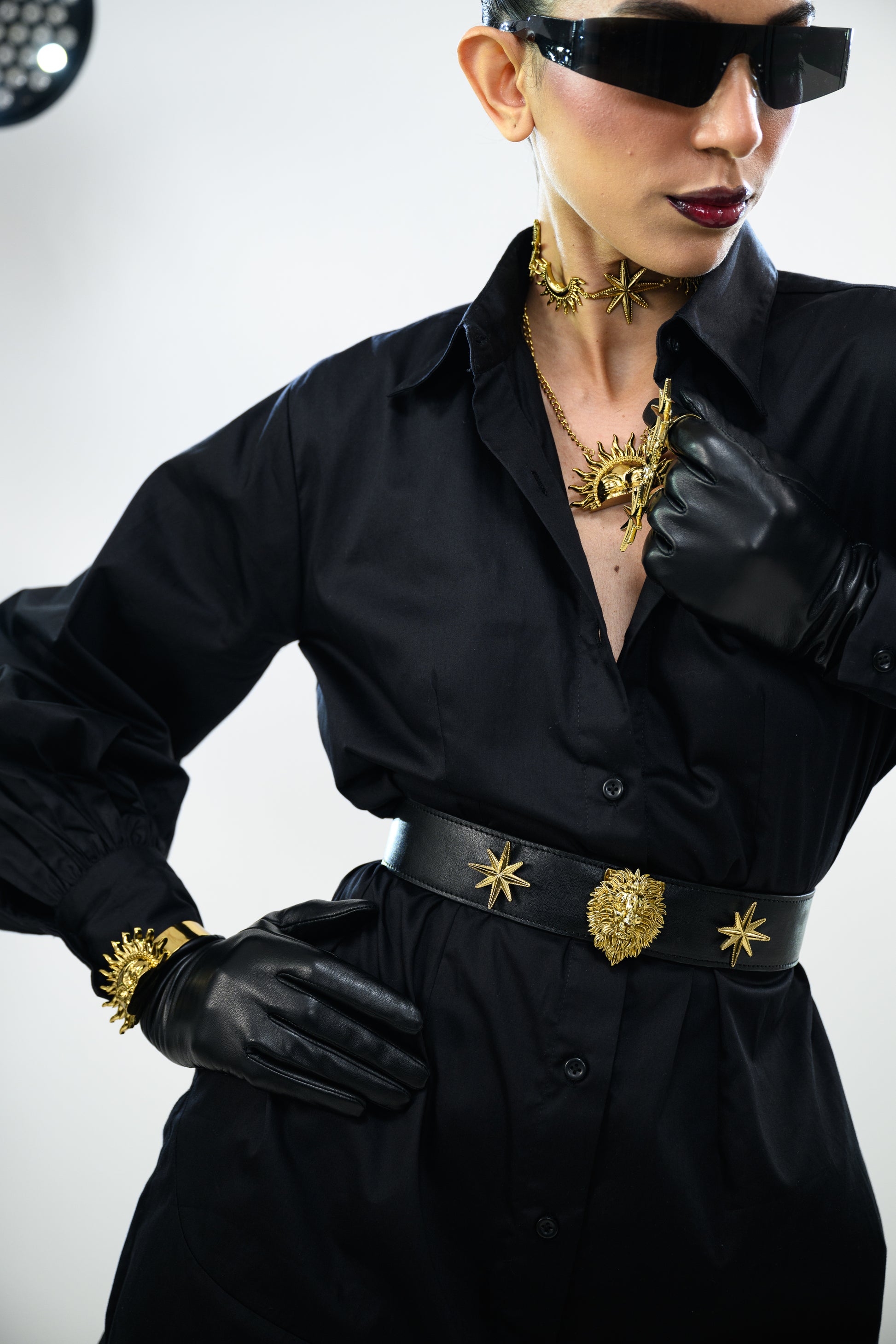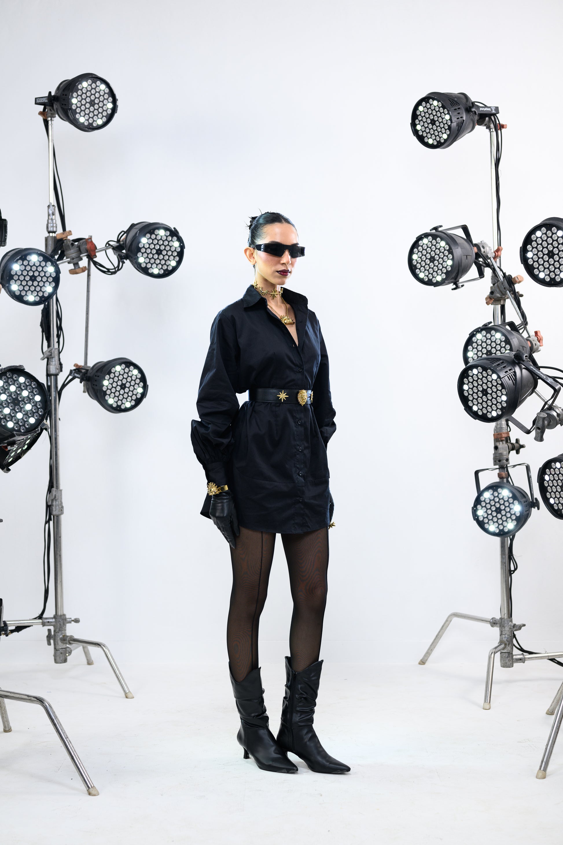 BLACK SHIRT DRESS PAIRED WITH LION STAR BELT