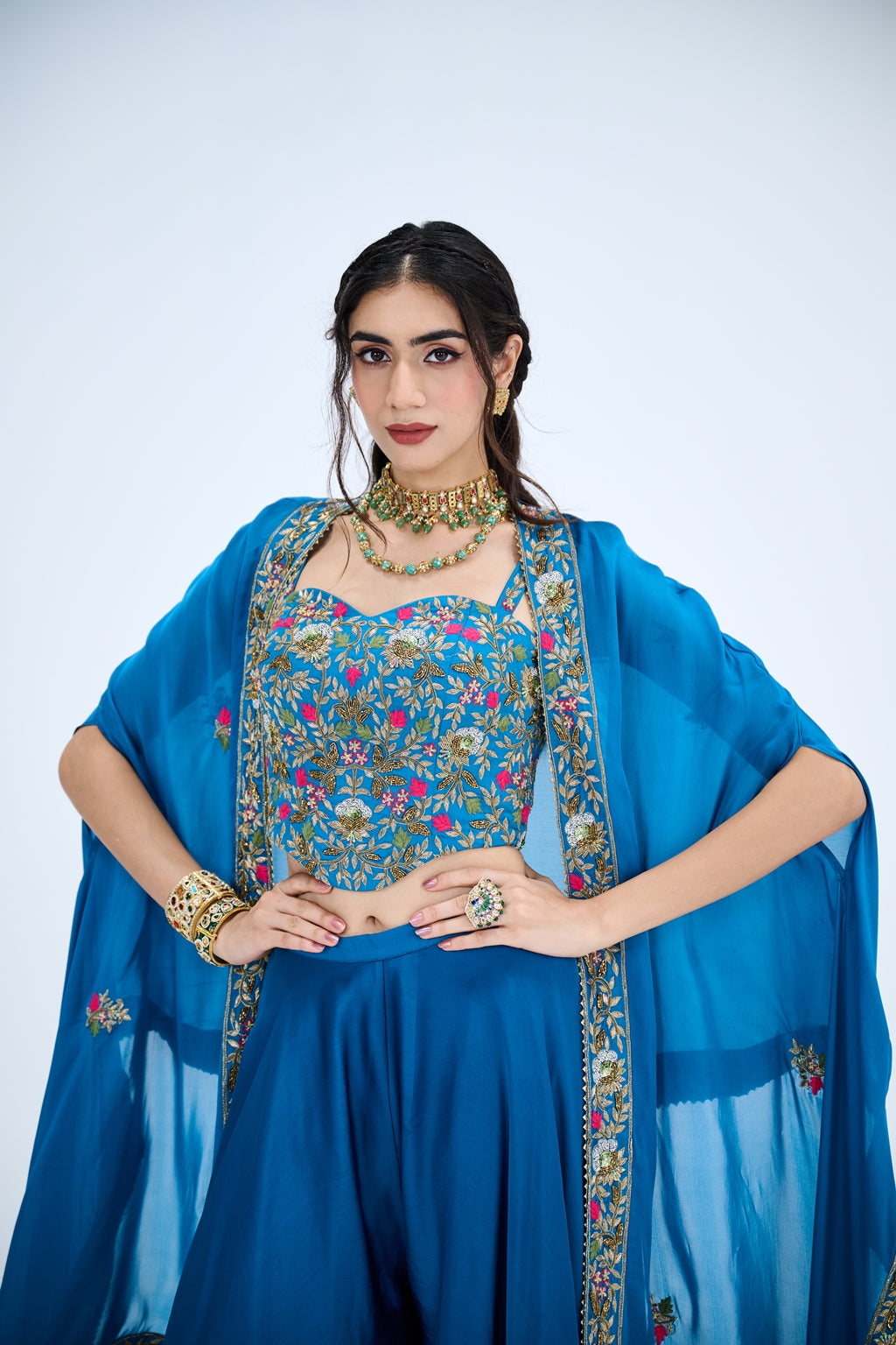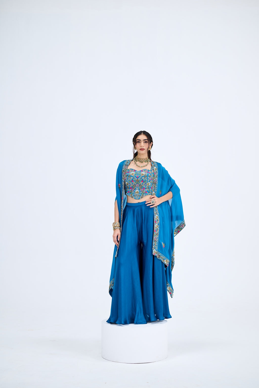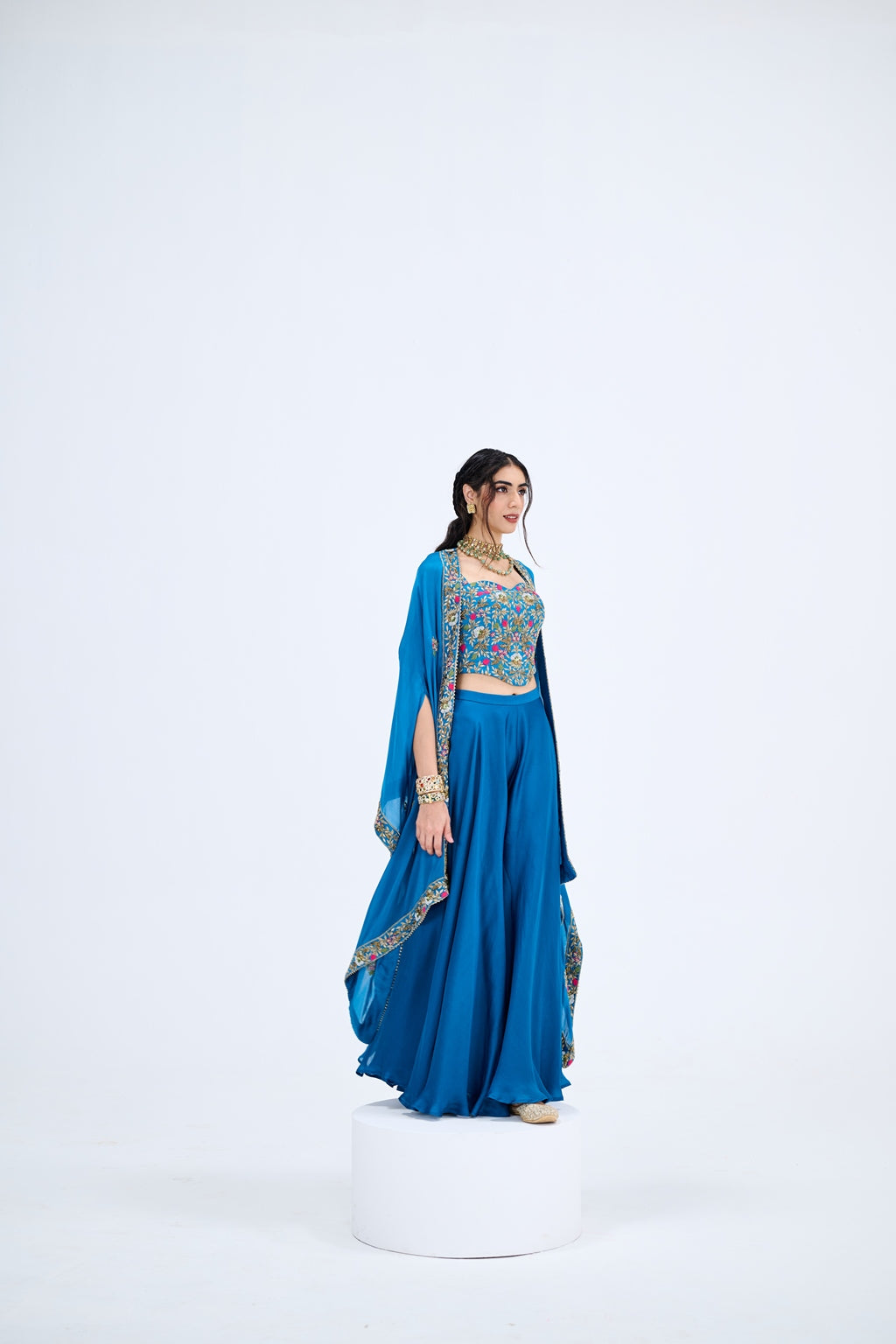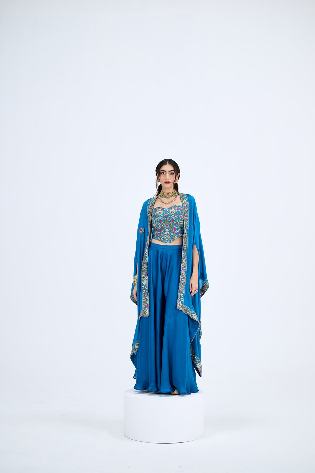 BLUE FLARED PANTS PAIRED WITH EMBROIDEREED CORSET WITH CAPE SET