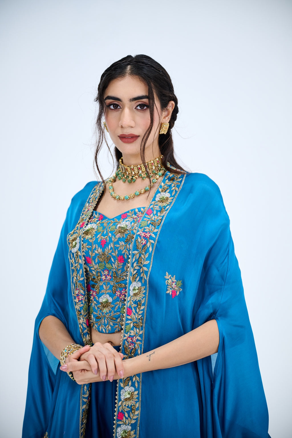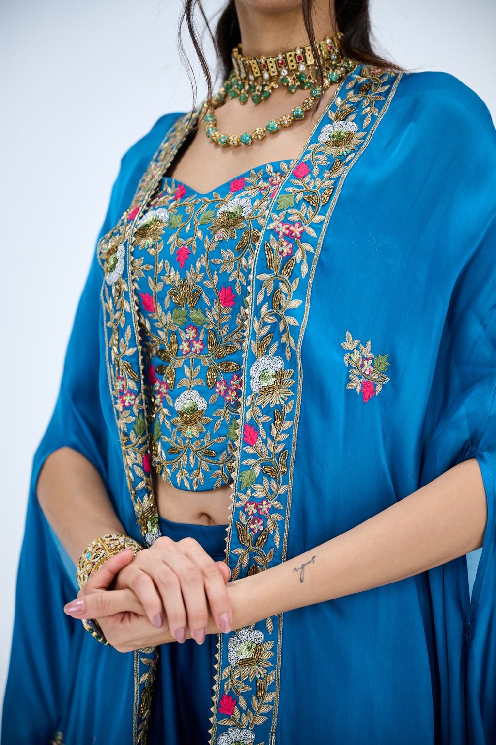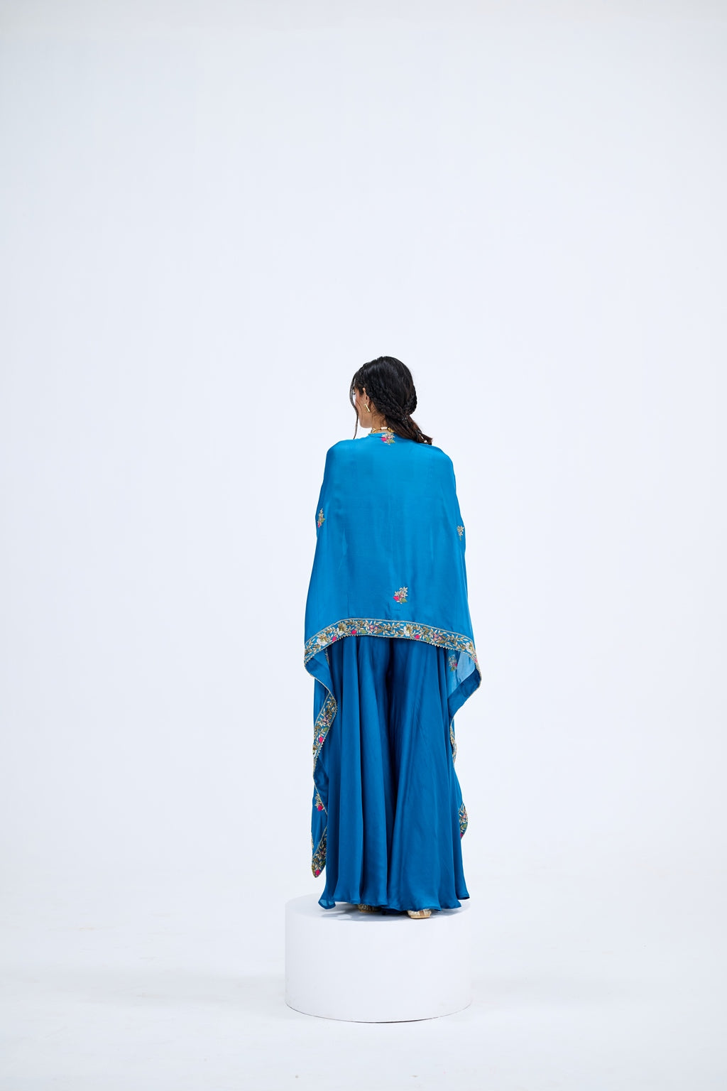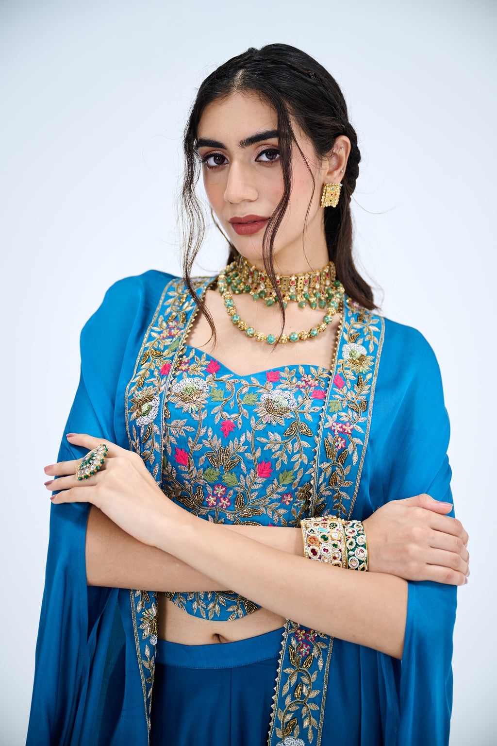 BLUE FLARED PANTS PAIRED WITH EMBROIDEREED CORSET WITH CAPE SET