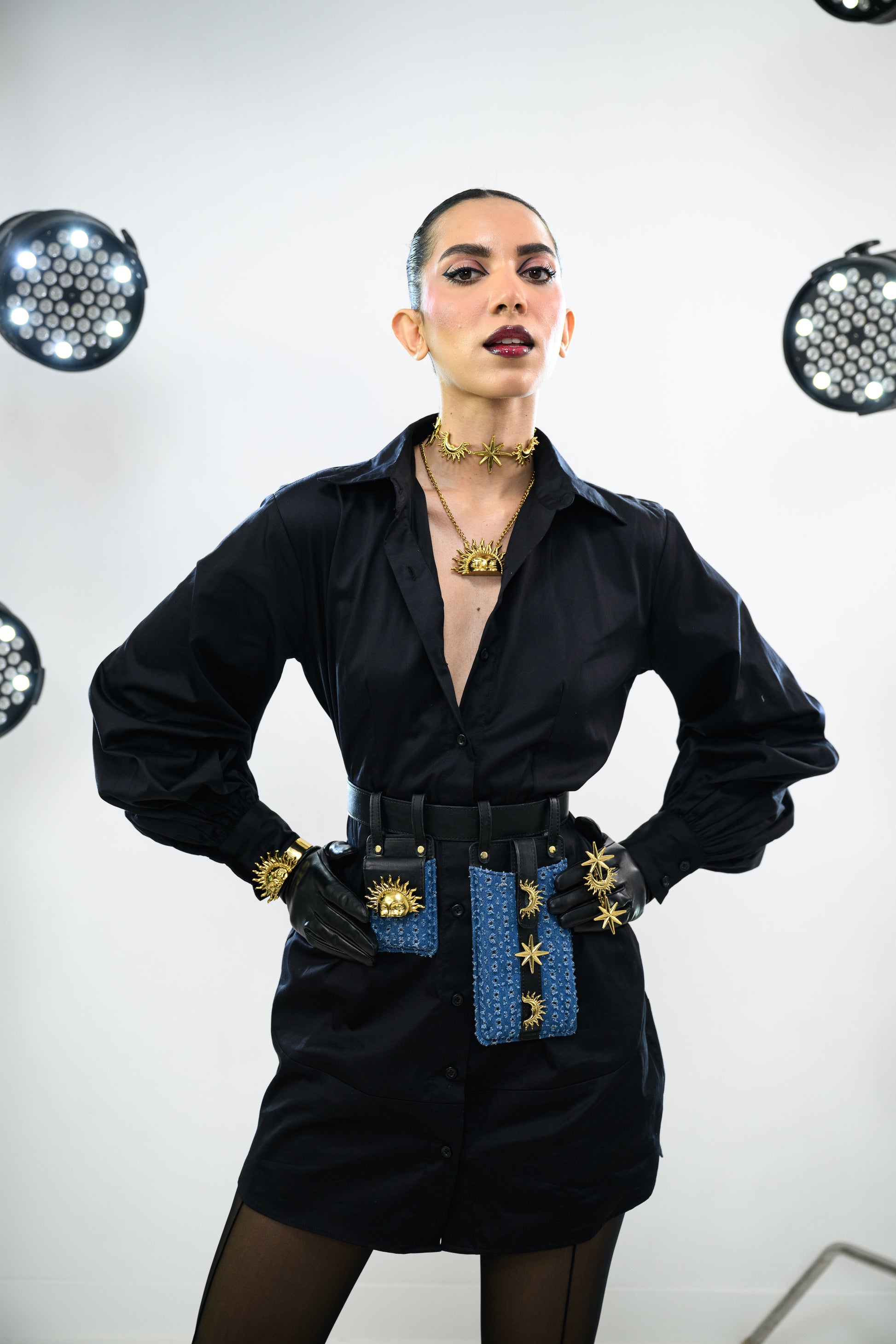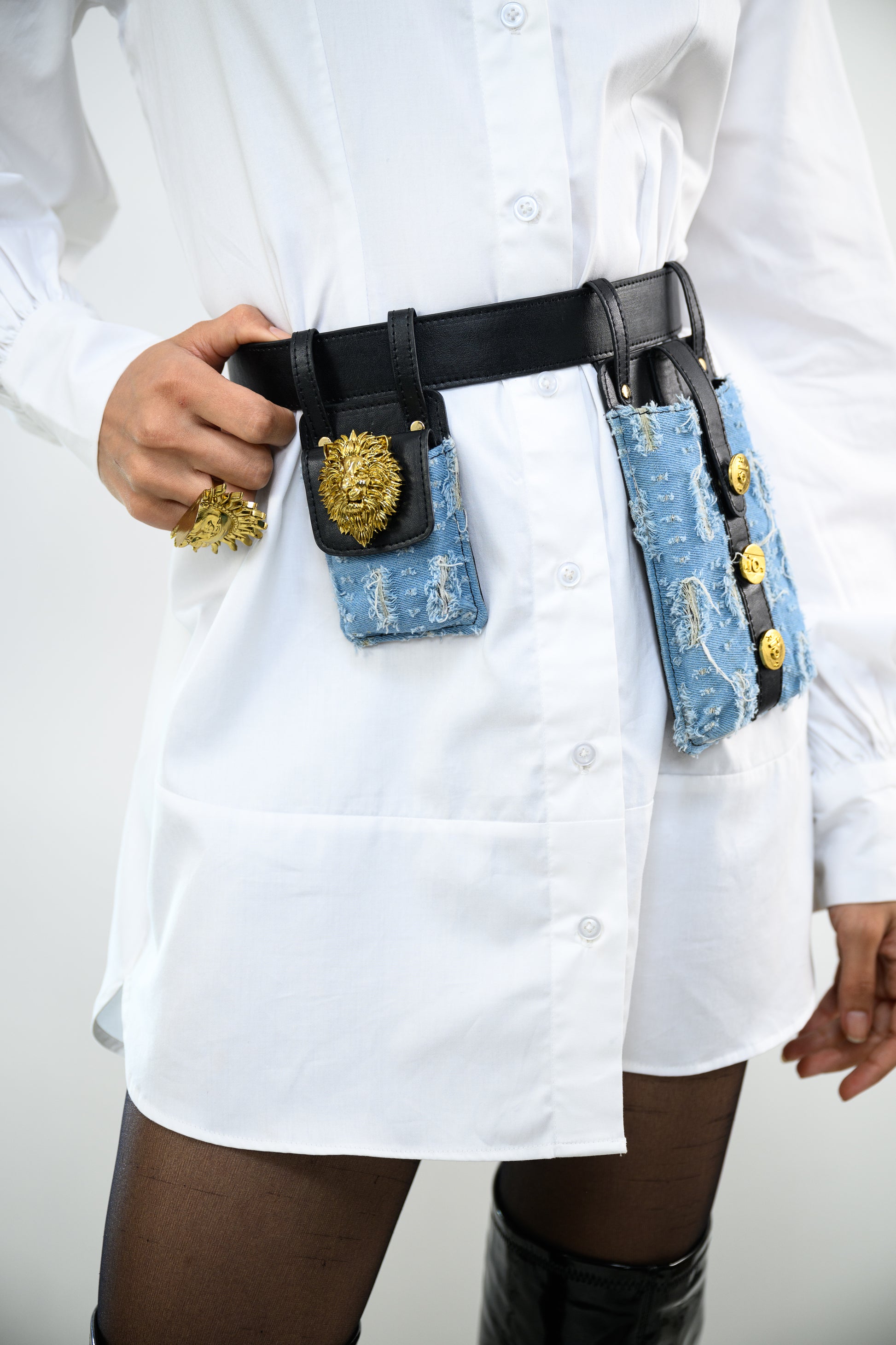 VEGAN LEATHER, DENIM & BRASS WITH RHODIUM POLISH