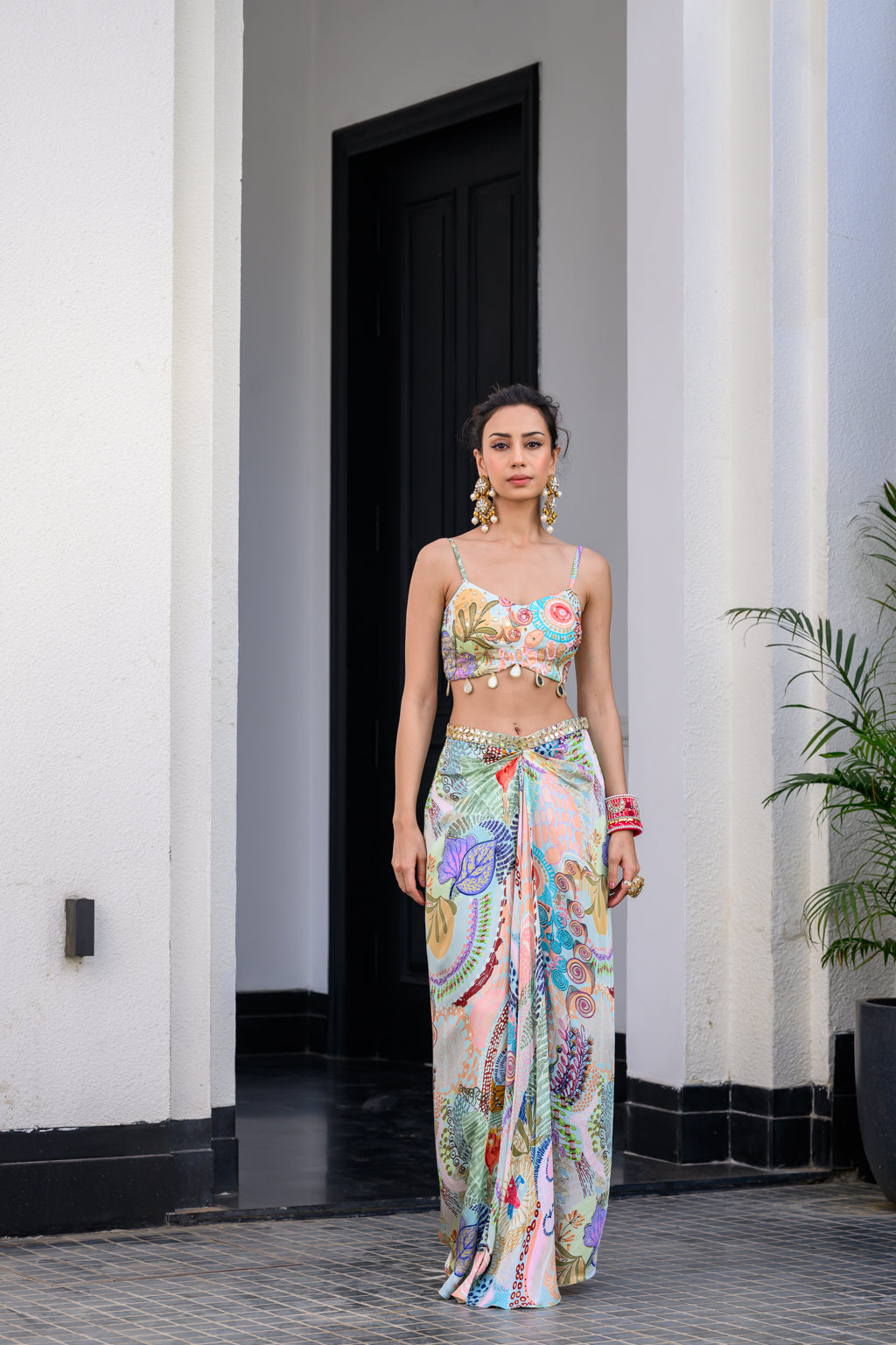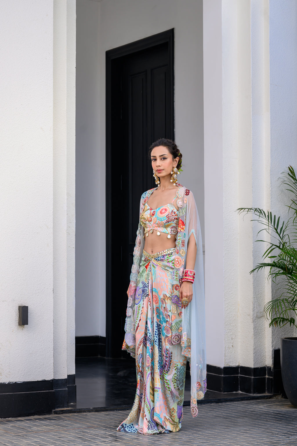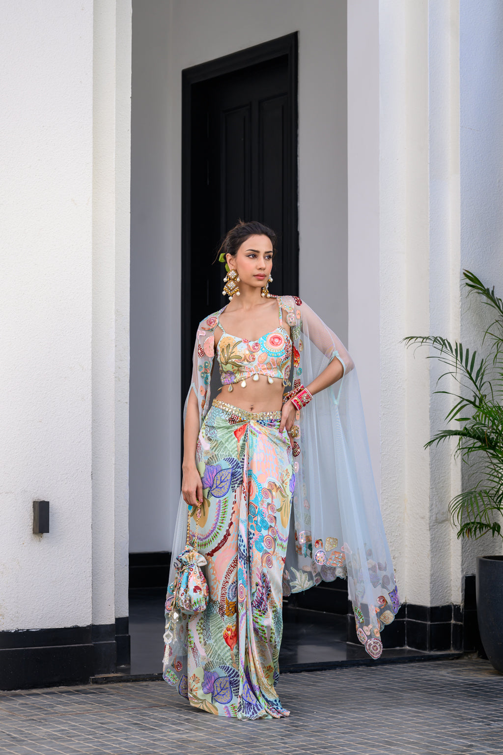 GARDENIA DHOTI SKIRT SET PAIRED WITH HIGHLITED BRALLETEE WITH HIGHLIGHTED APLLIQUE CAPE