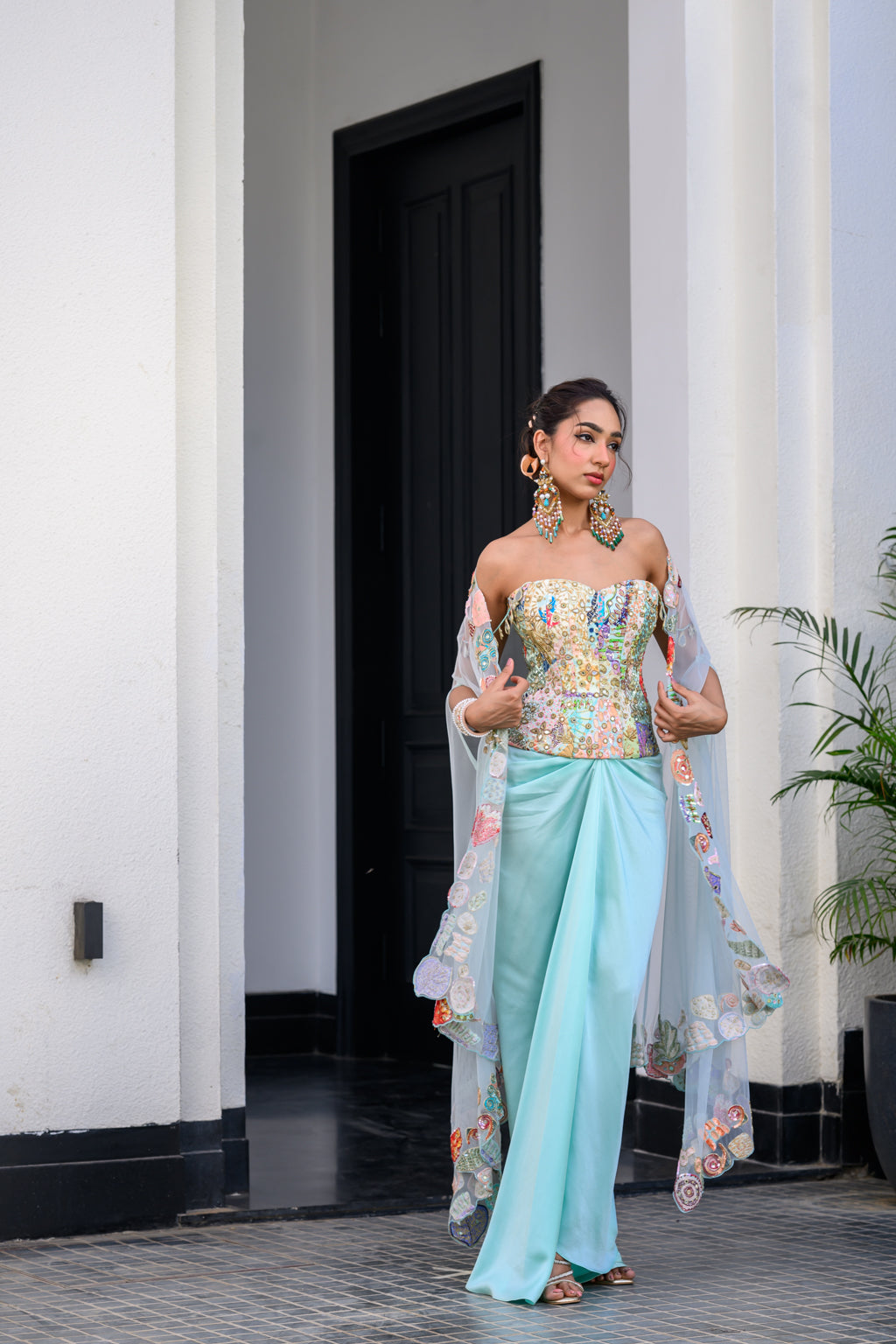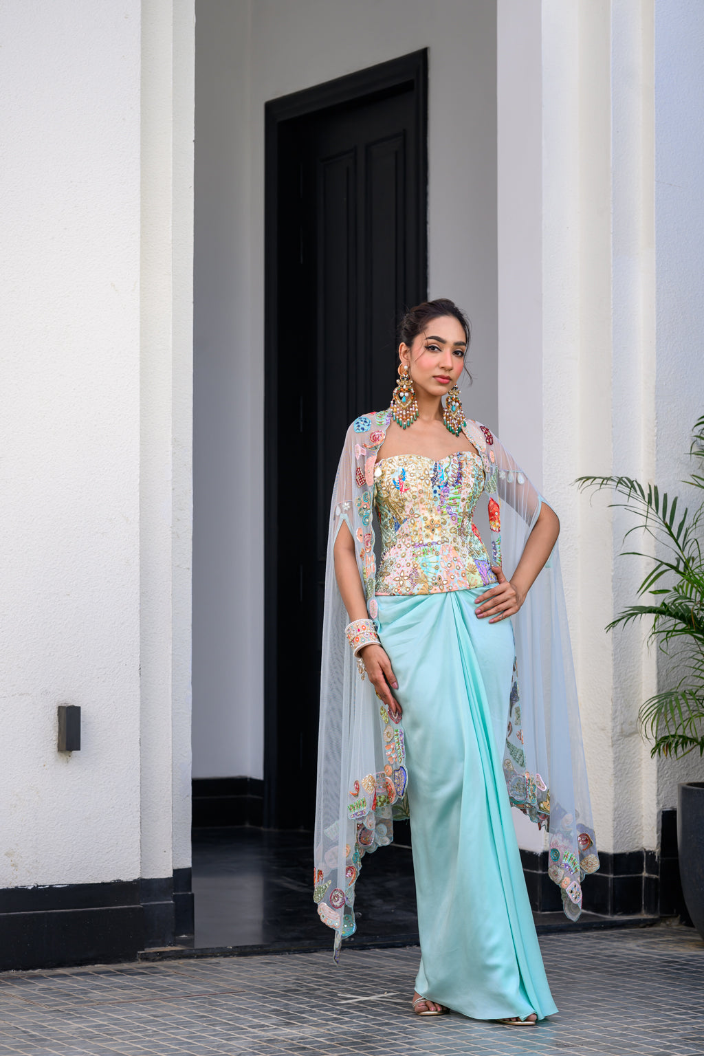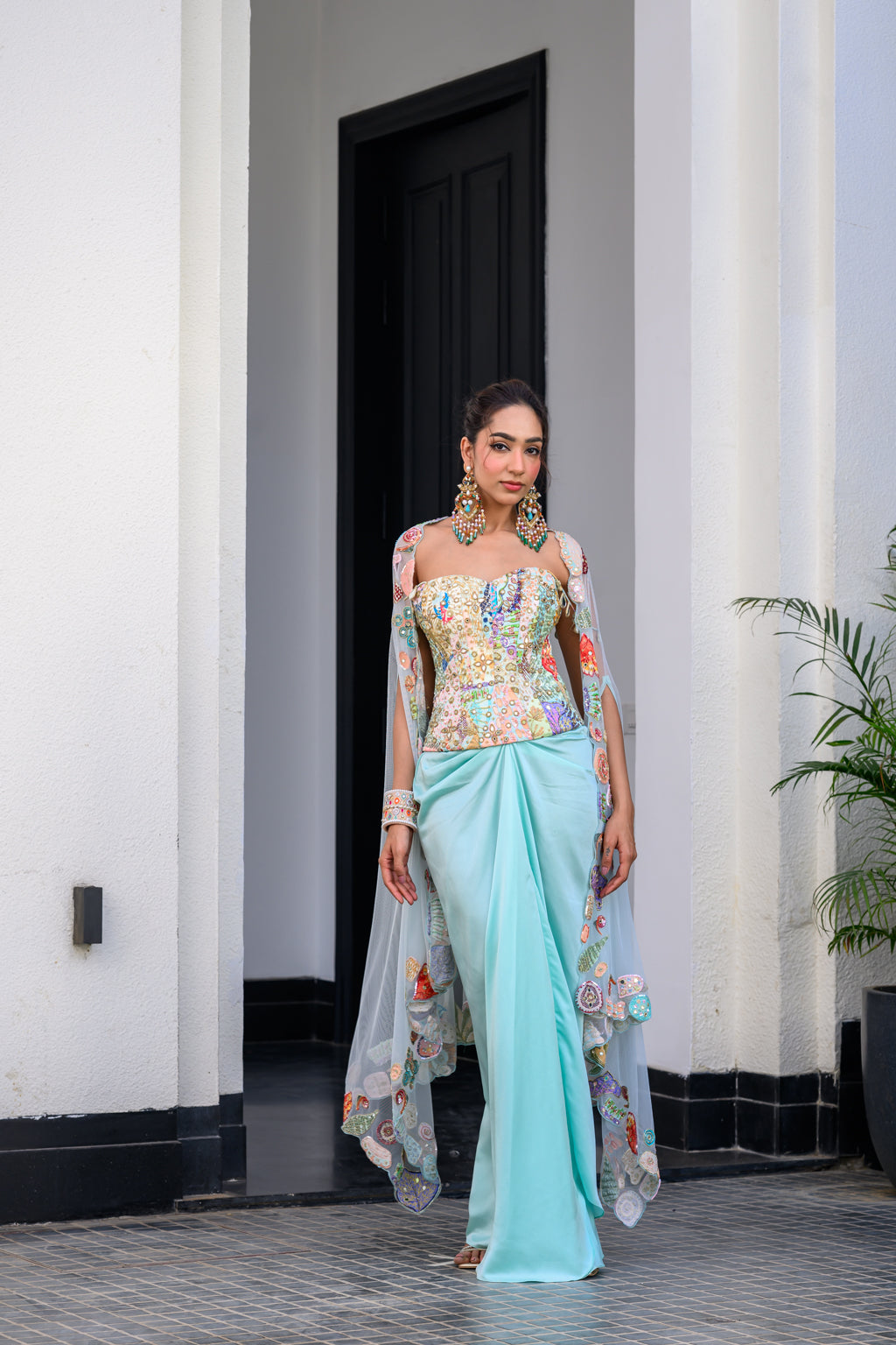 GARDENIA HIGHLIGHTED CORSET WITH DHOTI SKIRT AND CAPE