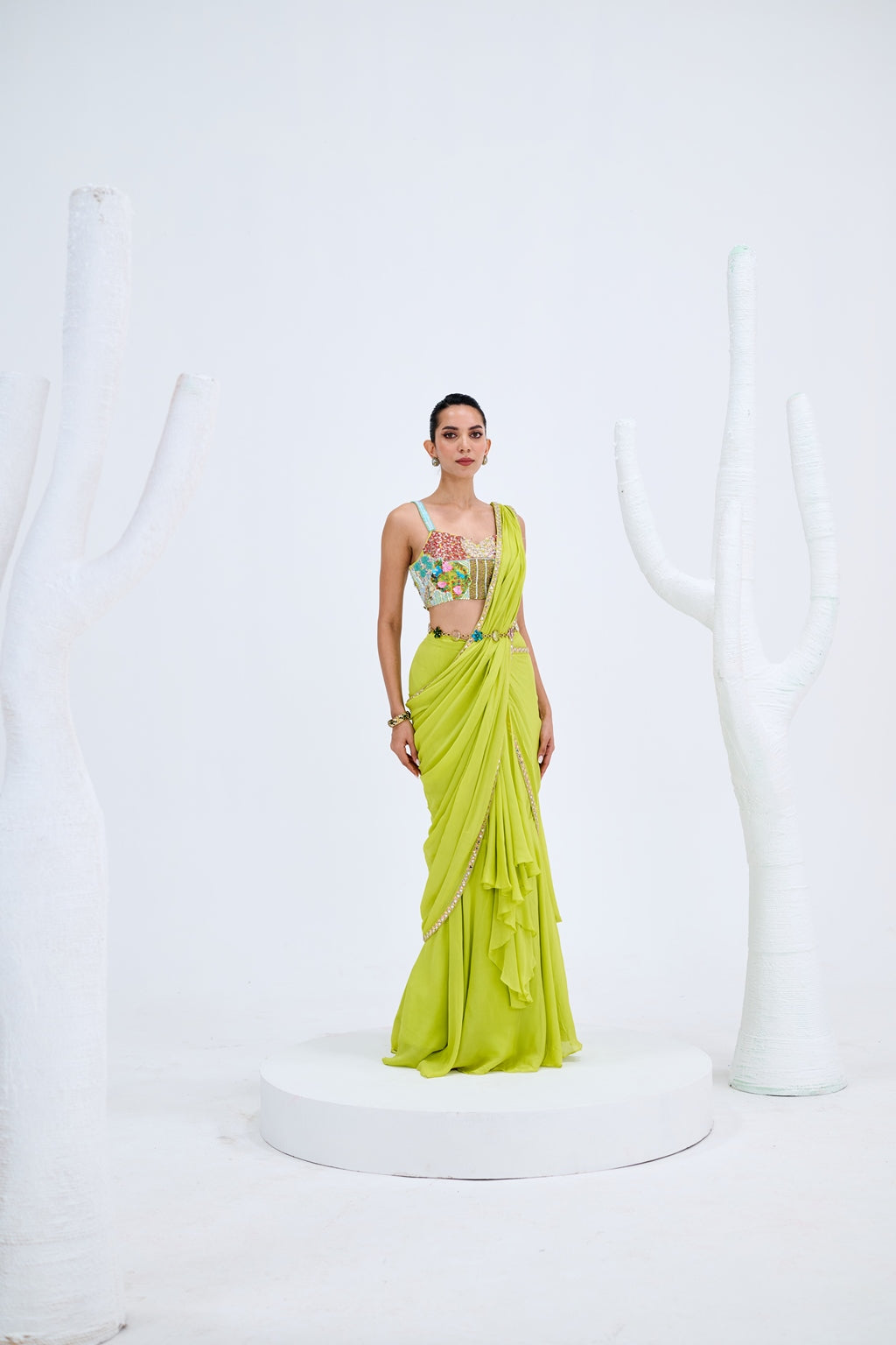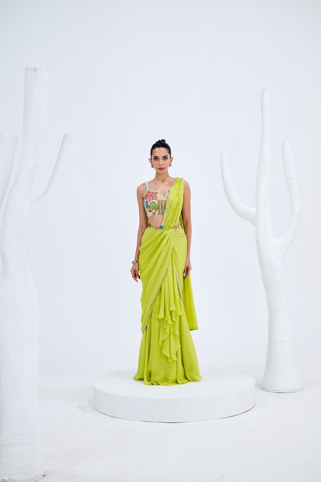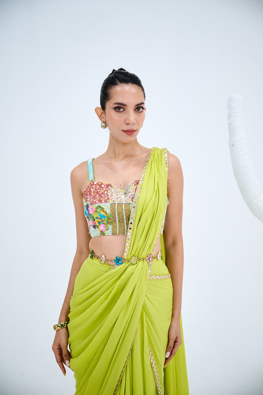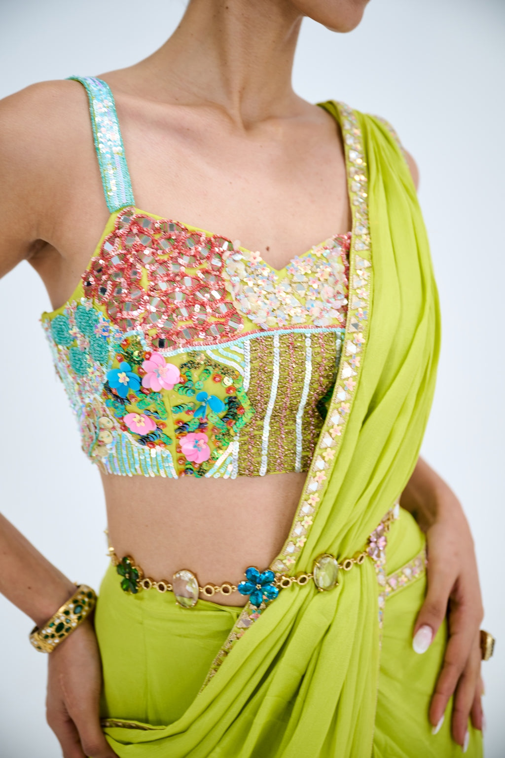 LIGHT GREEN PRE DRAPED SAREE PAIRED WITH EMBROIDERED CORSET AND EMEBELISHED BELT