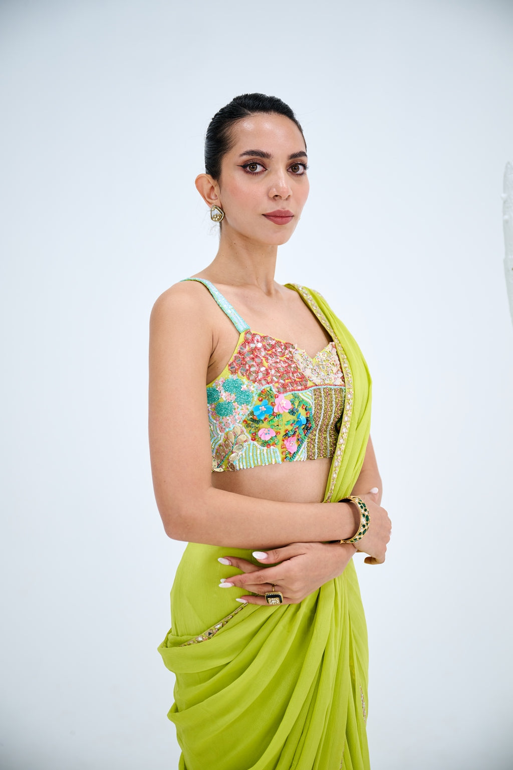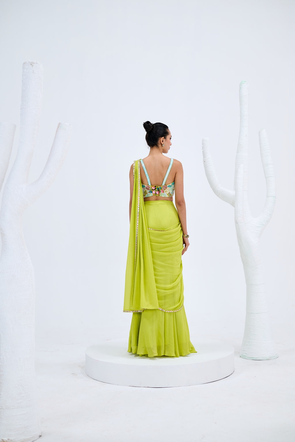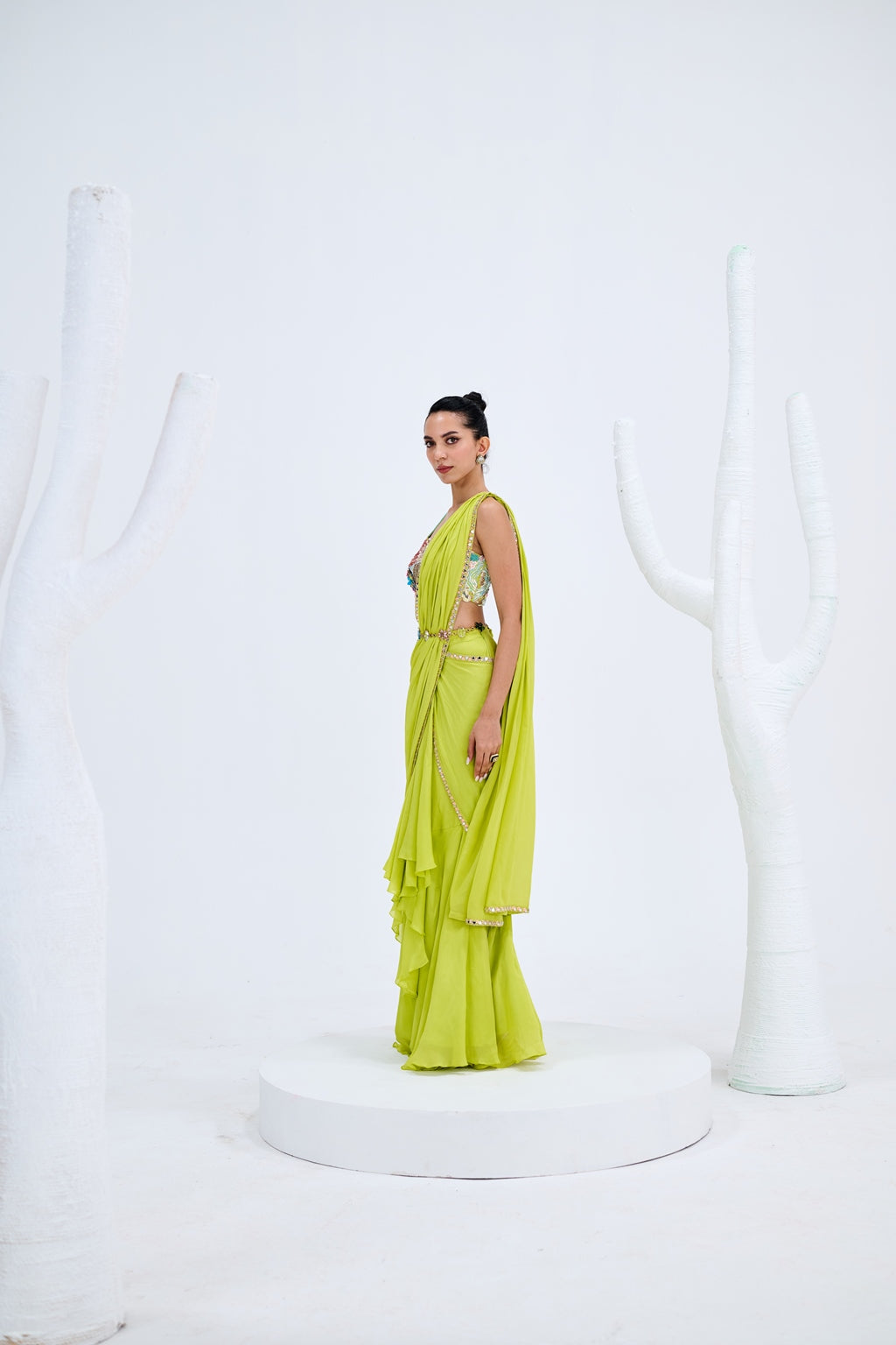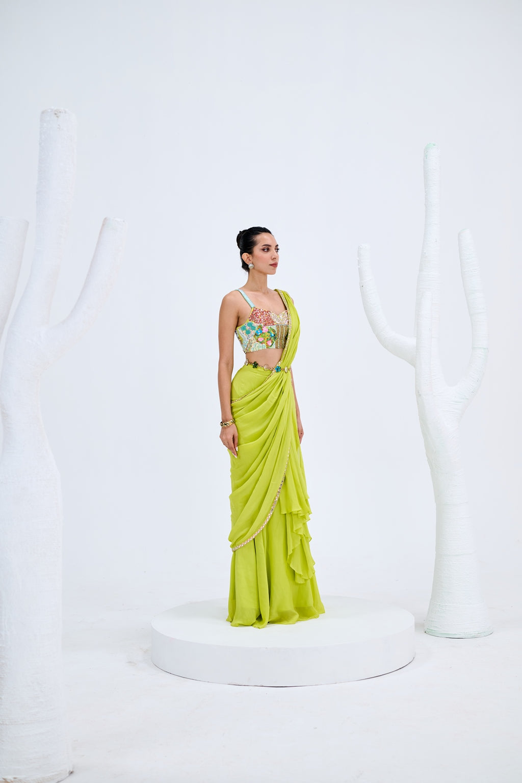 LIGHT GREEN PRE DRAPED SAREE PAIRED WITH EMBROIDERED CORSET AND EMEBELISHED BELT