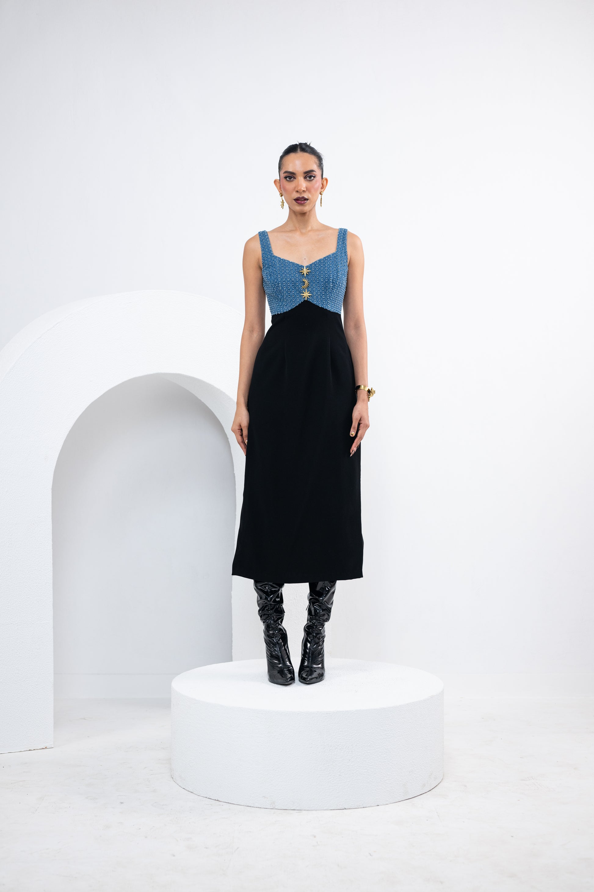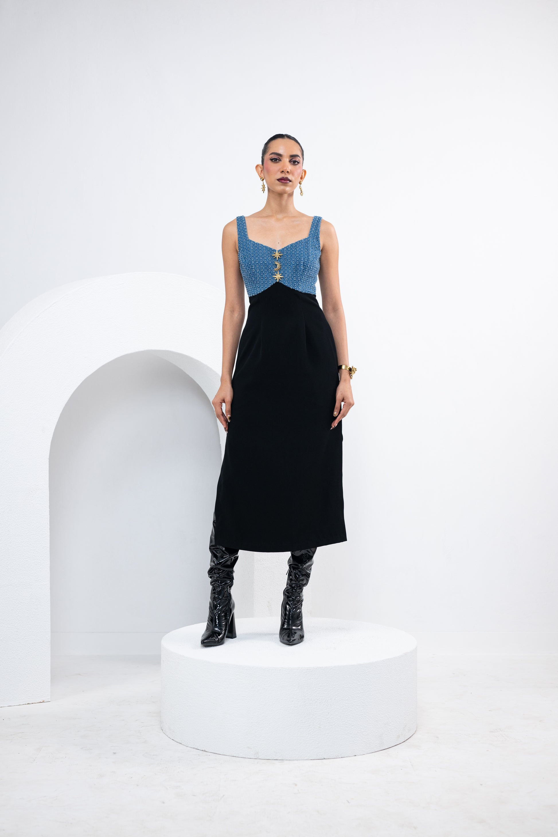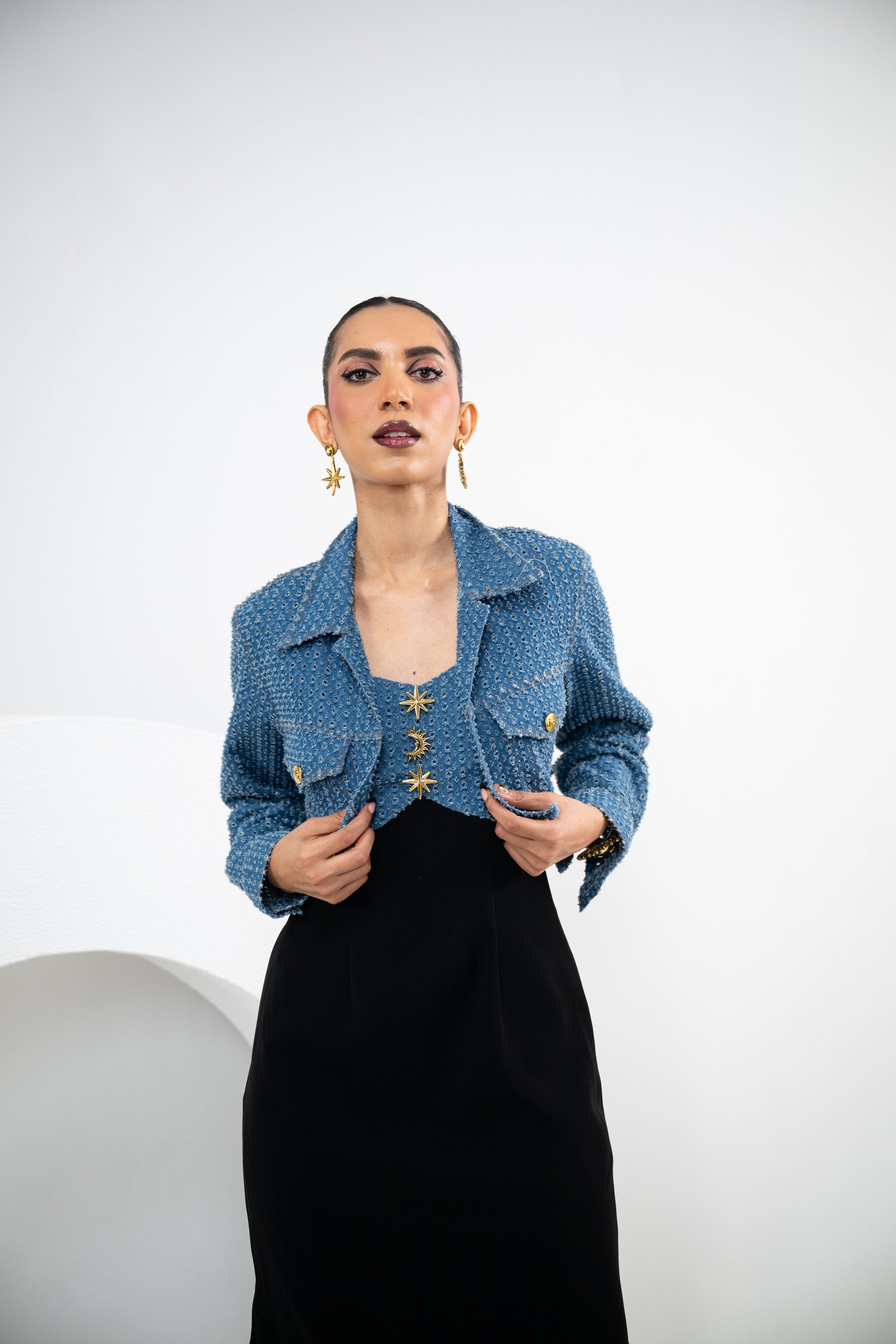 MOON STAR DOTTED DENIM DRESS PAIRED WITH DOTTED JACKET SET