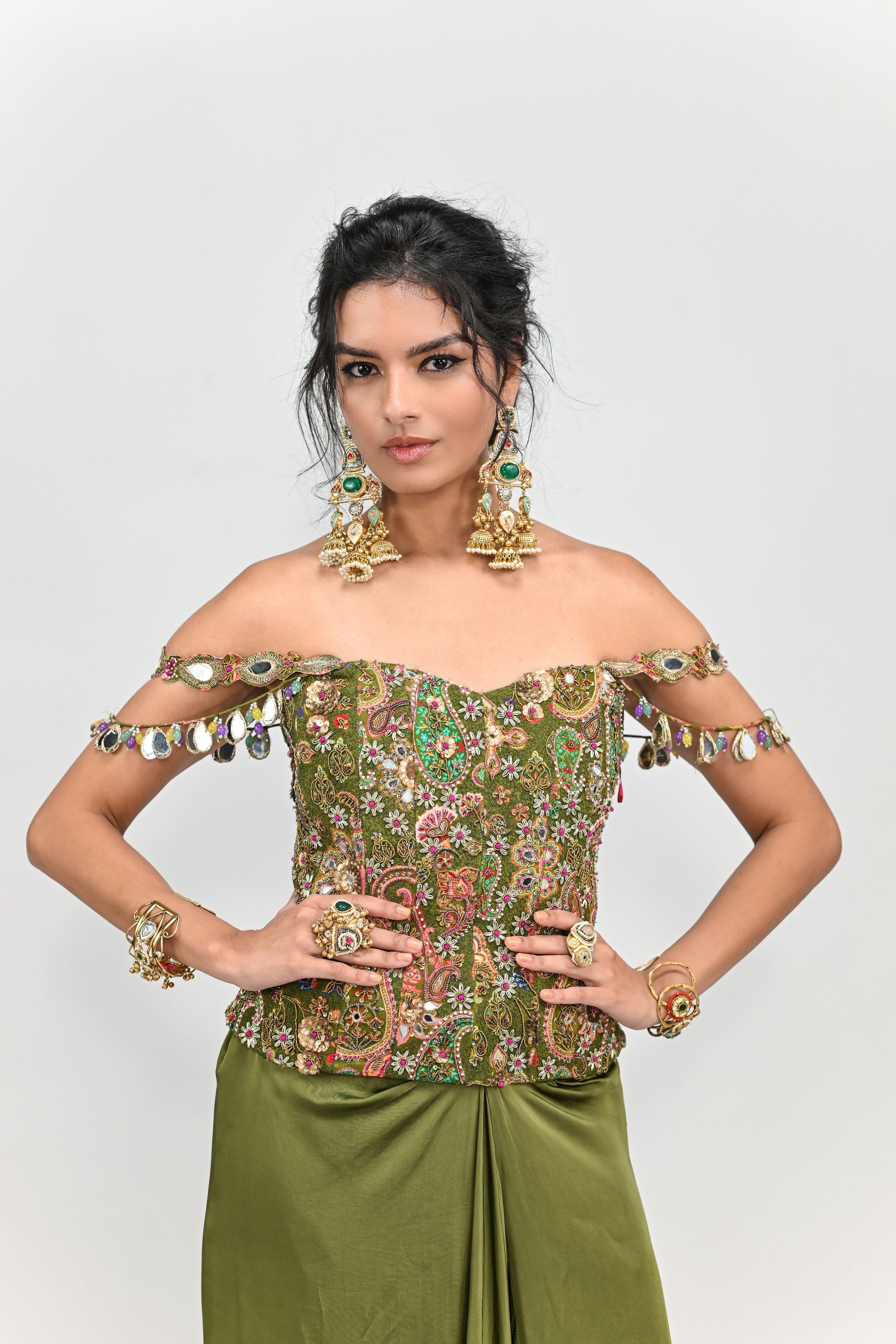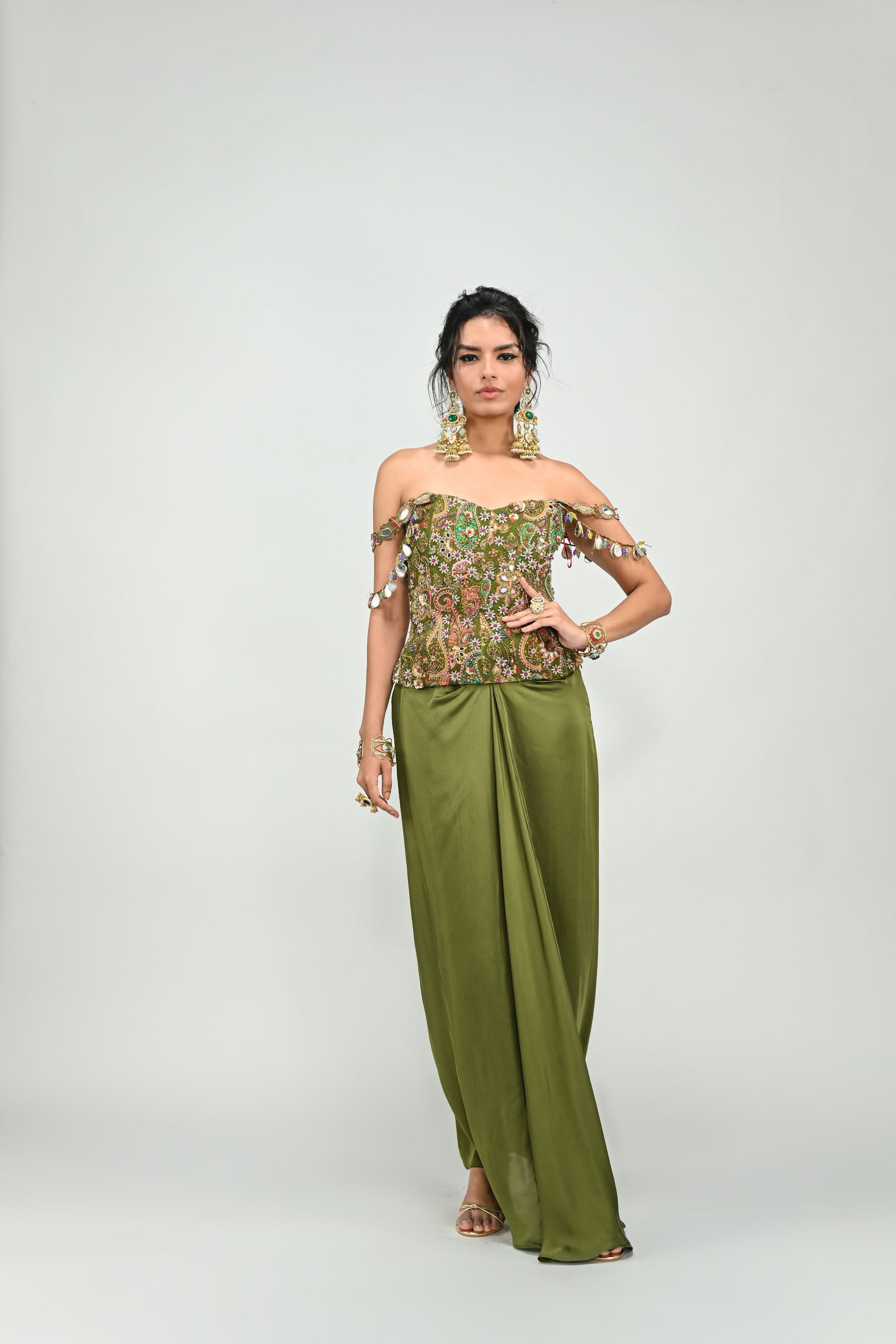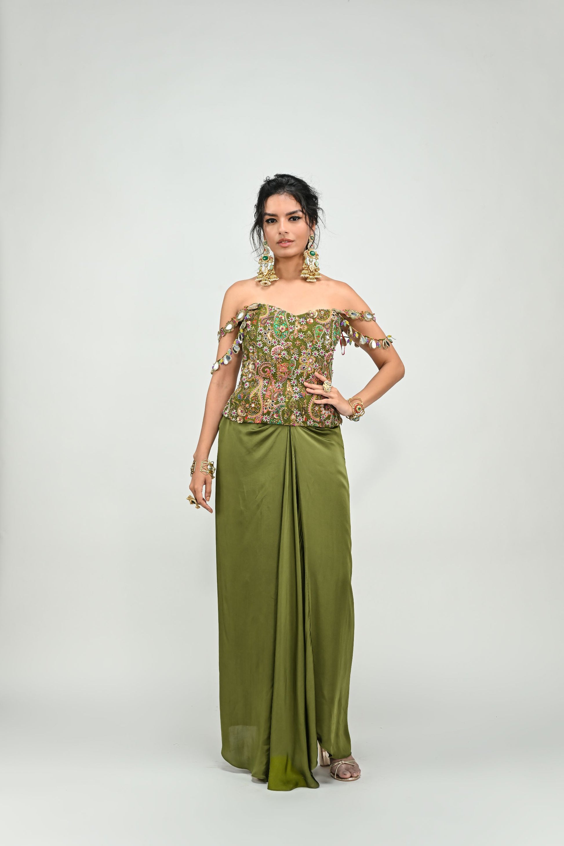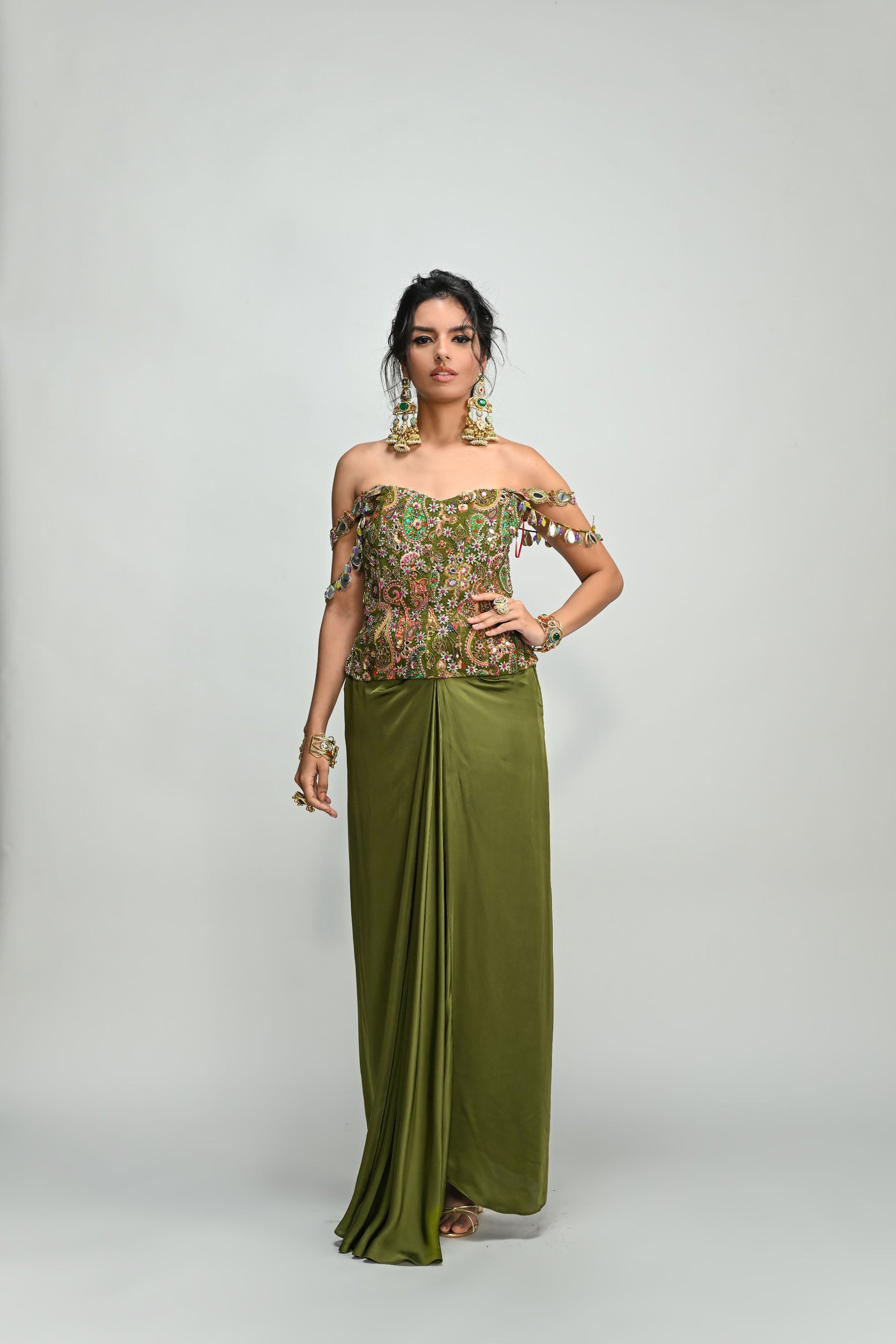 OLIVE BADLA EMBROIDERED CORSET PAIRED WITH OLIVE COWL SKIRT