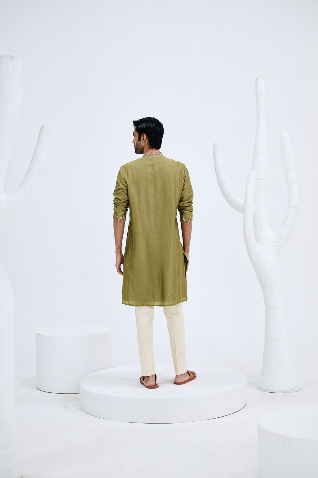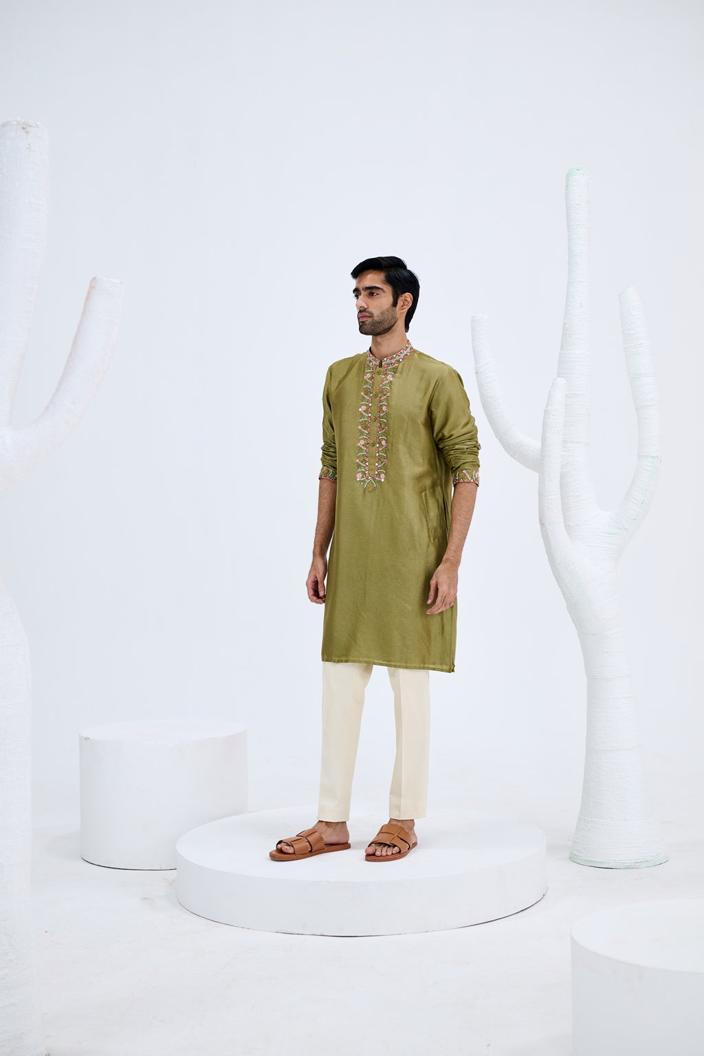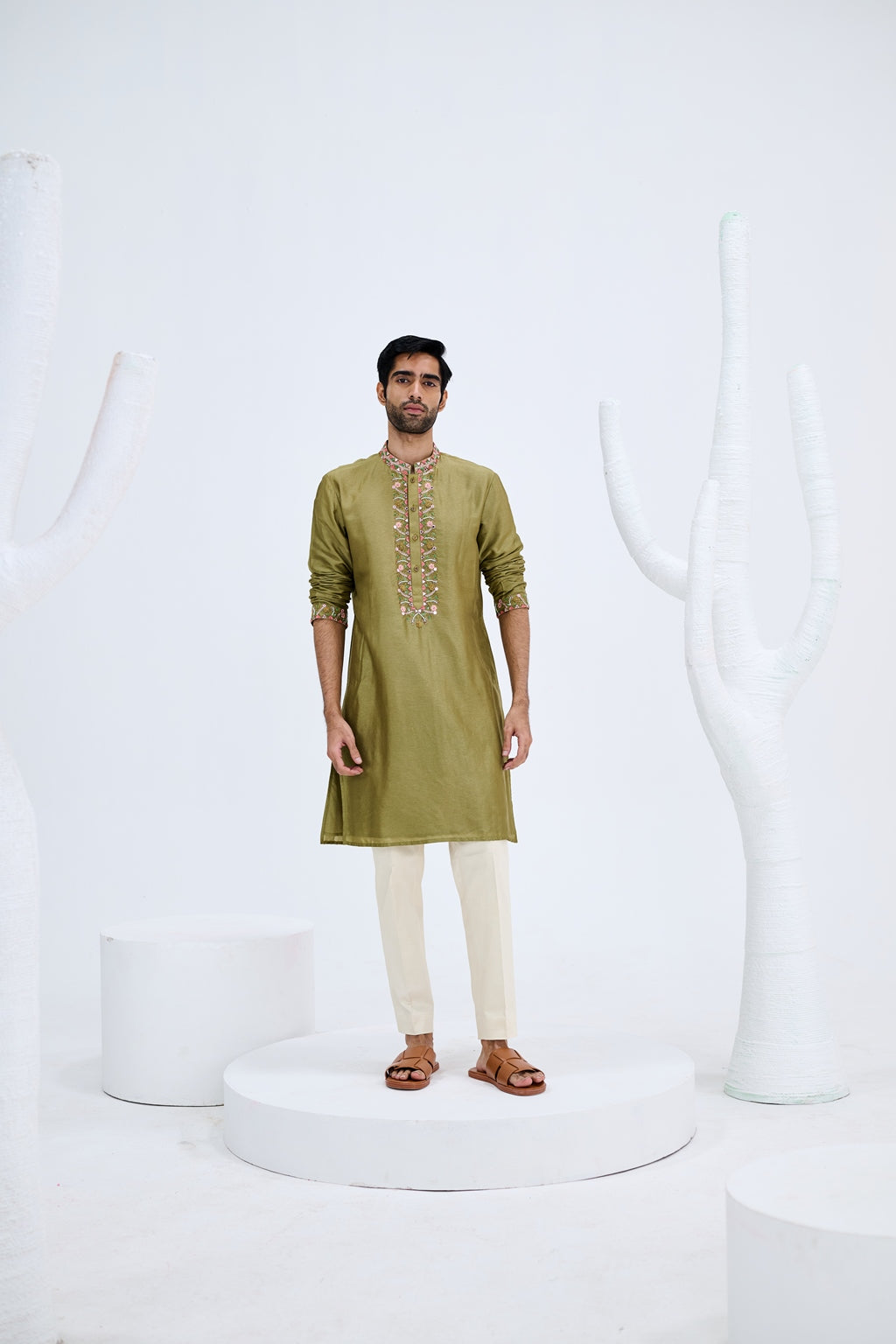 OLIVE GREEN EMBROIDERED KURTA SET WITH WHITE PANTS