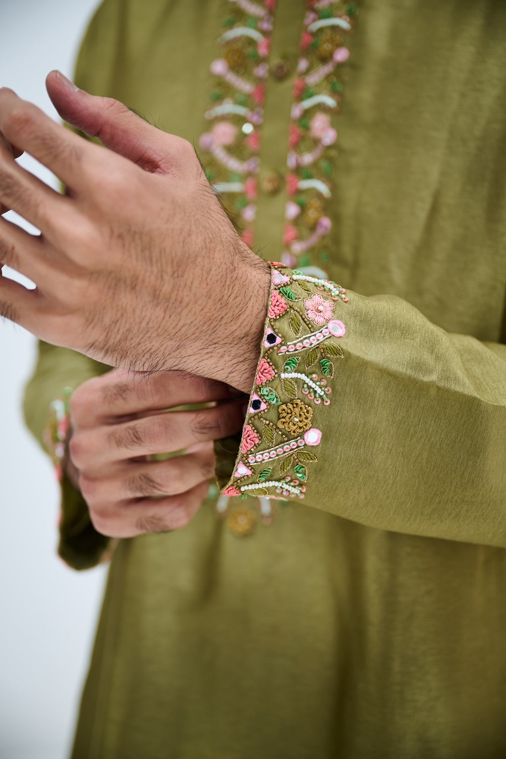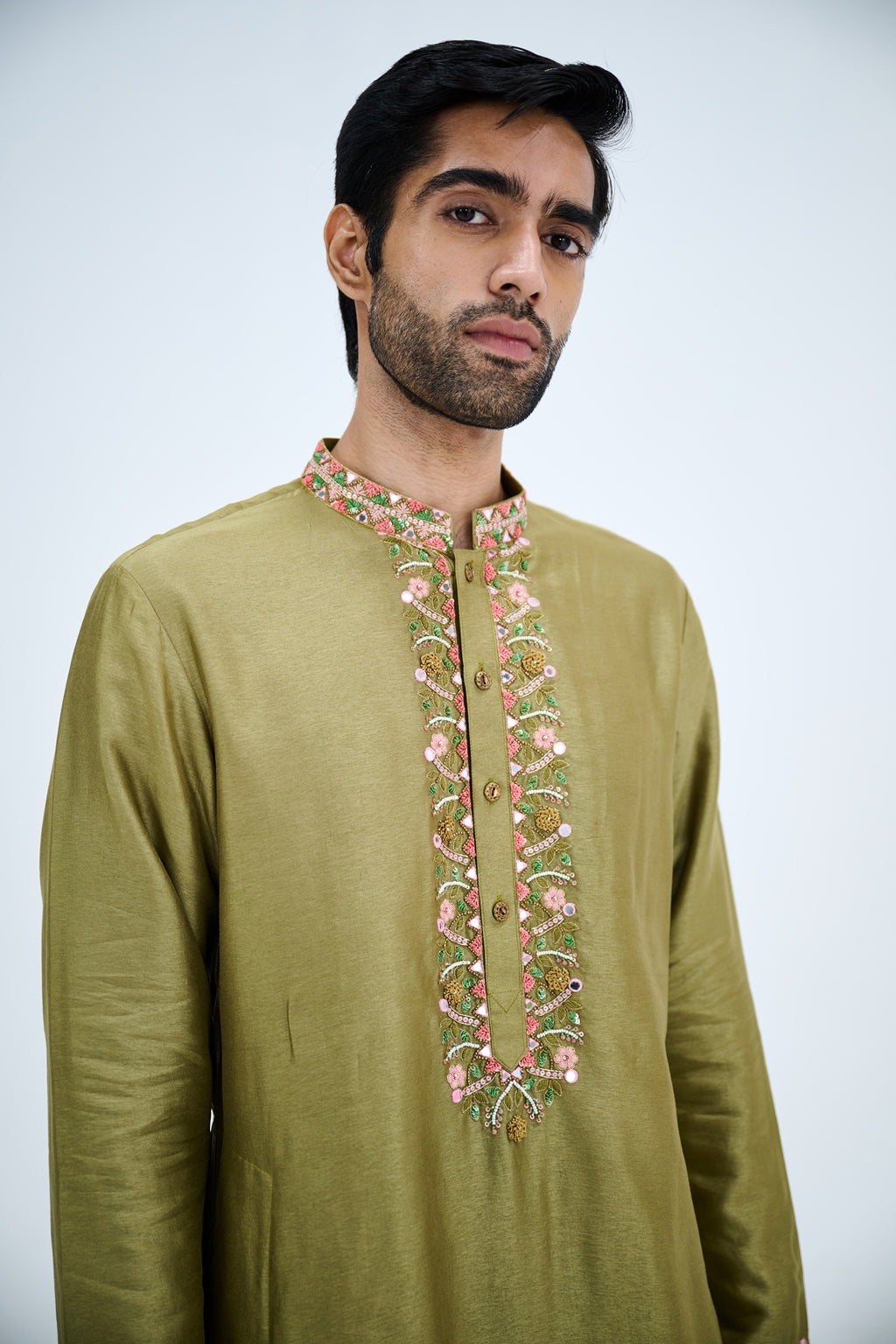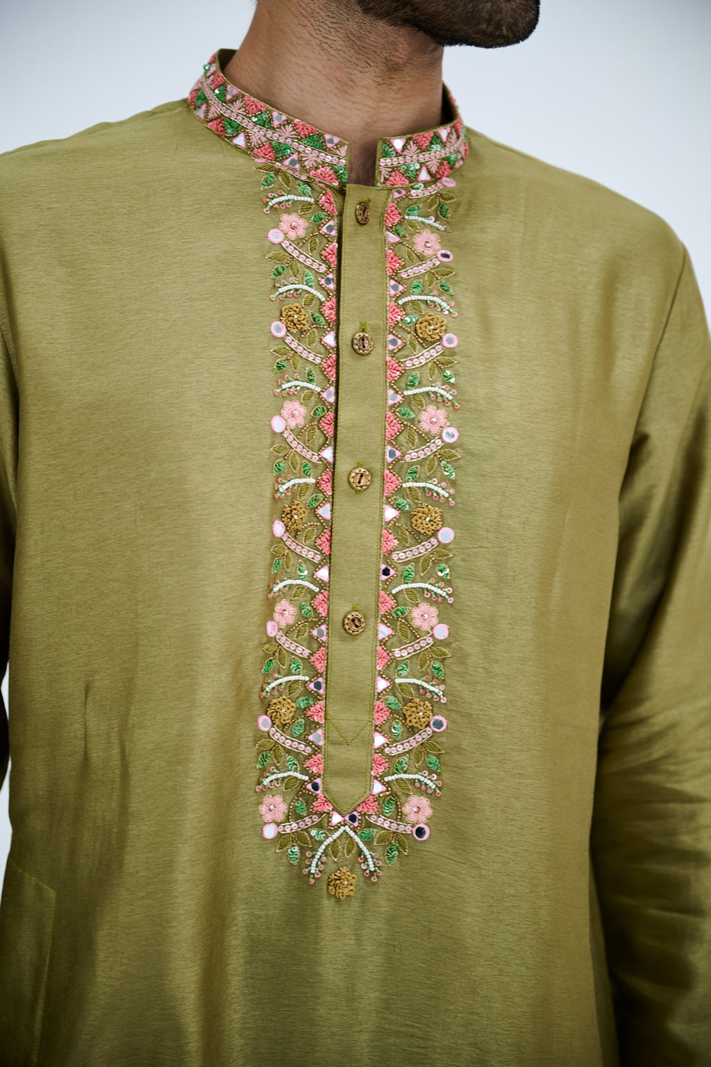 OLIVE GREEN EMBROIDERED KURTA SET WITH WHITE PANTS