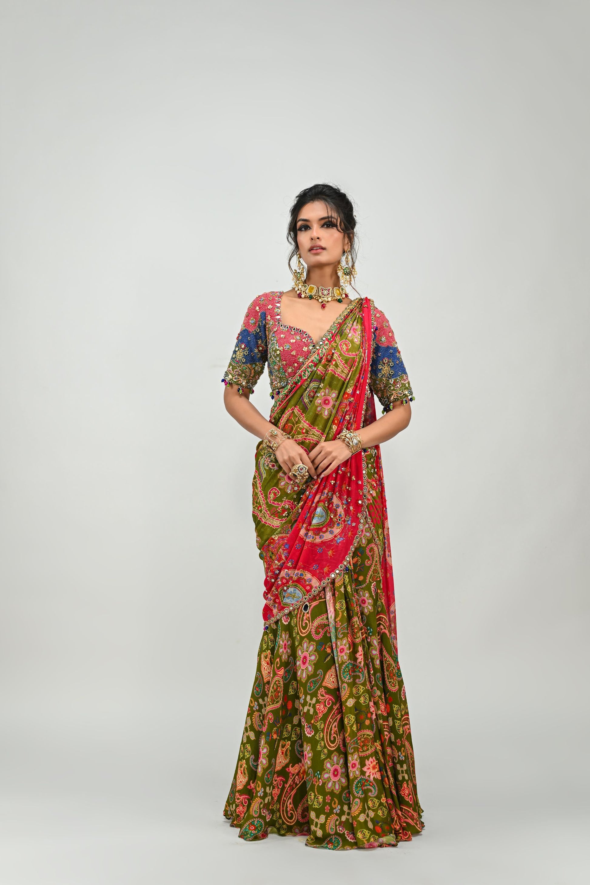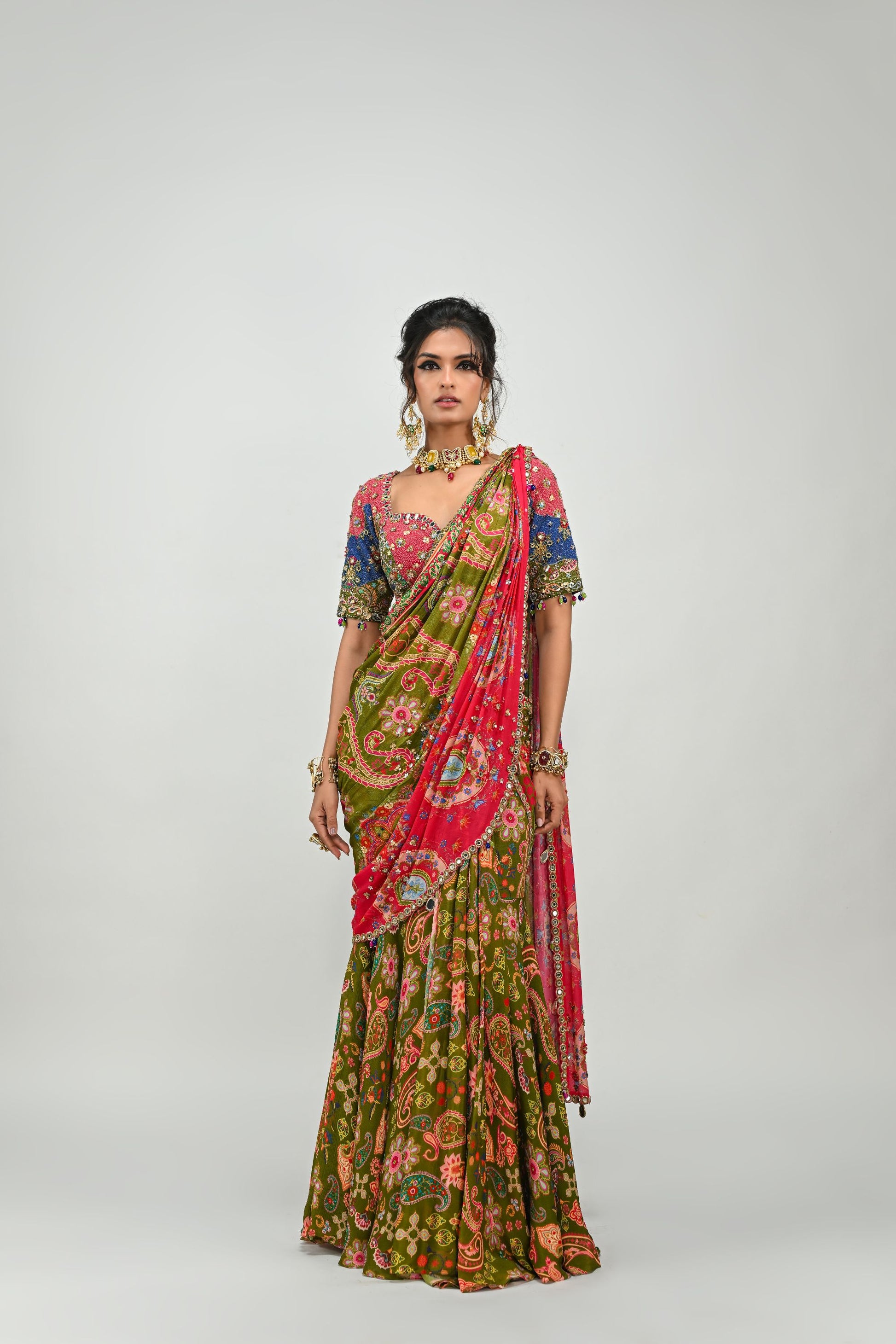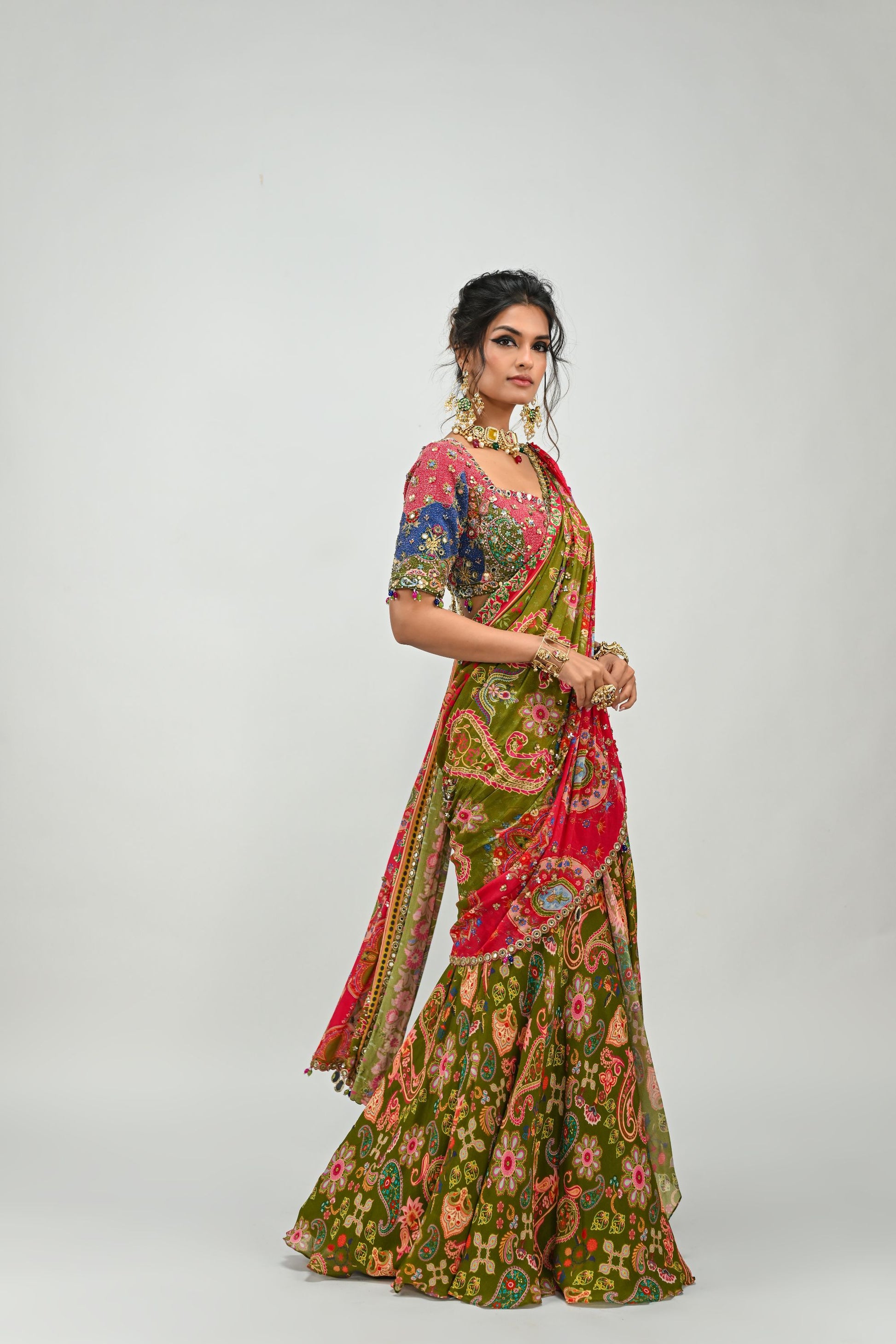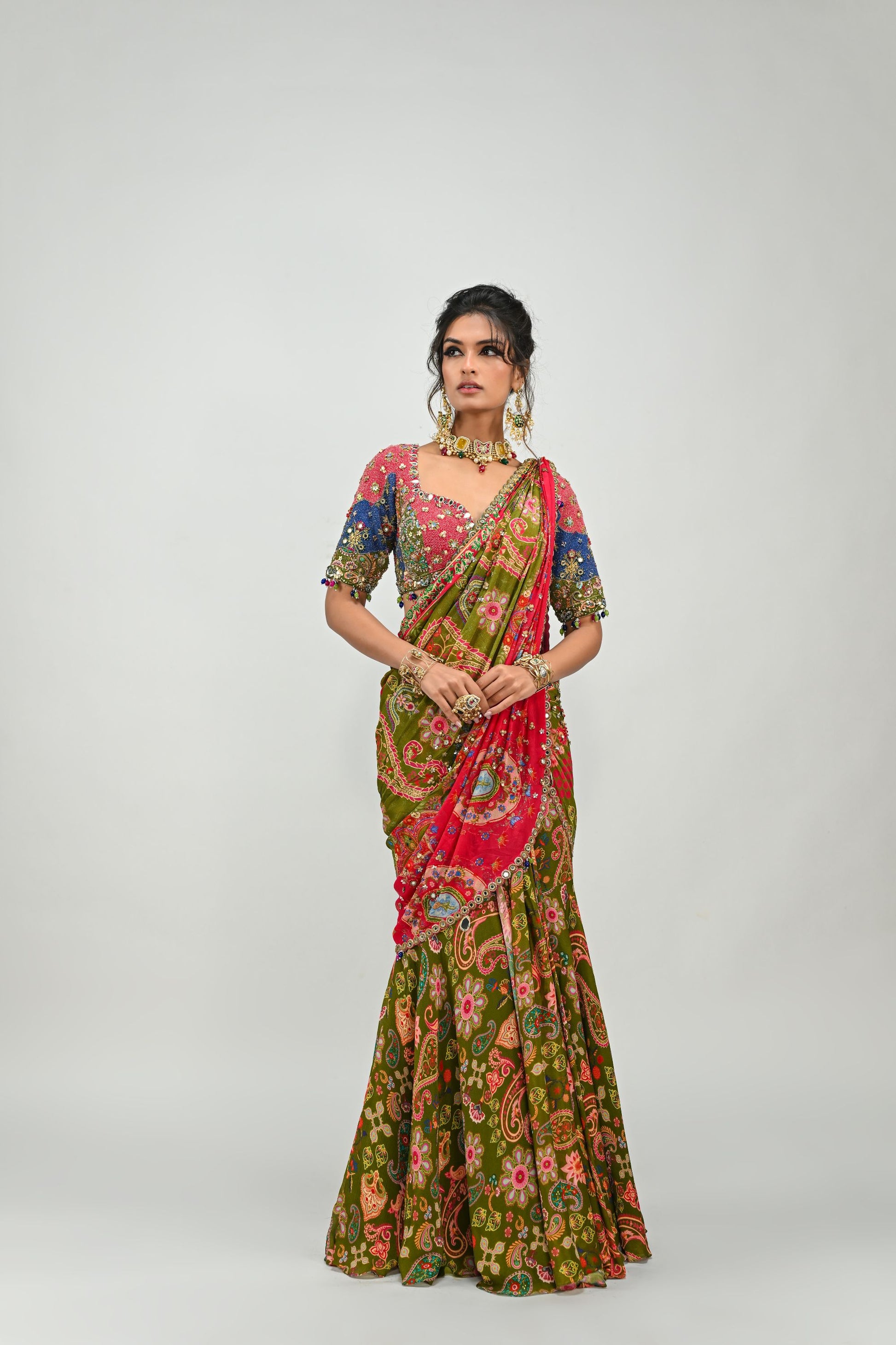 OLIVE HIGHLIGHTED DUAL PRESTITCHED SAREE PAIRED WITH PATCH BLOUSE
