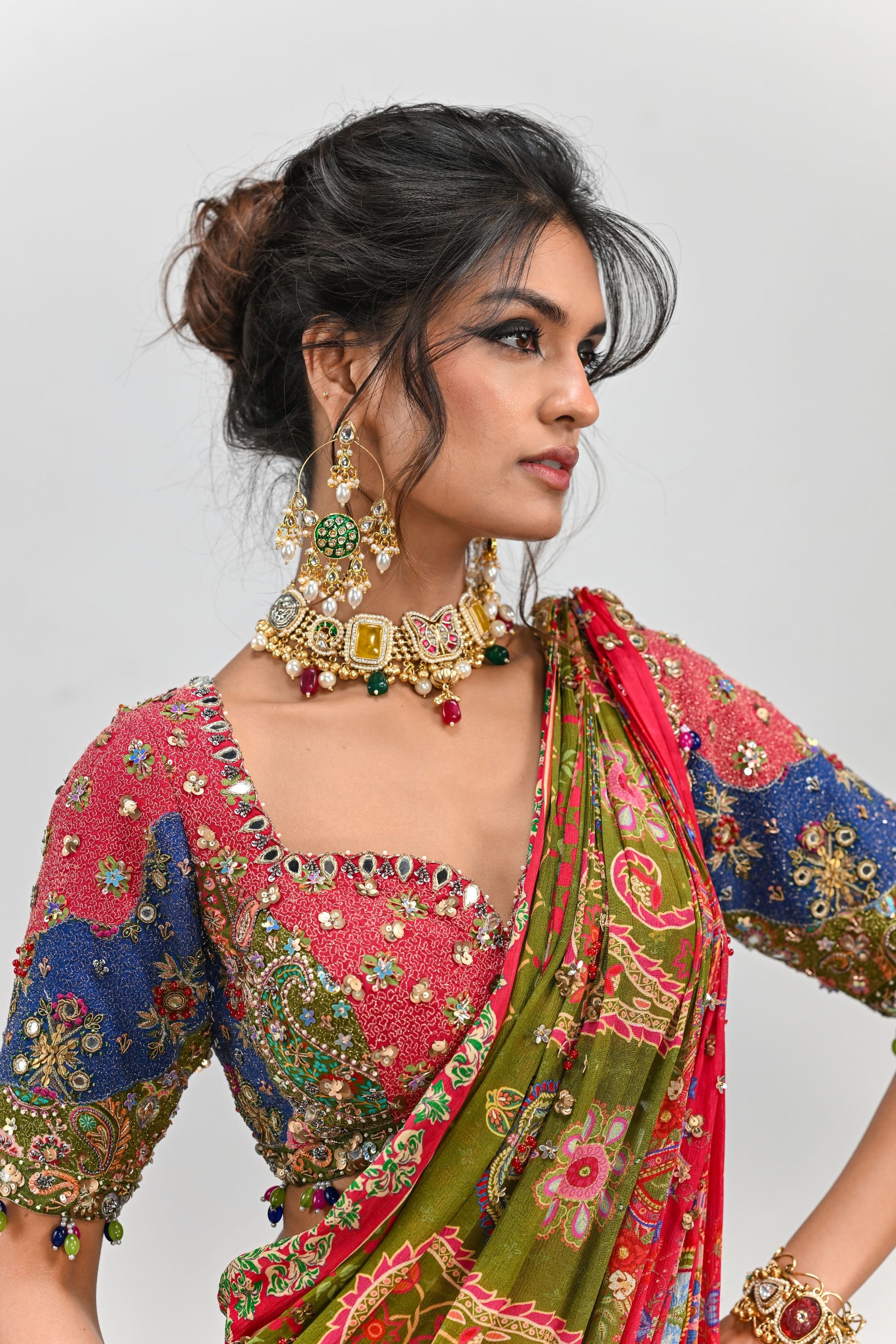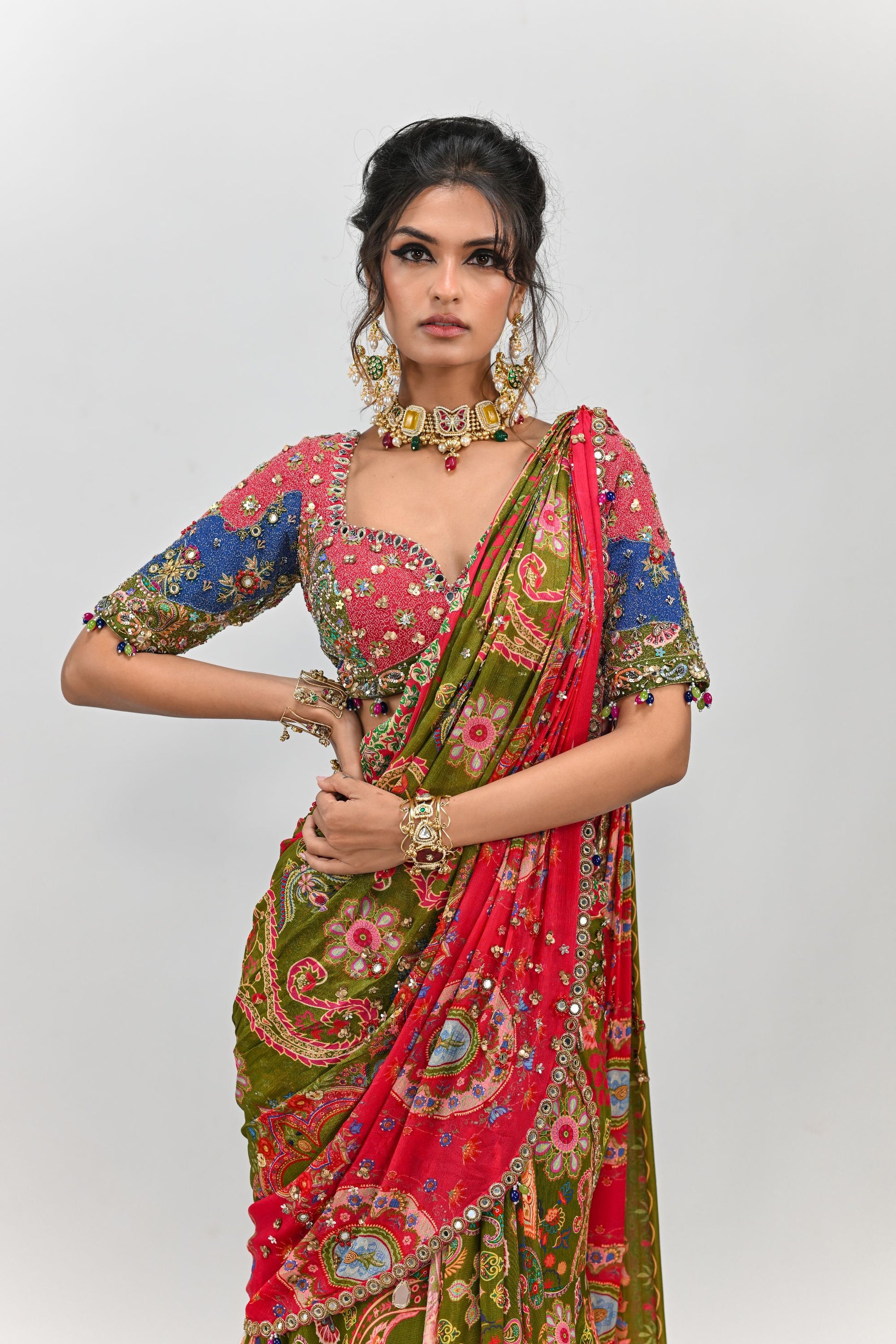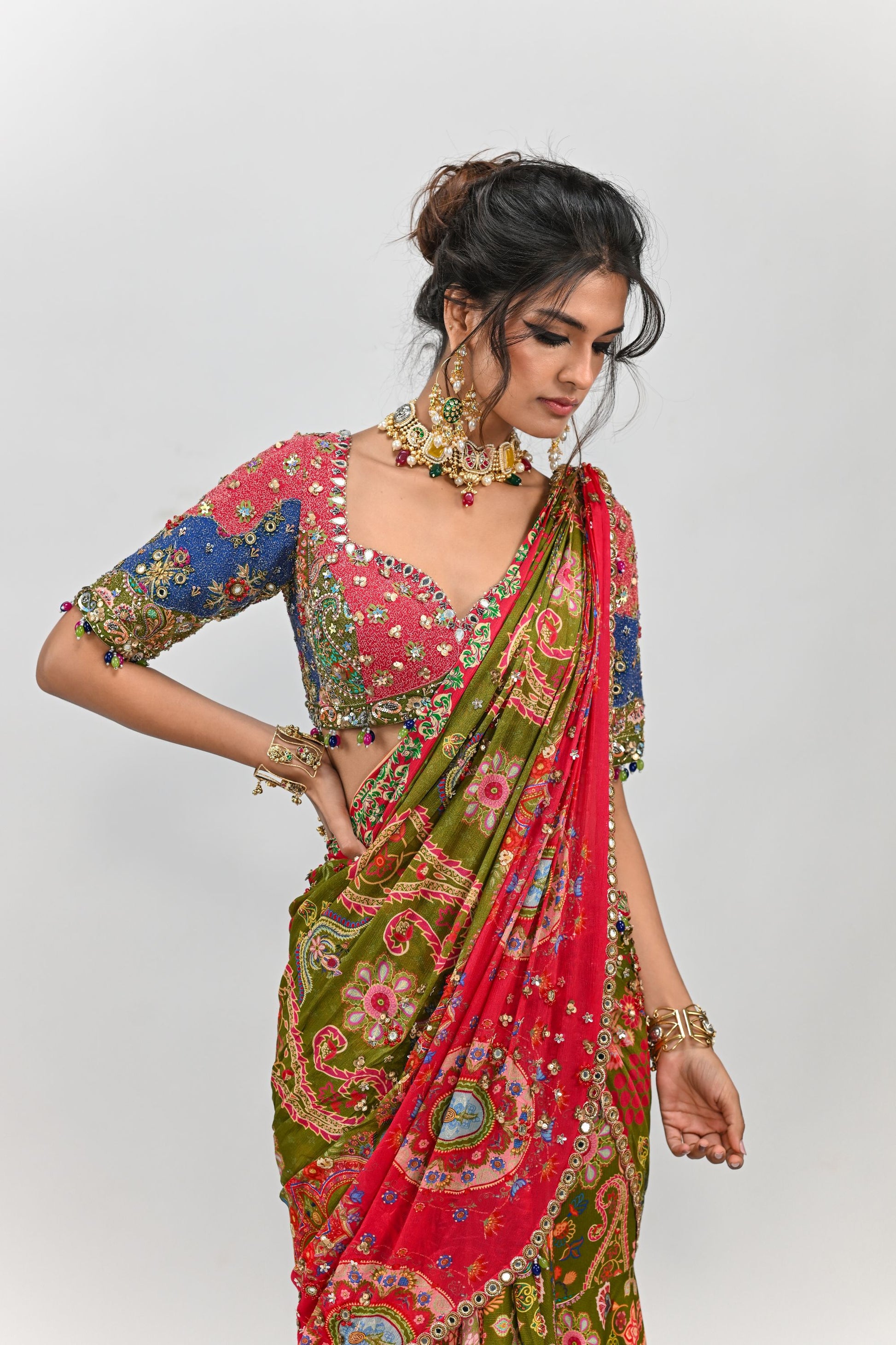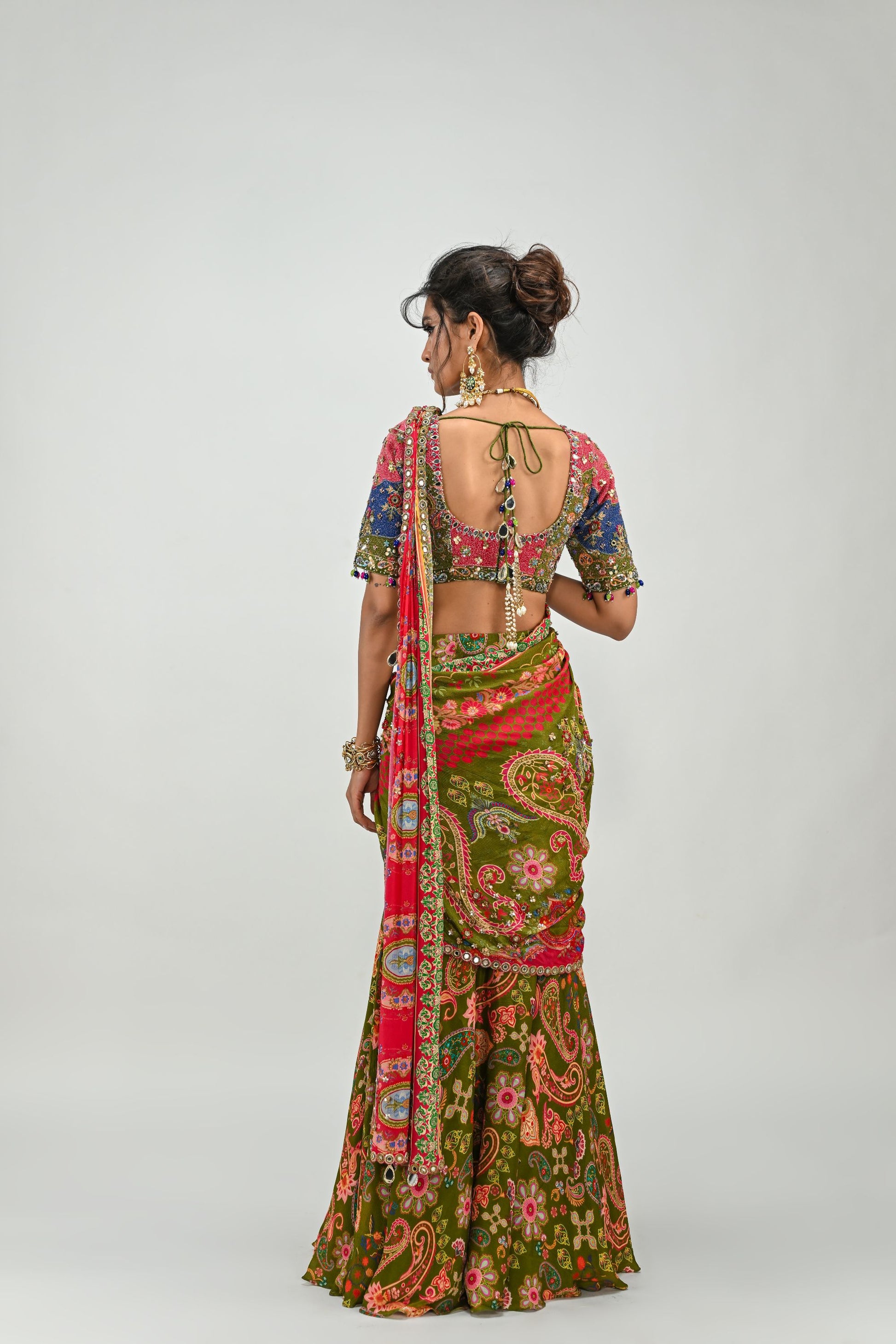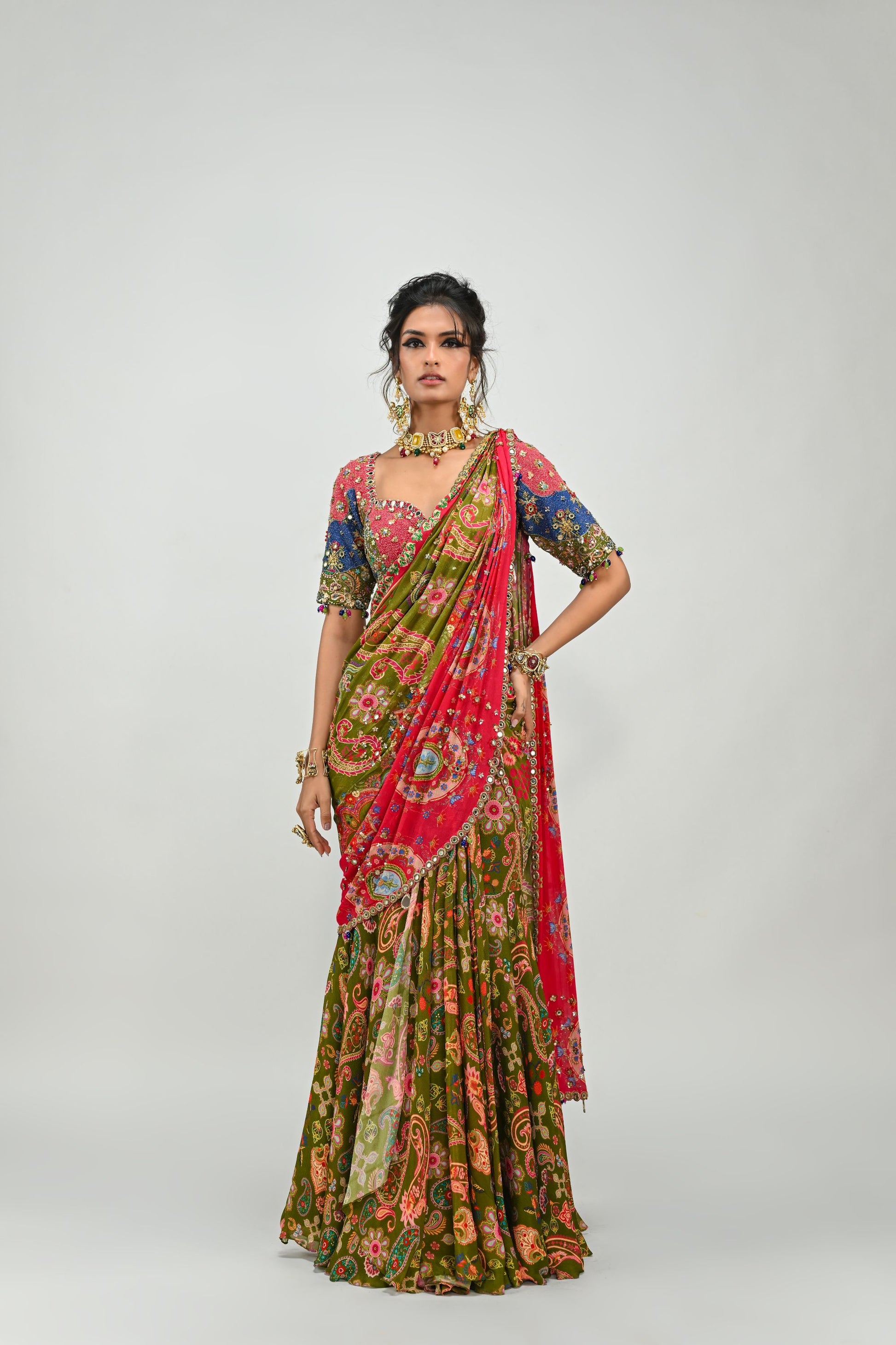 OLIVE HIGHLIGHTED DUAL PRESTITCHED SAREE PAIRED WITH PATCH BLOUSE