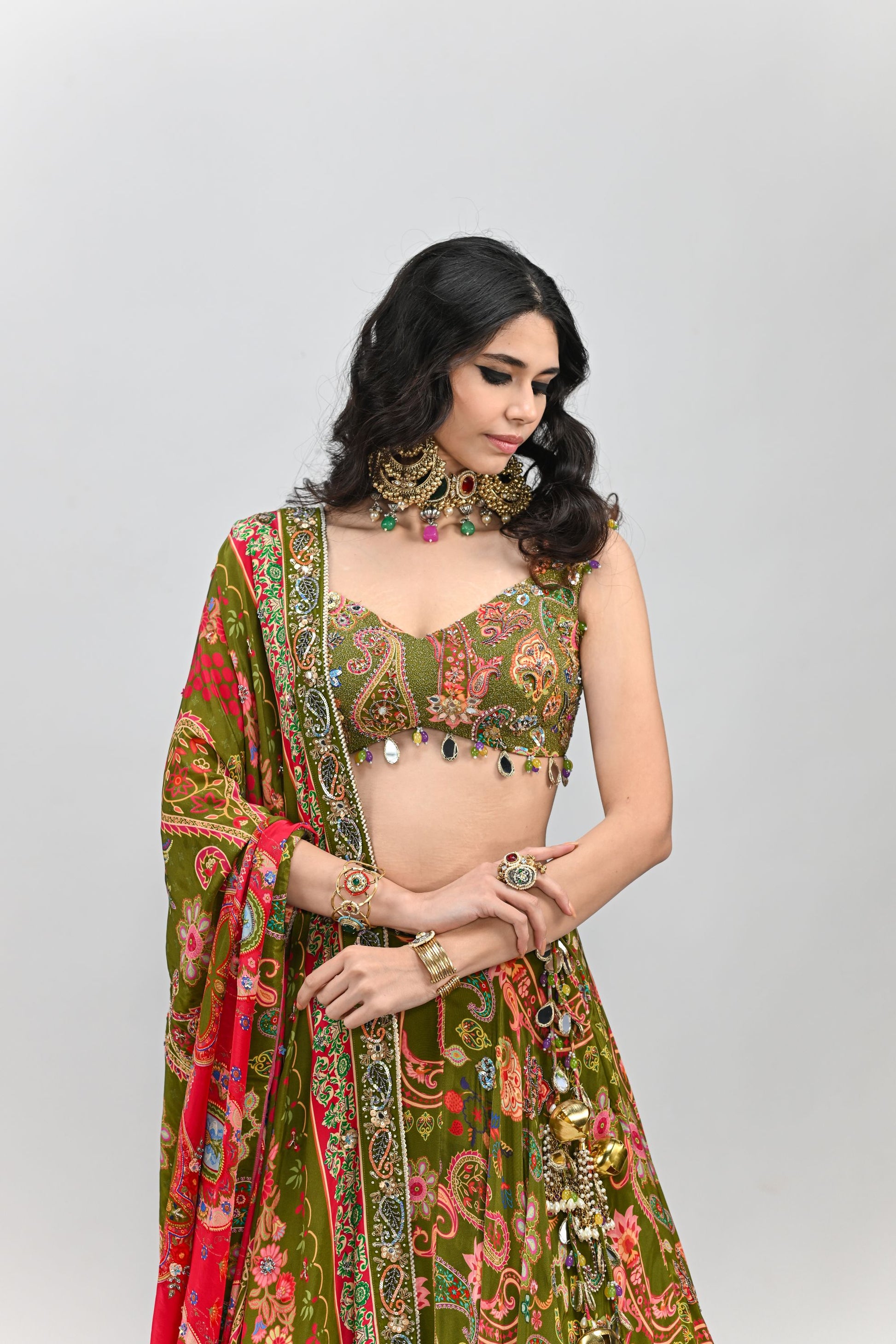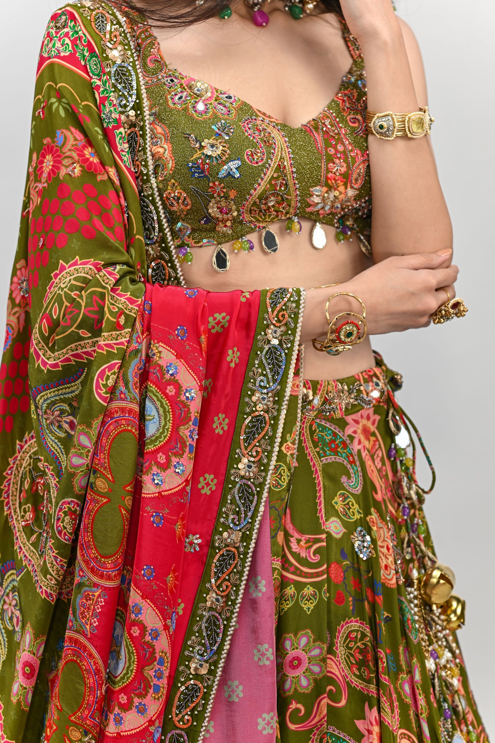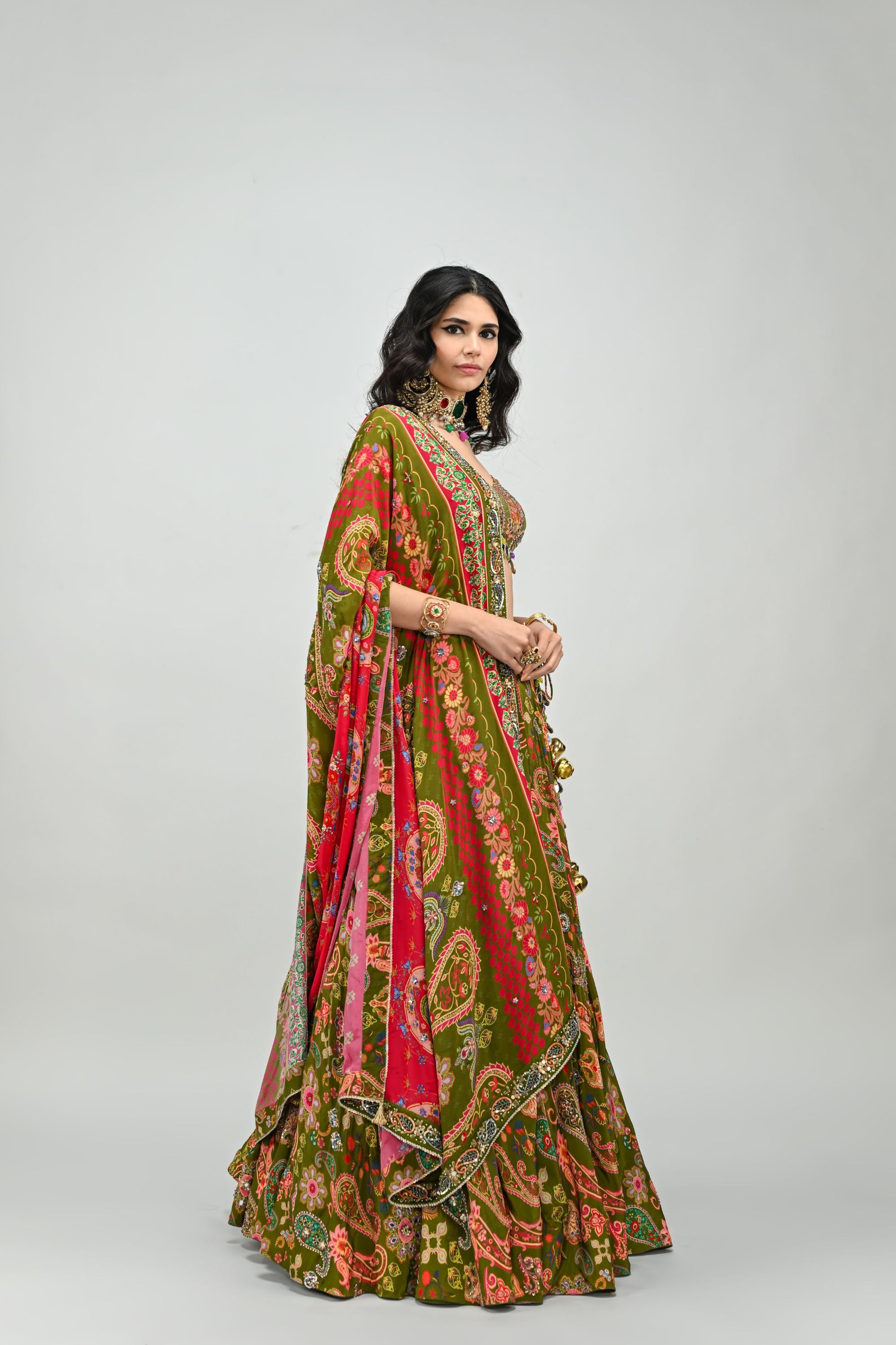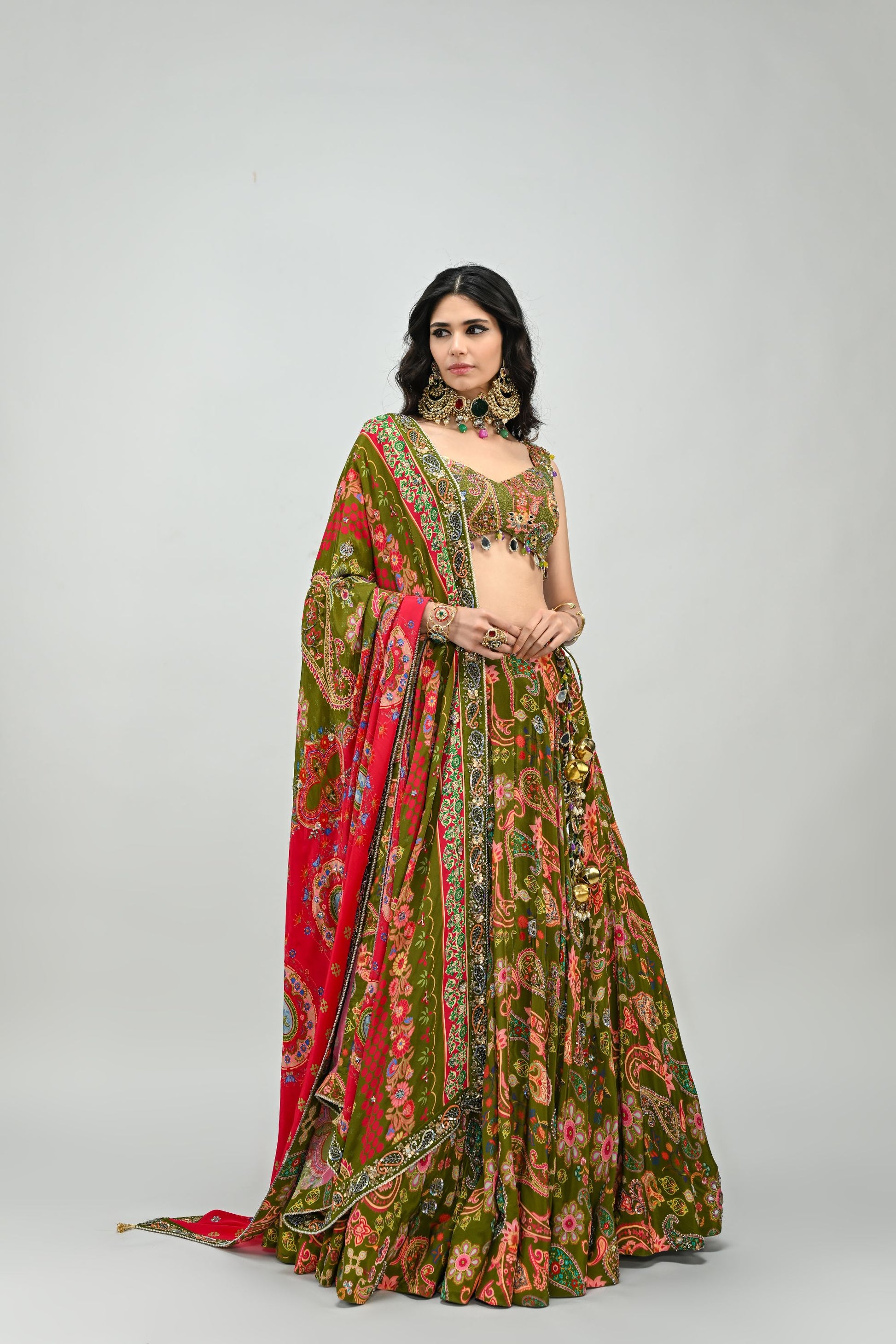 OLIVE HIGHLIGHTED LEHENGA PAIRED WITH BADLA EMBROIDERED OLIVE BLOUSE AND DUAL PRINT HIGHLIGHTED DUPATTA