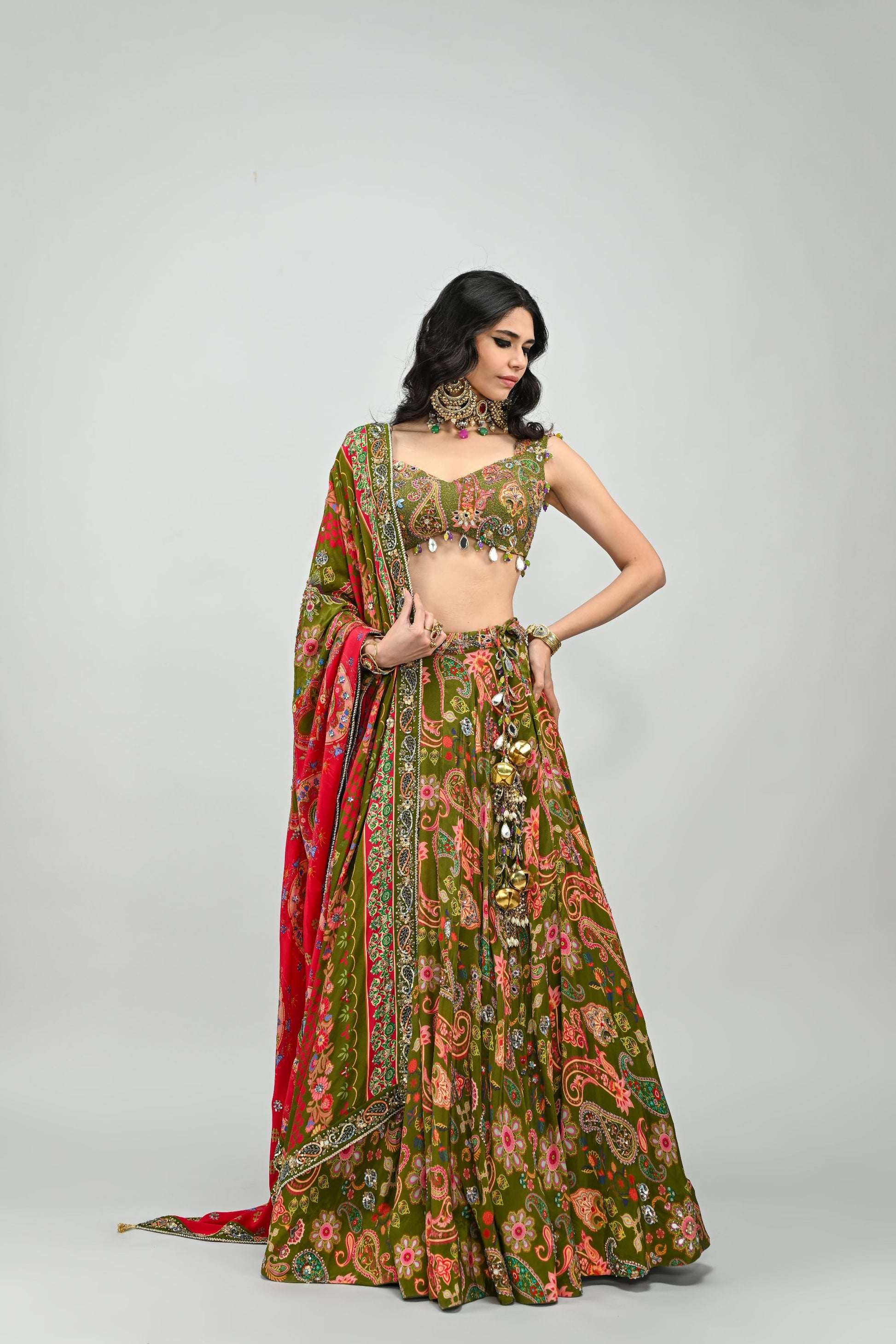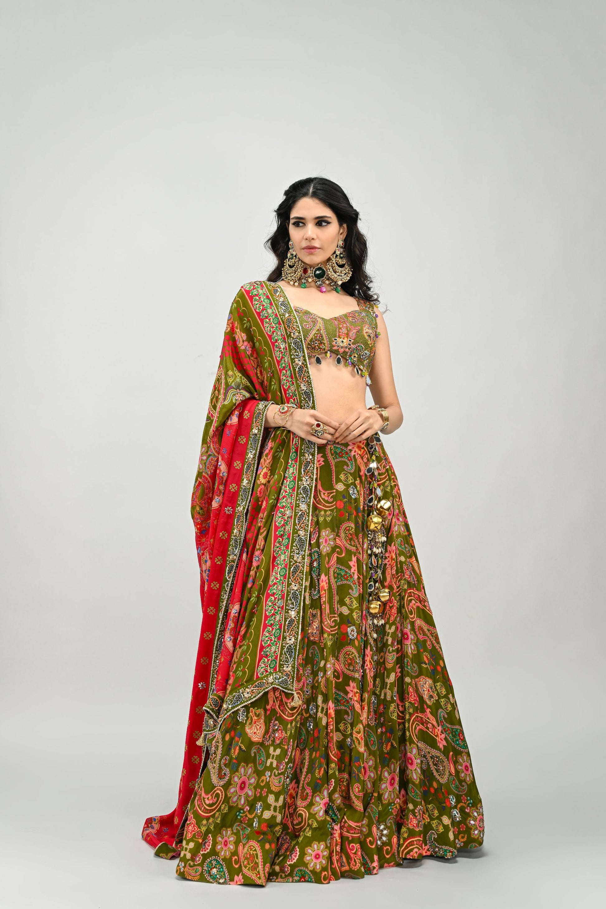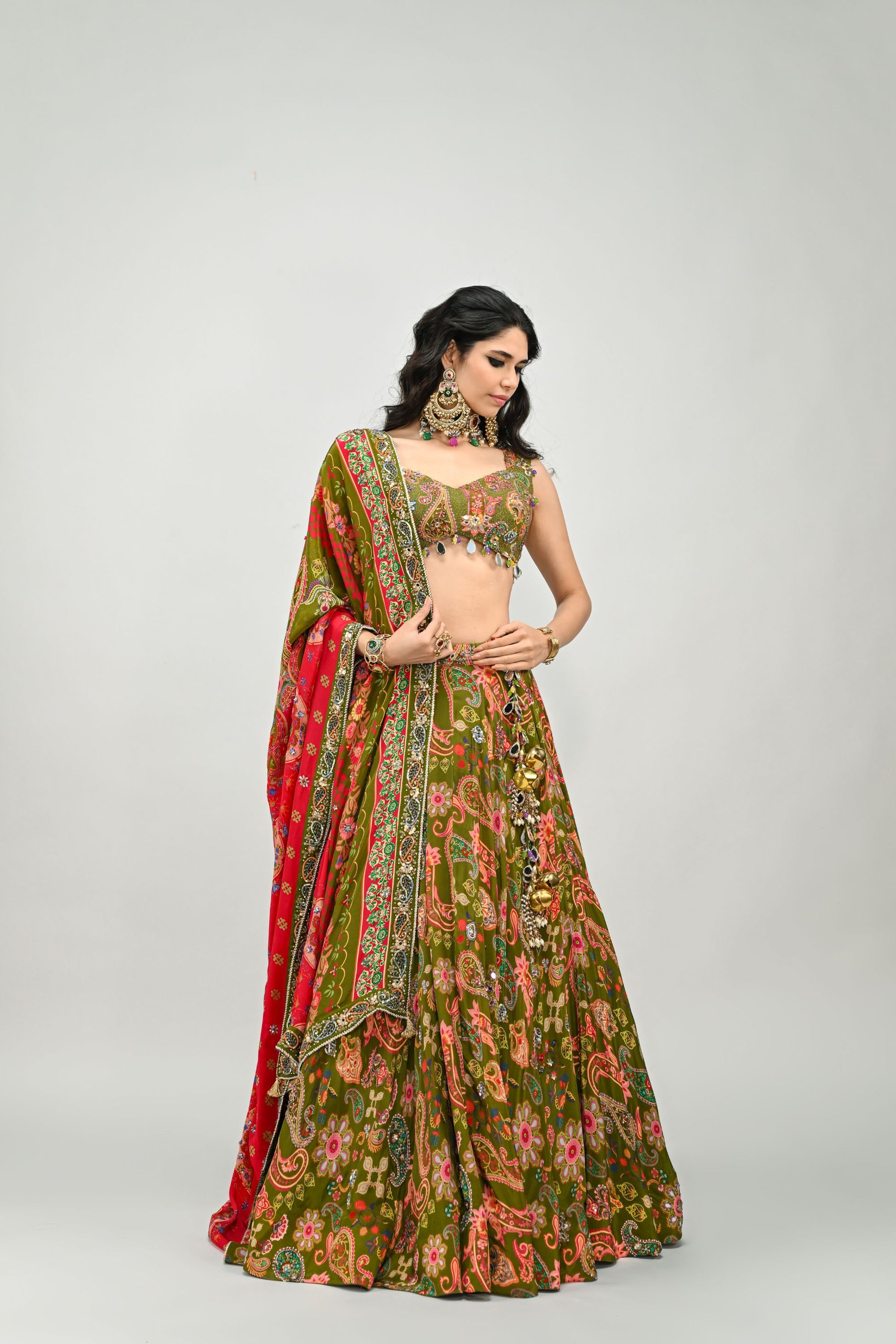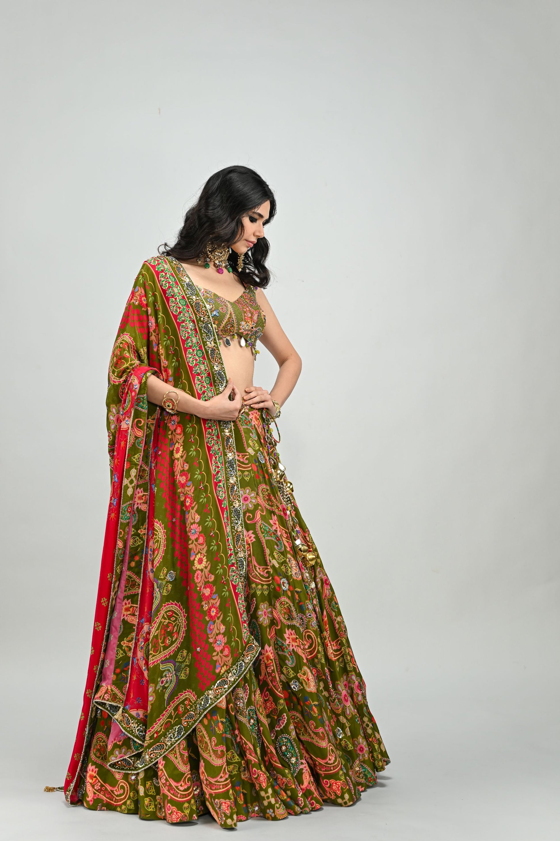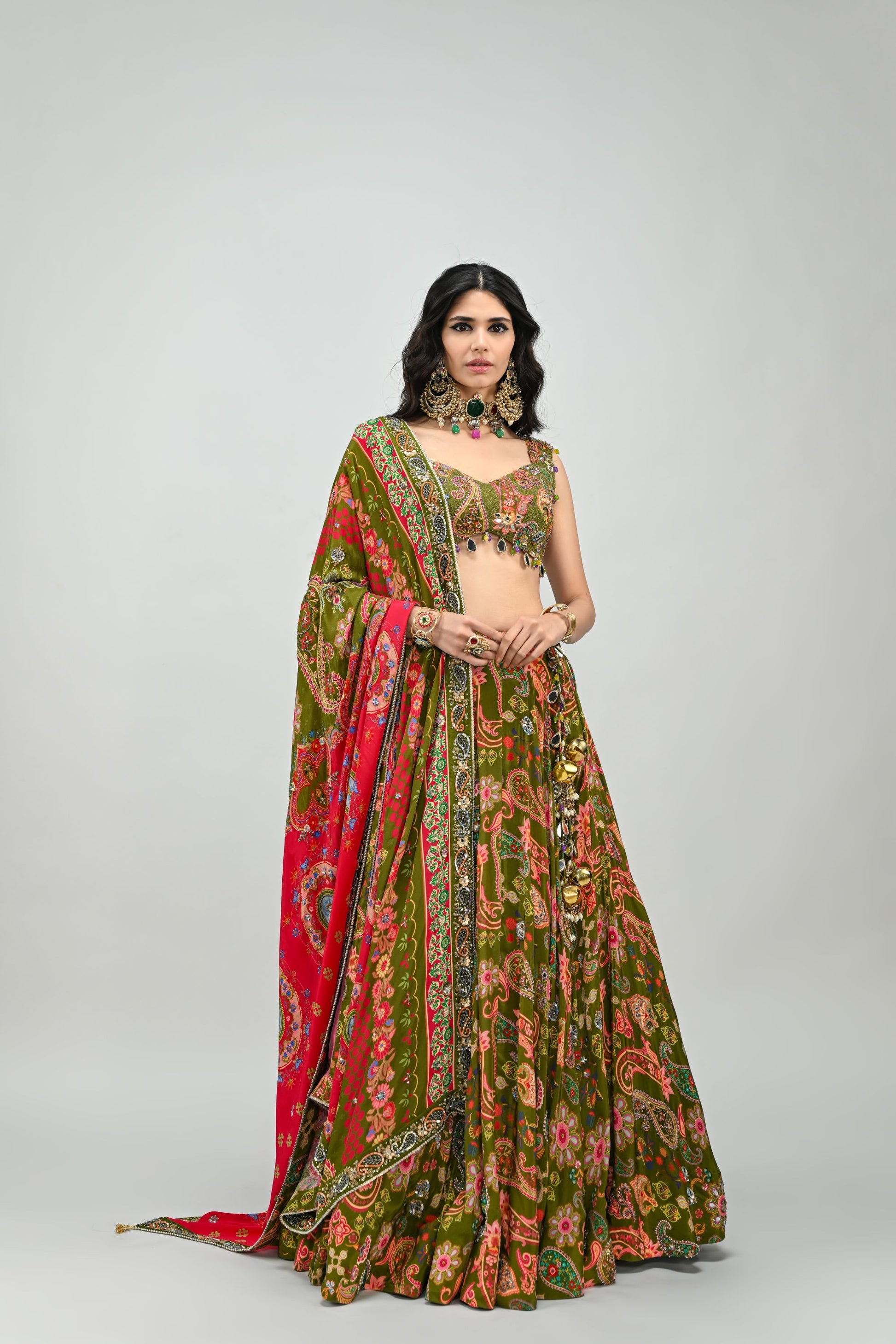 OLIVE HIGHLIGHTED LEHENGA PAIRED WITH BADLA EMBROIDERED OLIVE BLOUSE AND DUAL PRINT HIGHLIGHTED DUPATTA
