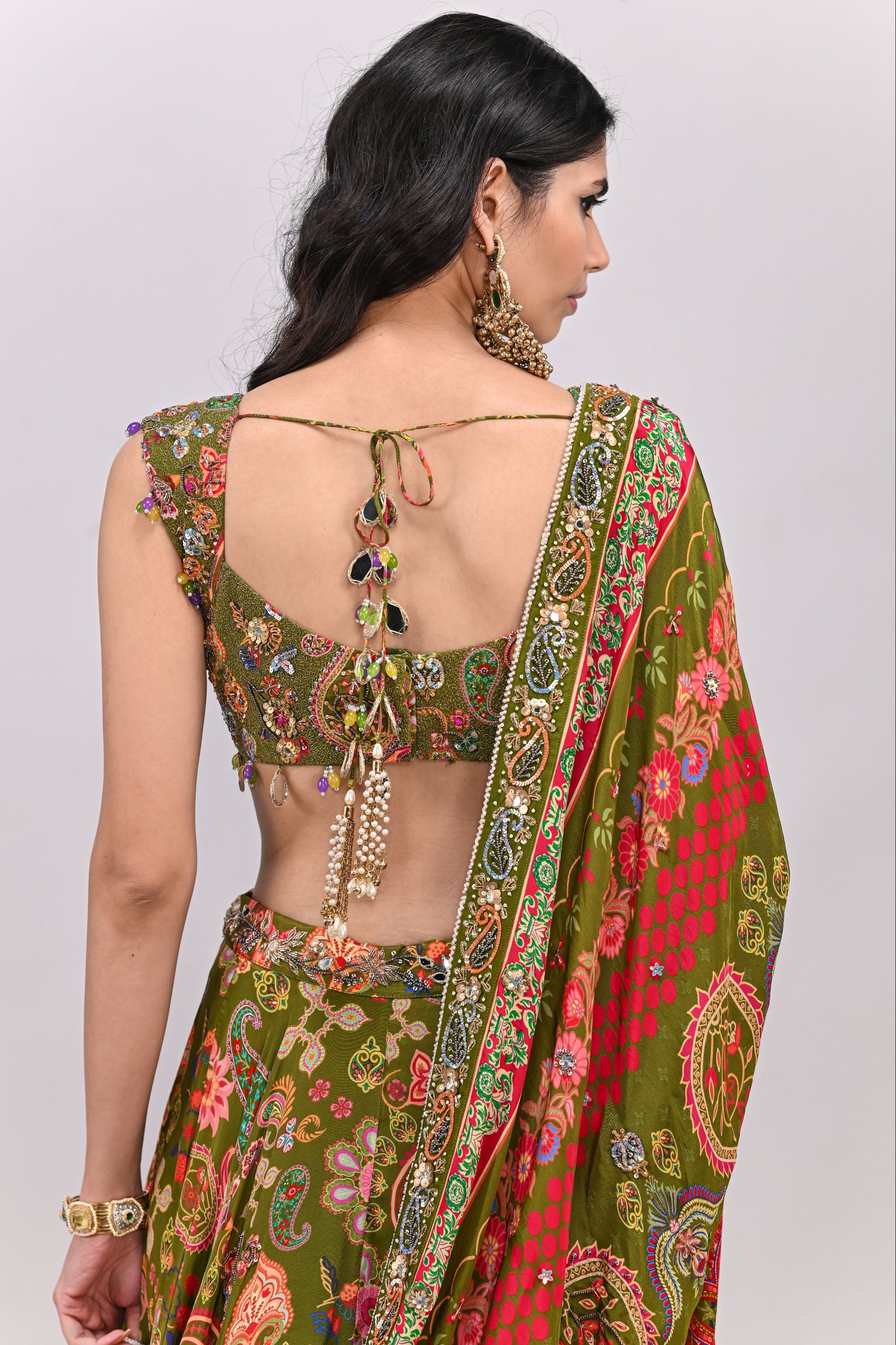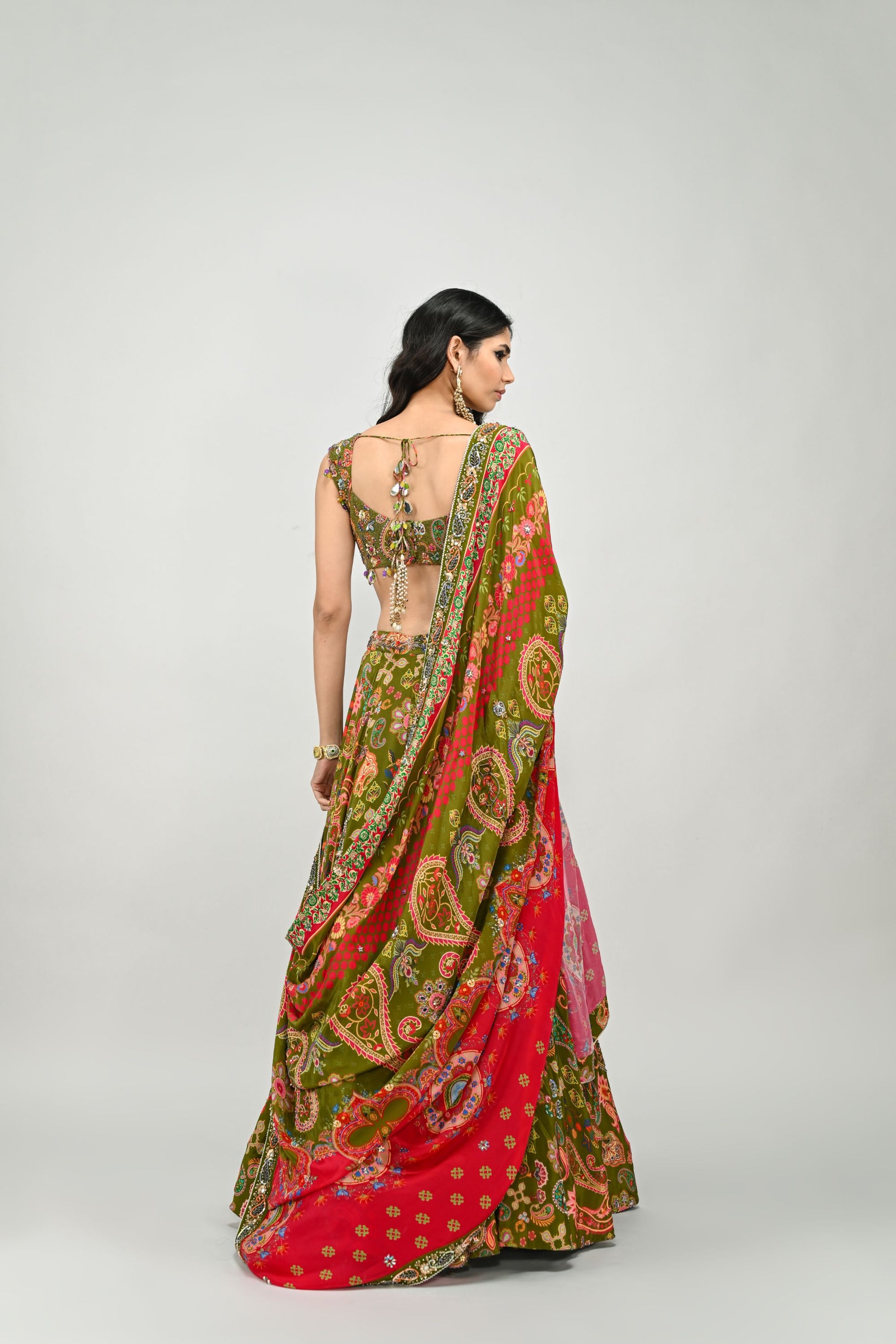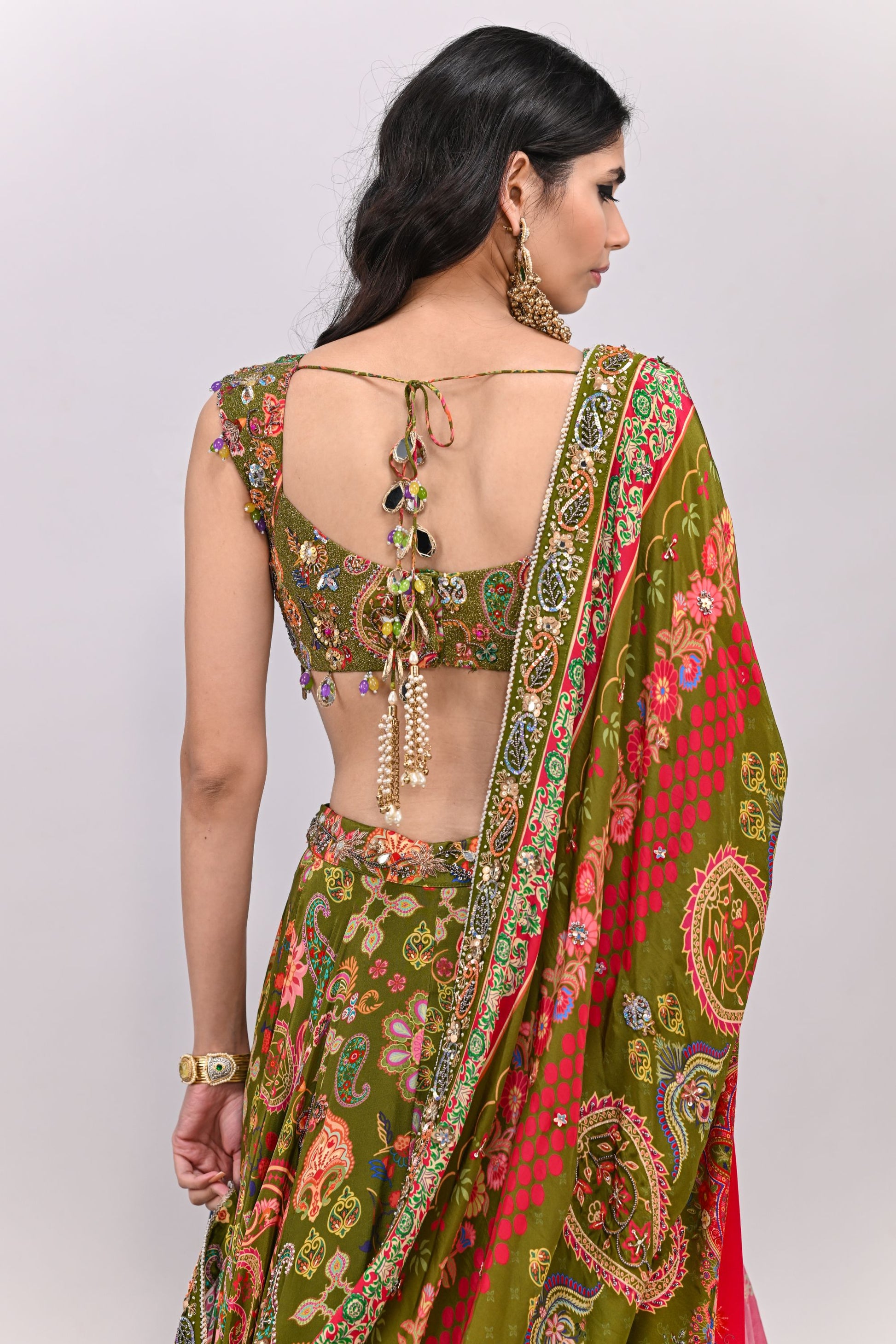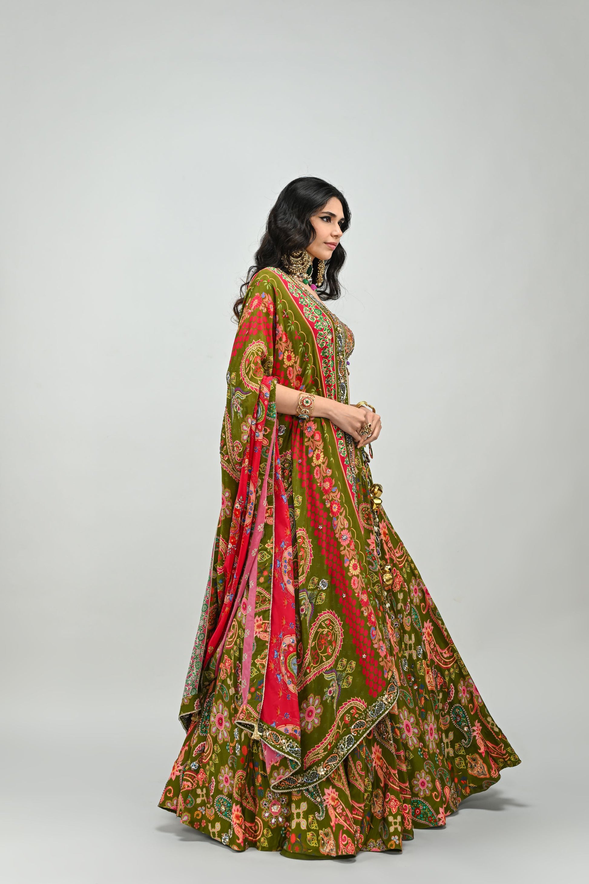 OLIVE HIGHLIGHTED LEHENGA PAIRED WITH BADLA EMBROIDERED OLIVE BLOUSE AND DUAL PRINT HIGHLIGHTED DUPATTA