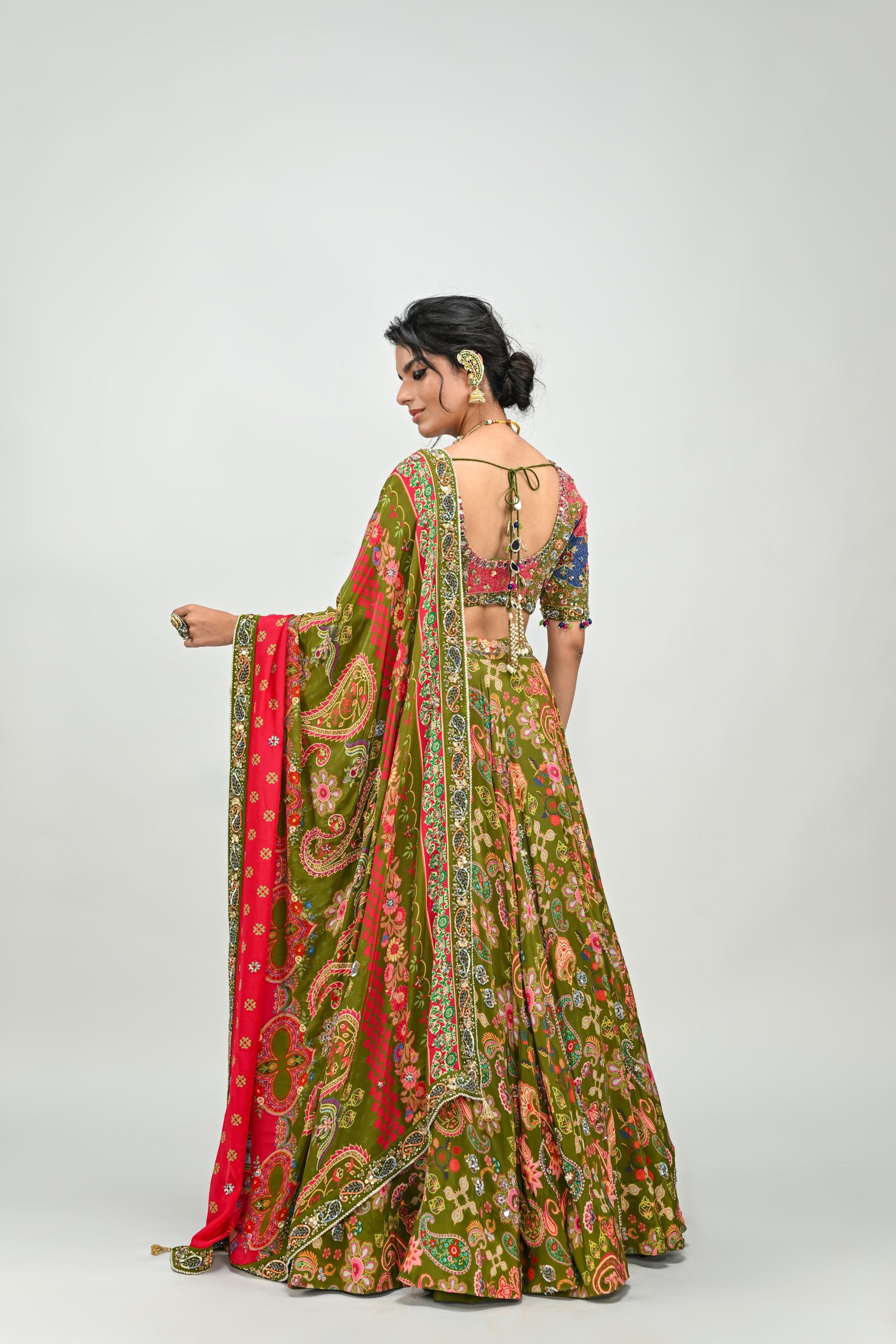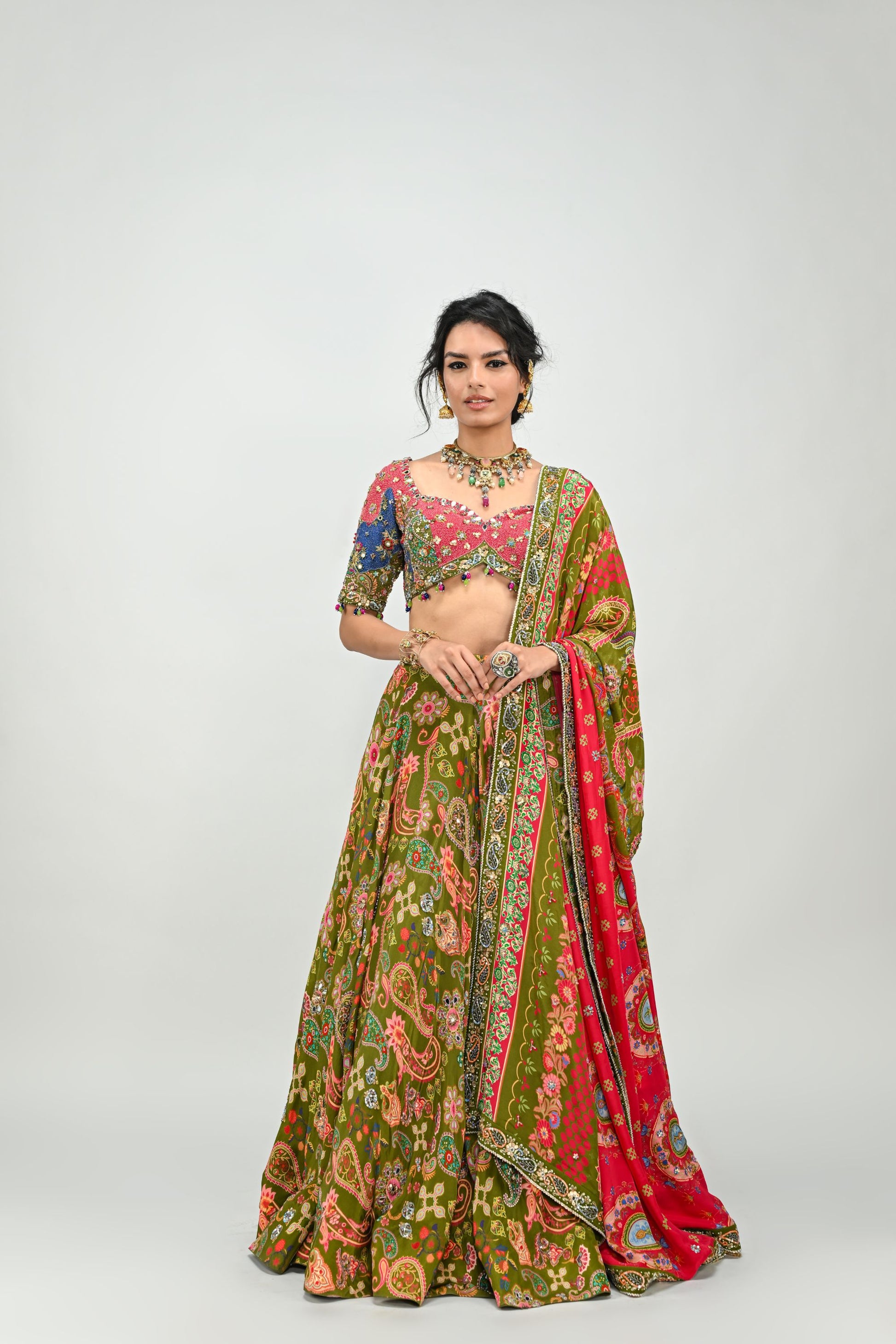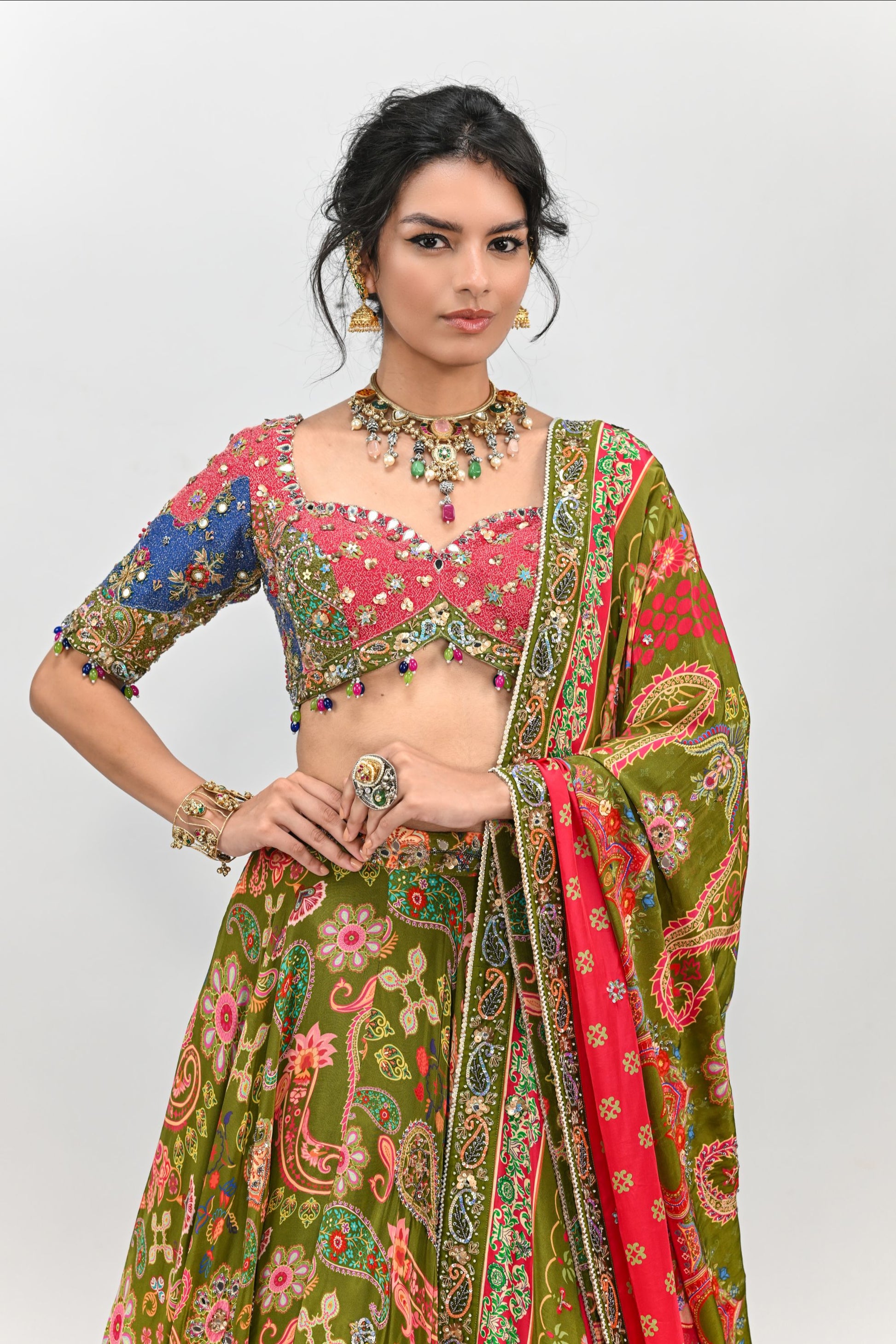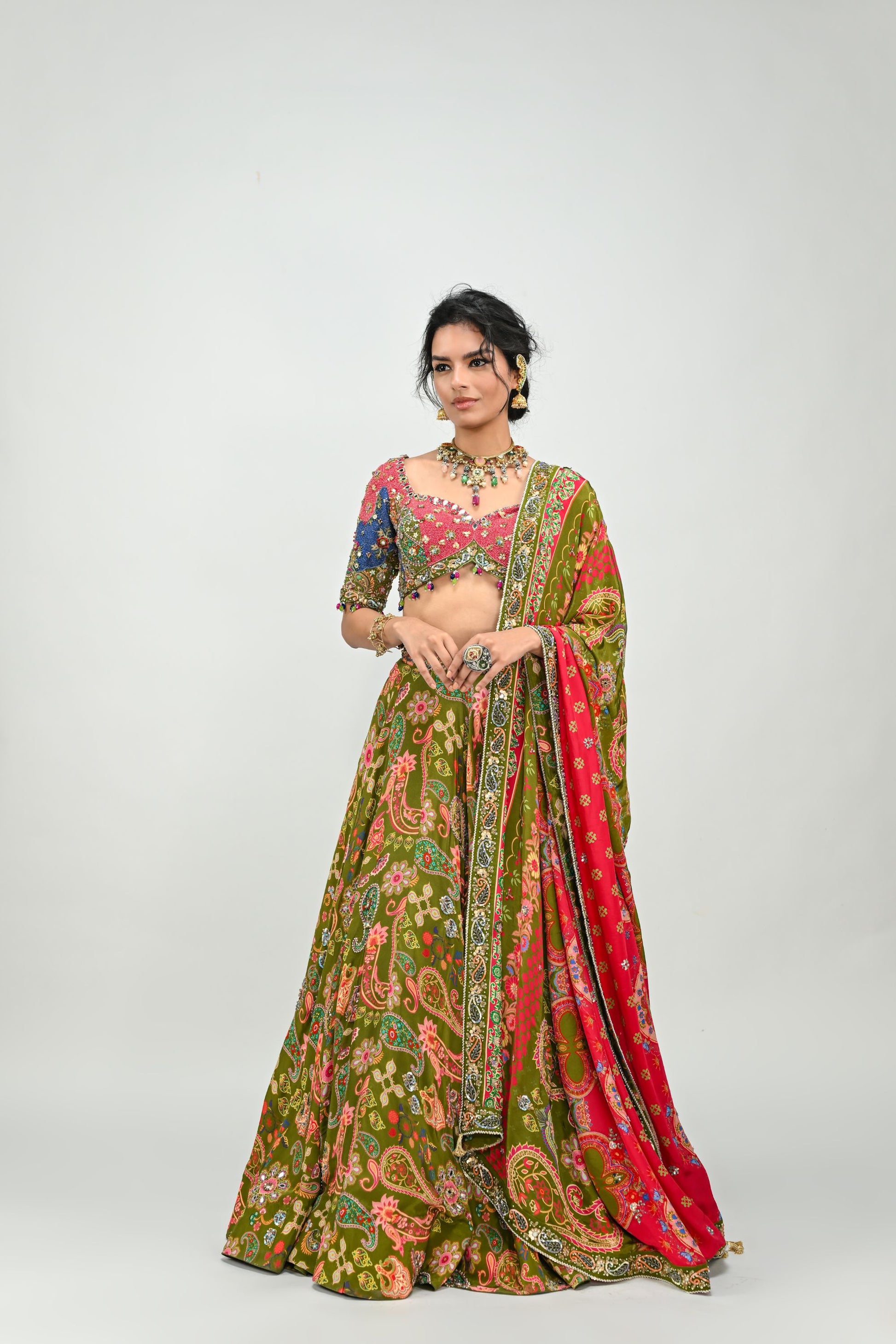 OLIVE HIGHLIGHTED LEHENGA PAIRED WITH PATCH EMBROIDERED BADLA BLOUSE AND DUAL PRINT HIGHLIGHTED DUPATTA