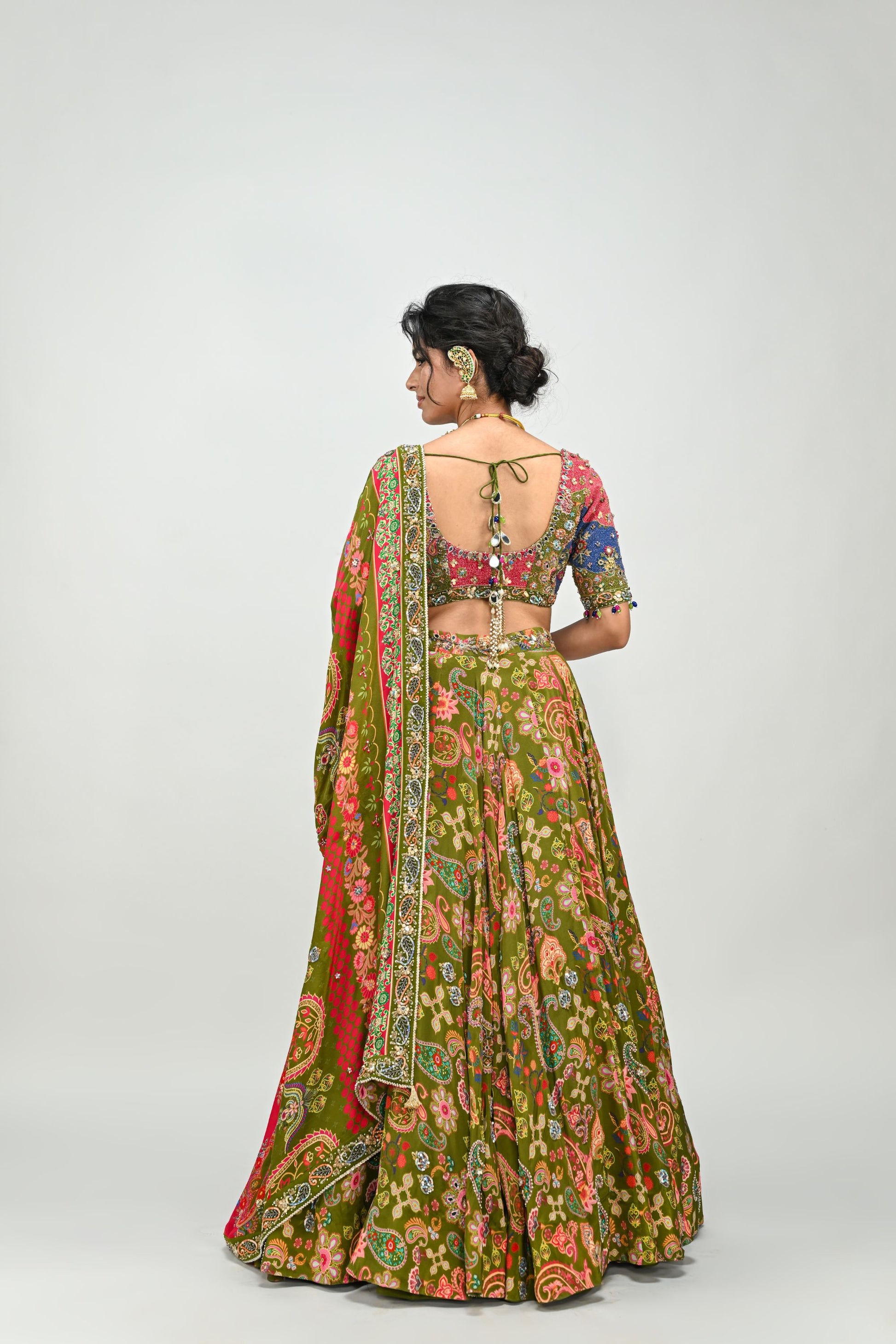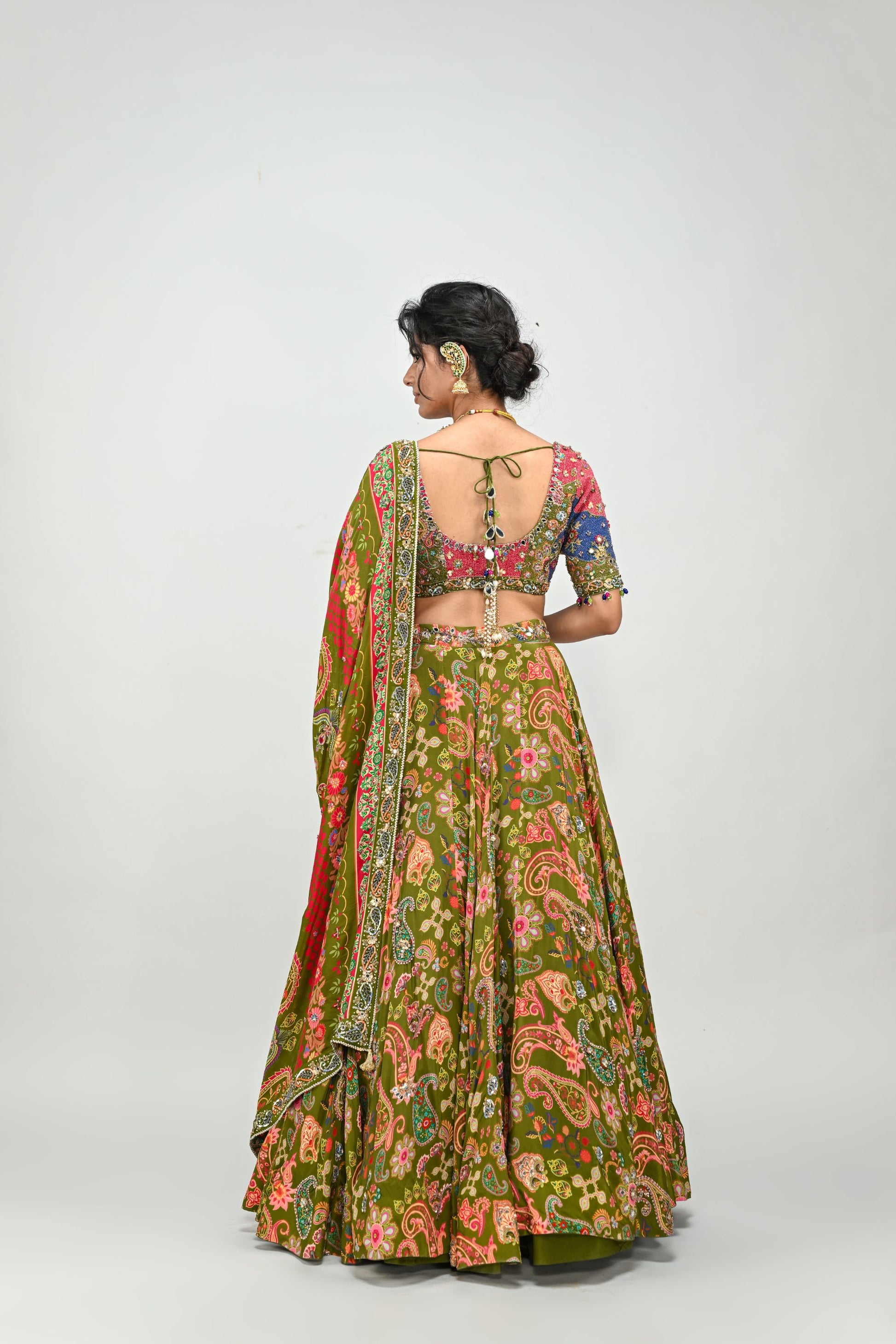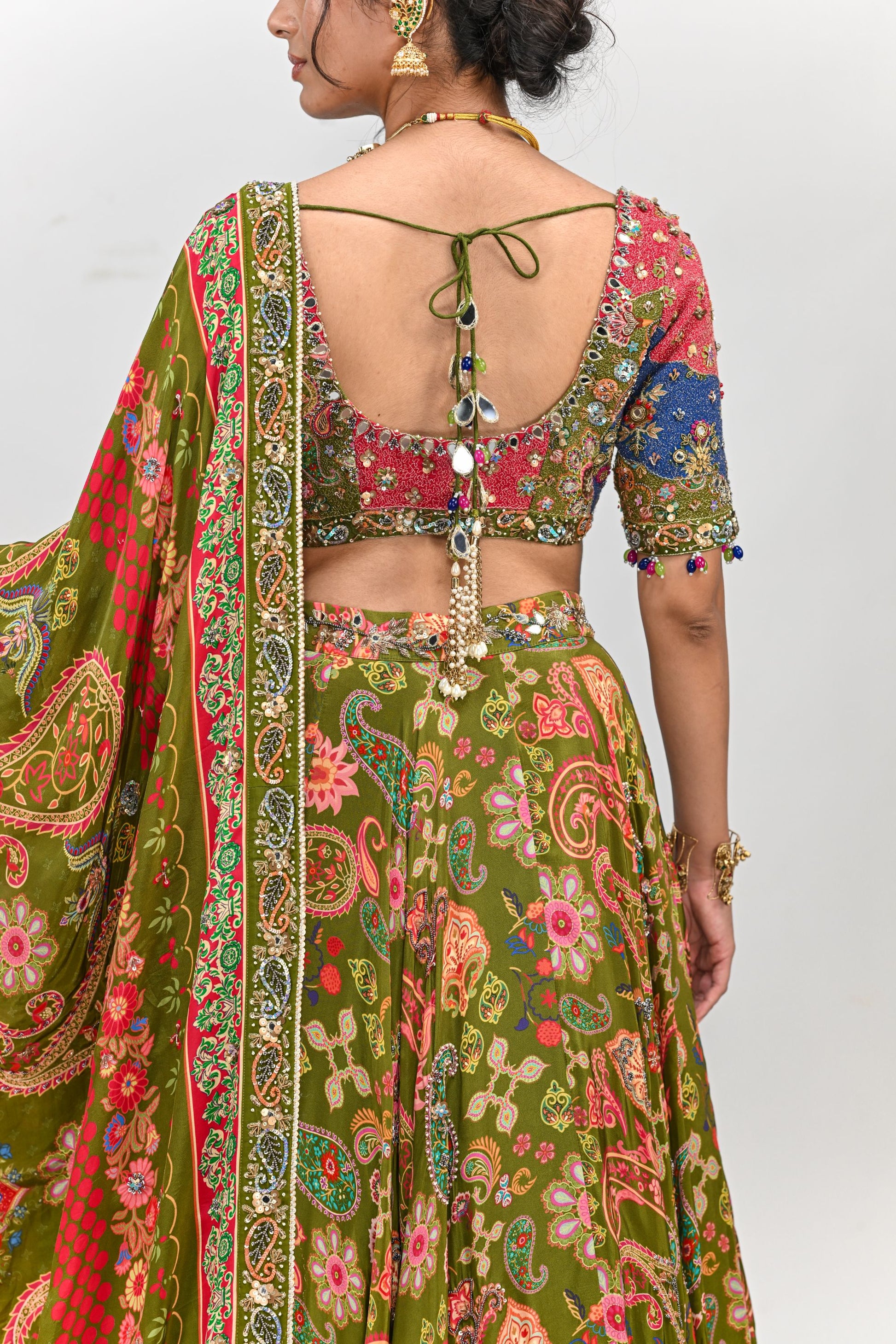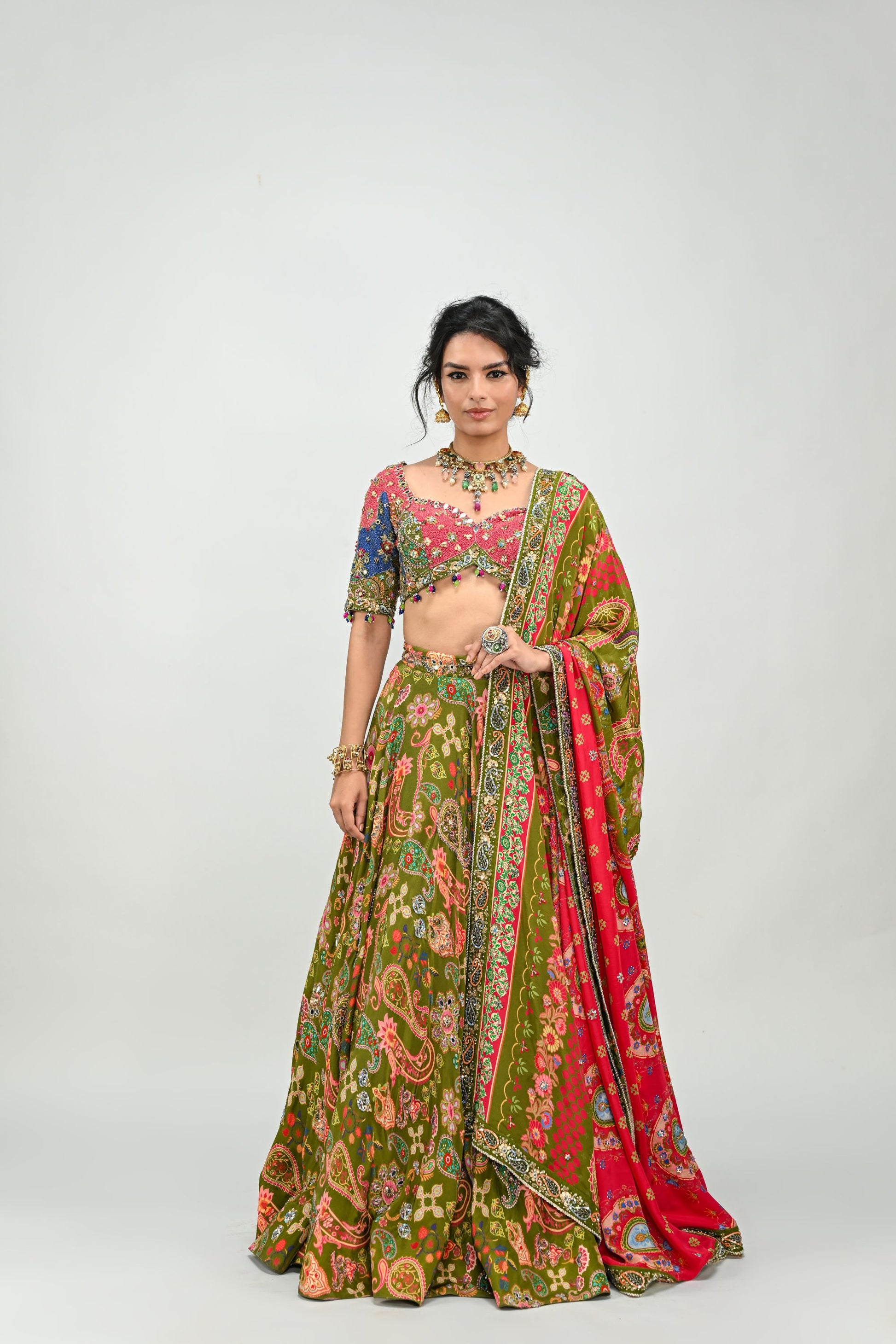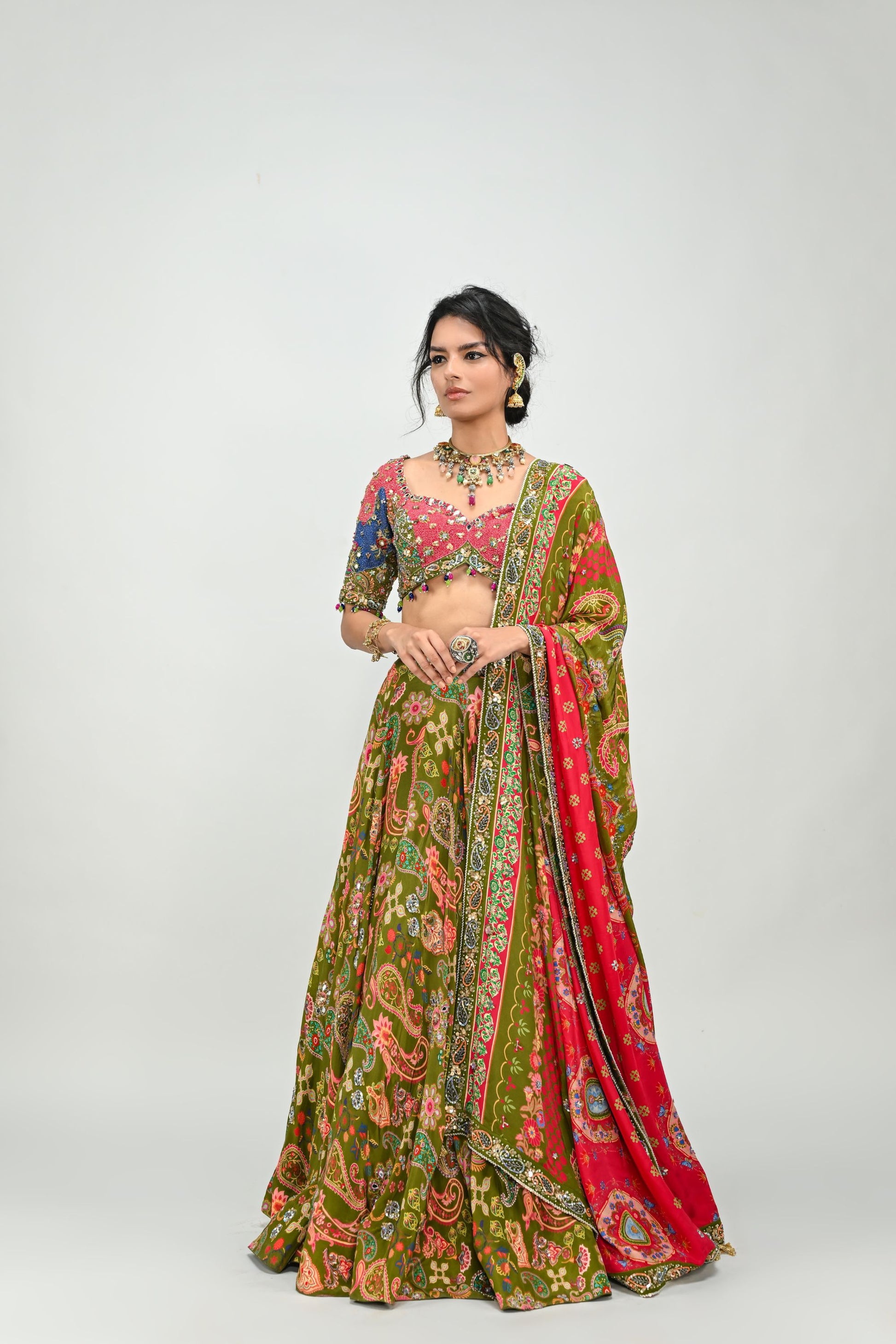 OLIVE HIGHLIGHTED LEHENGA PAIRED WITH PATCH EMBROIDERED BADLA BLOUSE AND DUAL PRINT HIGHLIGHTED DUPATTA