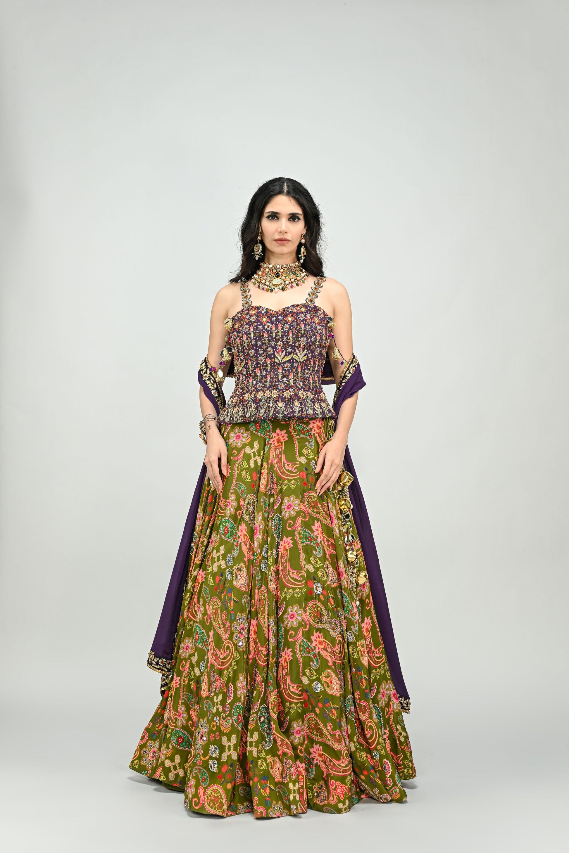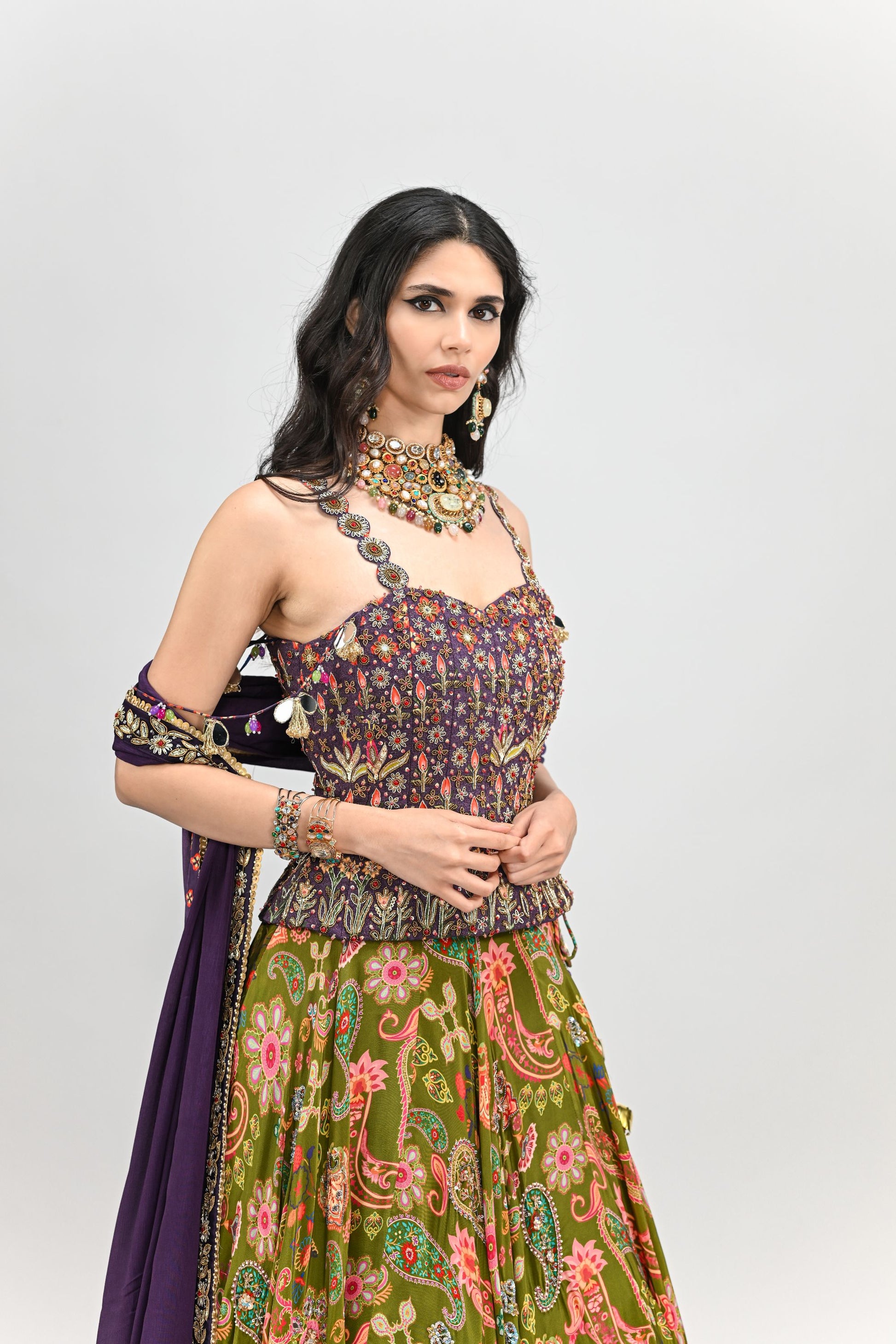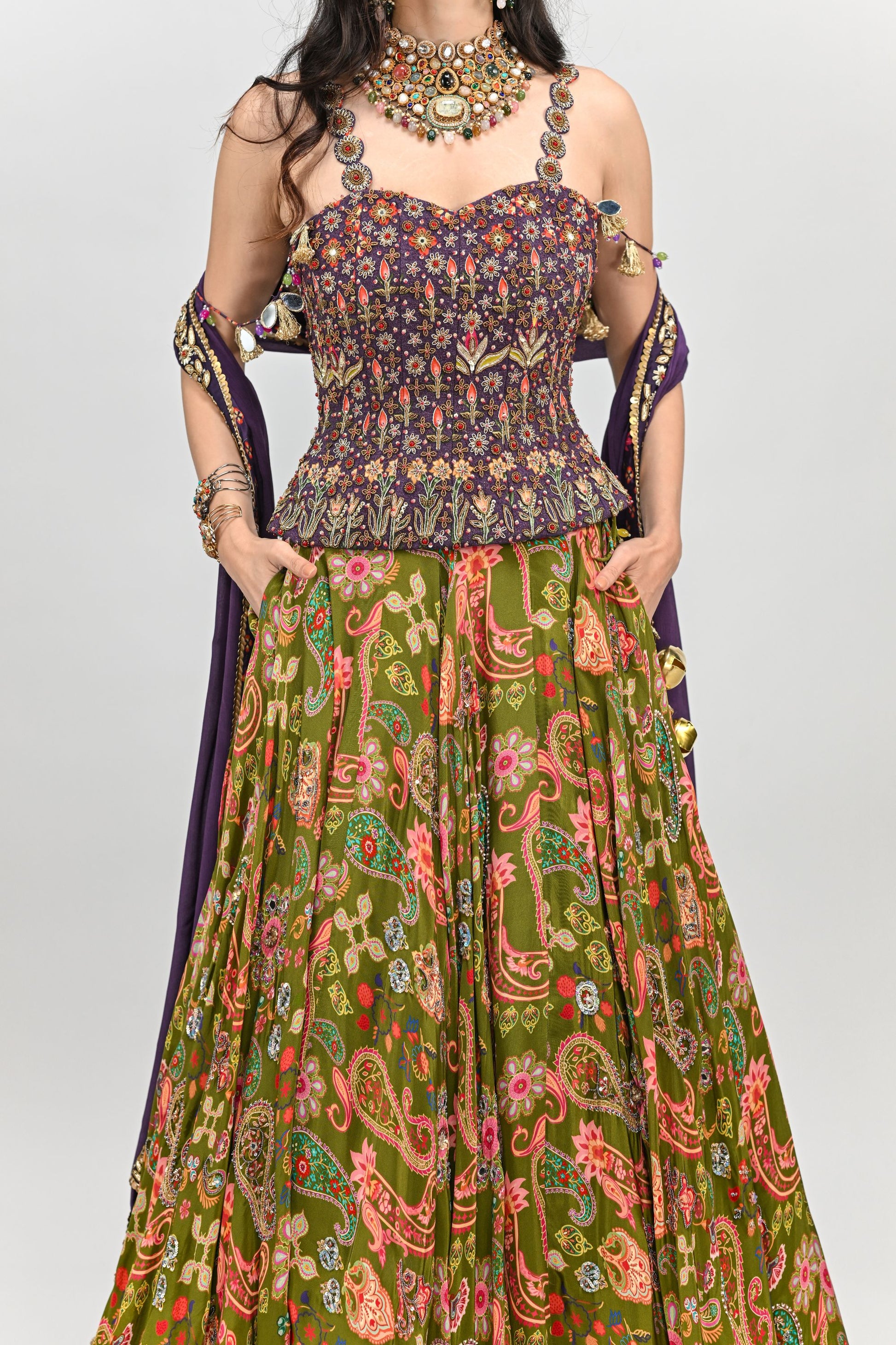 OLIVE HIGHLIGHTED LEHENGA PAIRED WITH PLUM EMBROIDERED BADLA CORSET AND DUPATTA