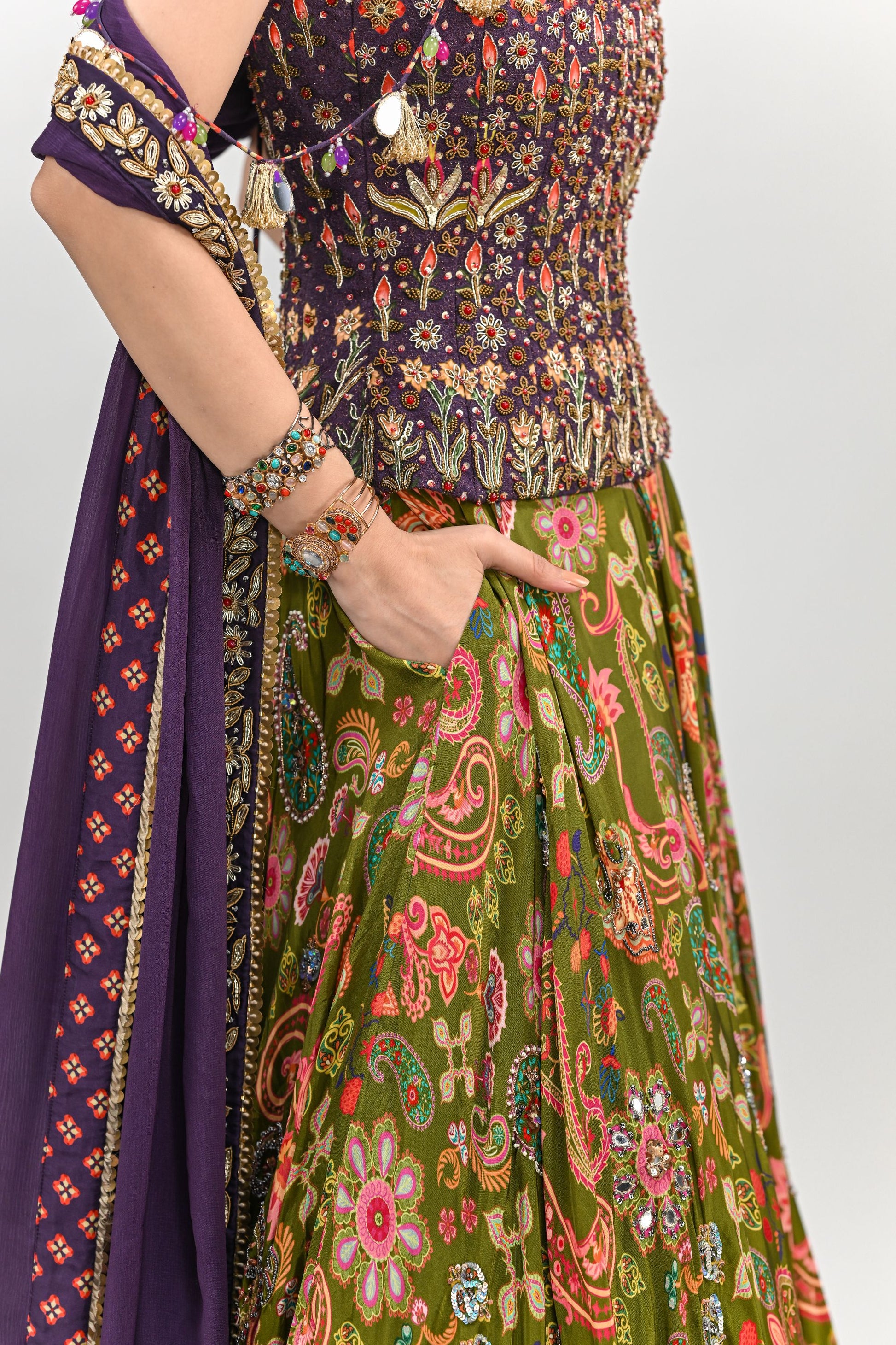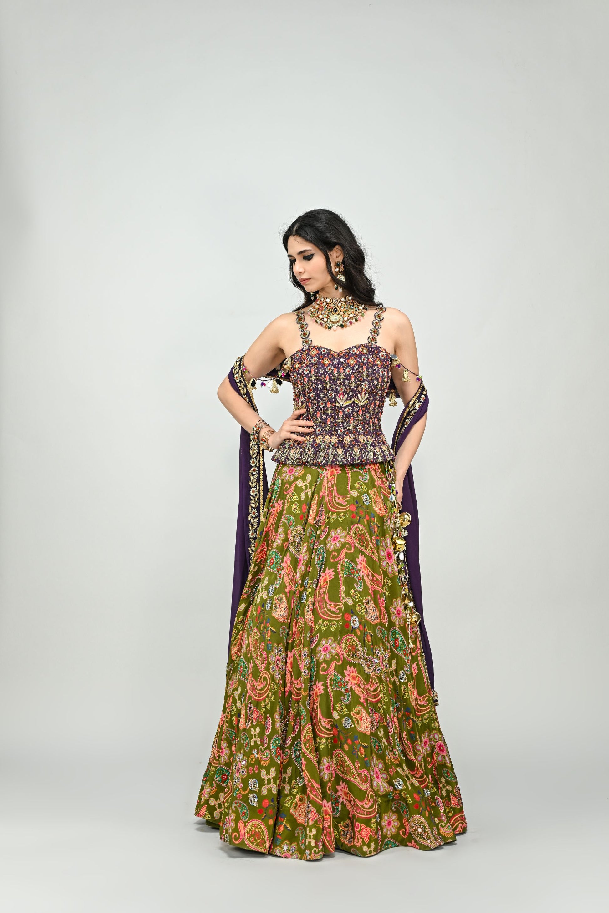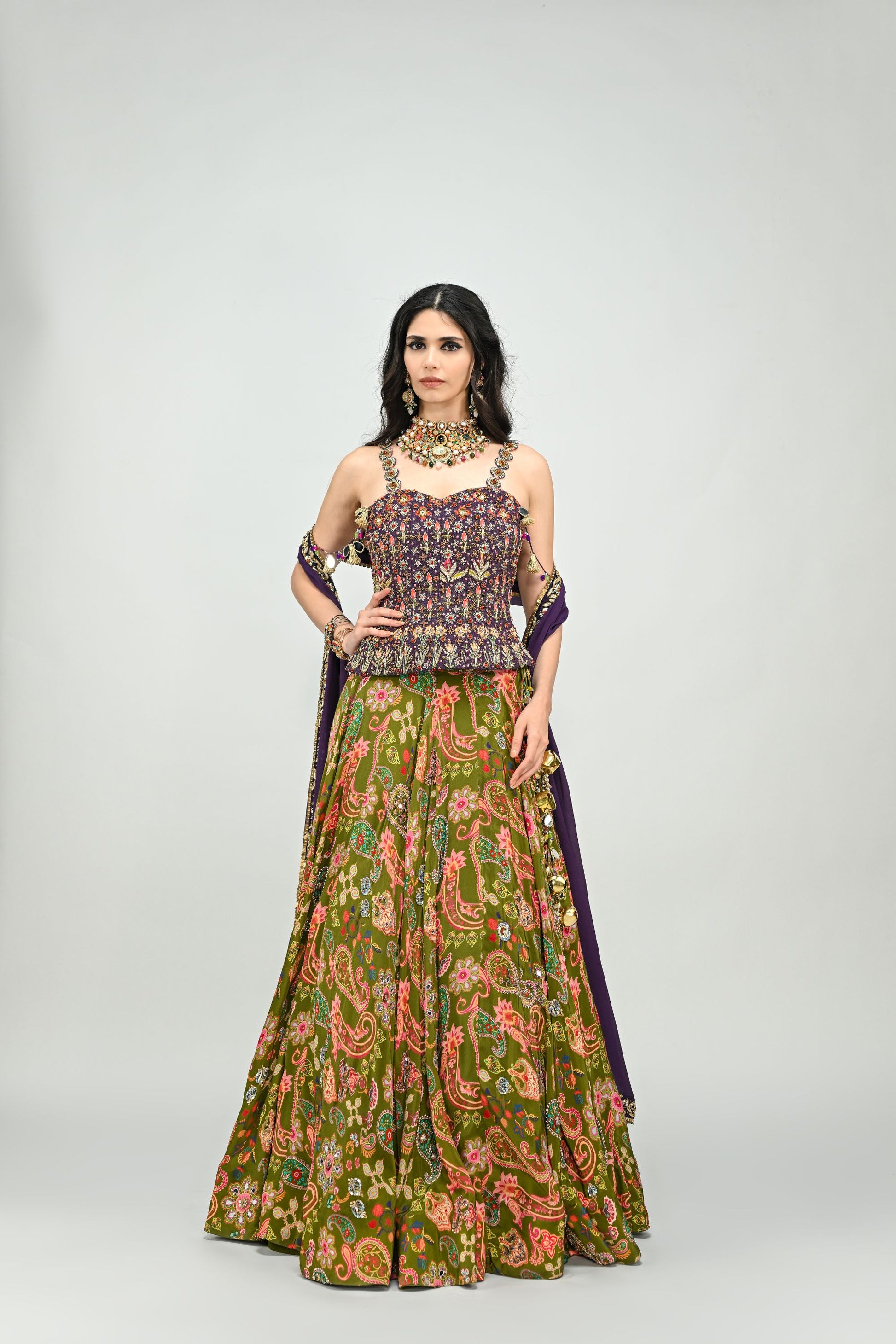 OLIVE HIGHLIGHTED LEHENGA PAIRED WITH PLUM EMBROIDERED BADLA CORSET AND DUPATTA