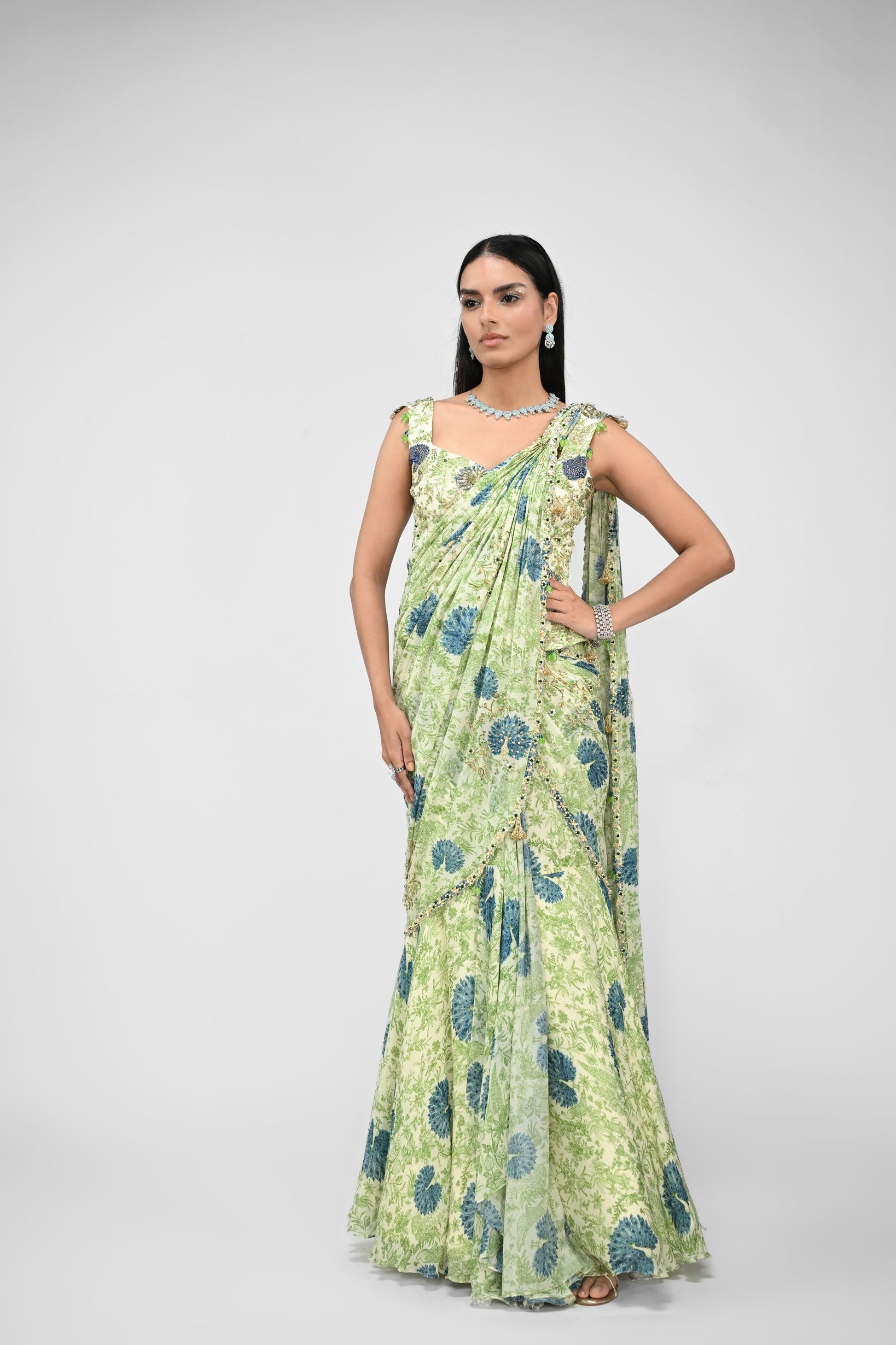 Peacock Highlighted Pre Stitched Saree Paired With Highlighted Corset Blouse