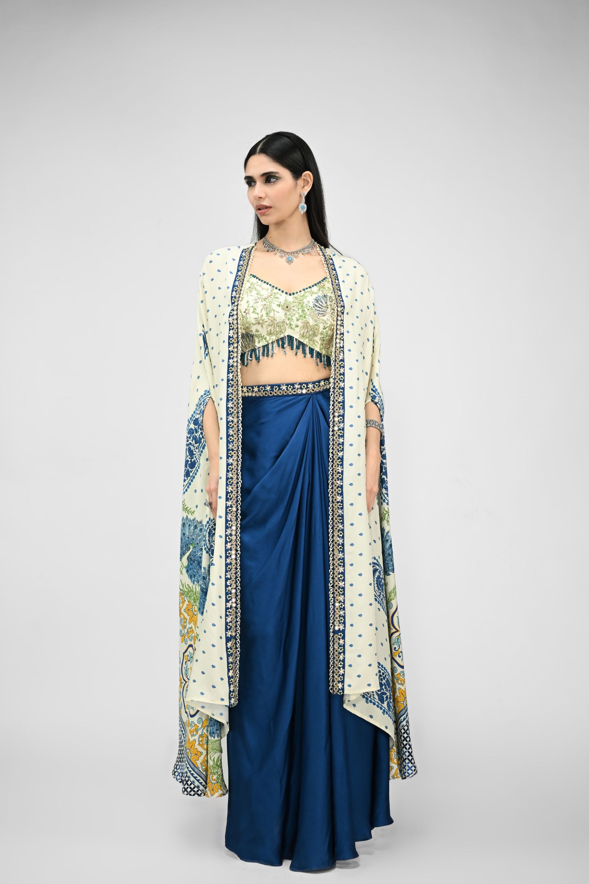 Peacock Printed Highlight Bralette Paired With Dhoti Set And Printed Cape