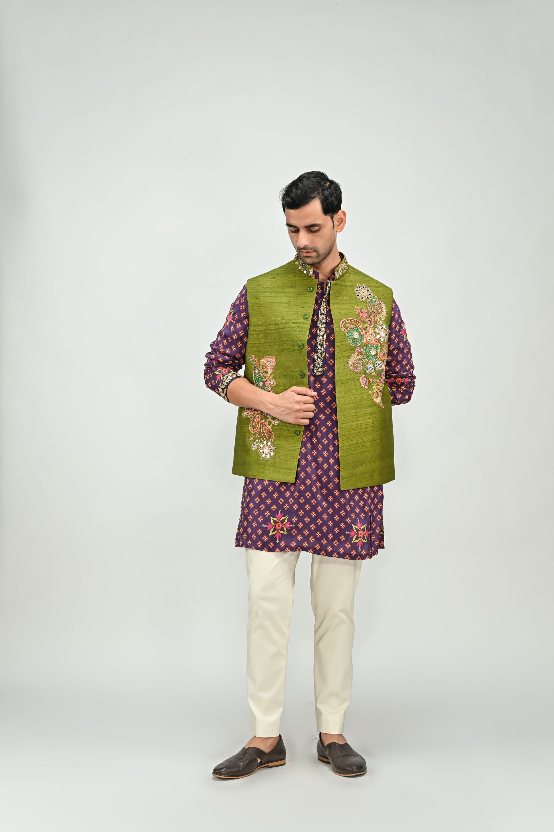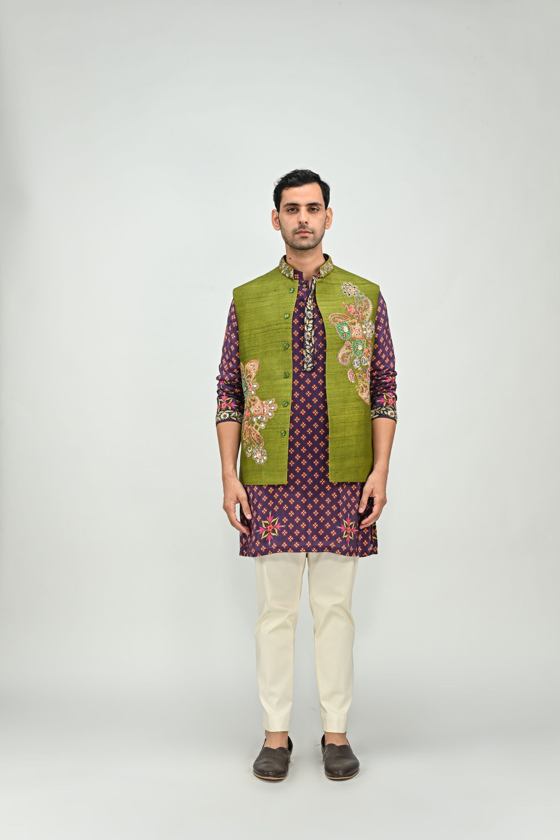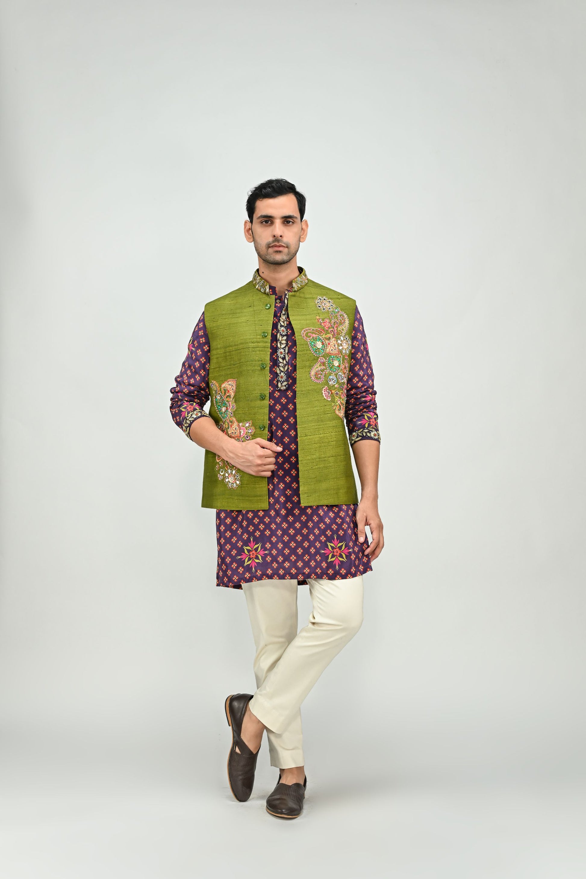 PLUM KURTA PAIRED WITH PATCH OLIVE BUNDI PANT SET