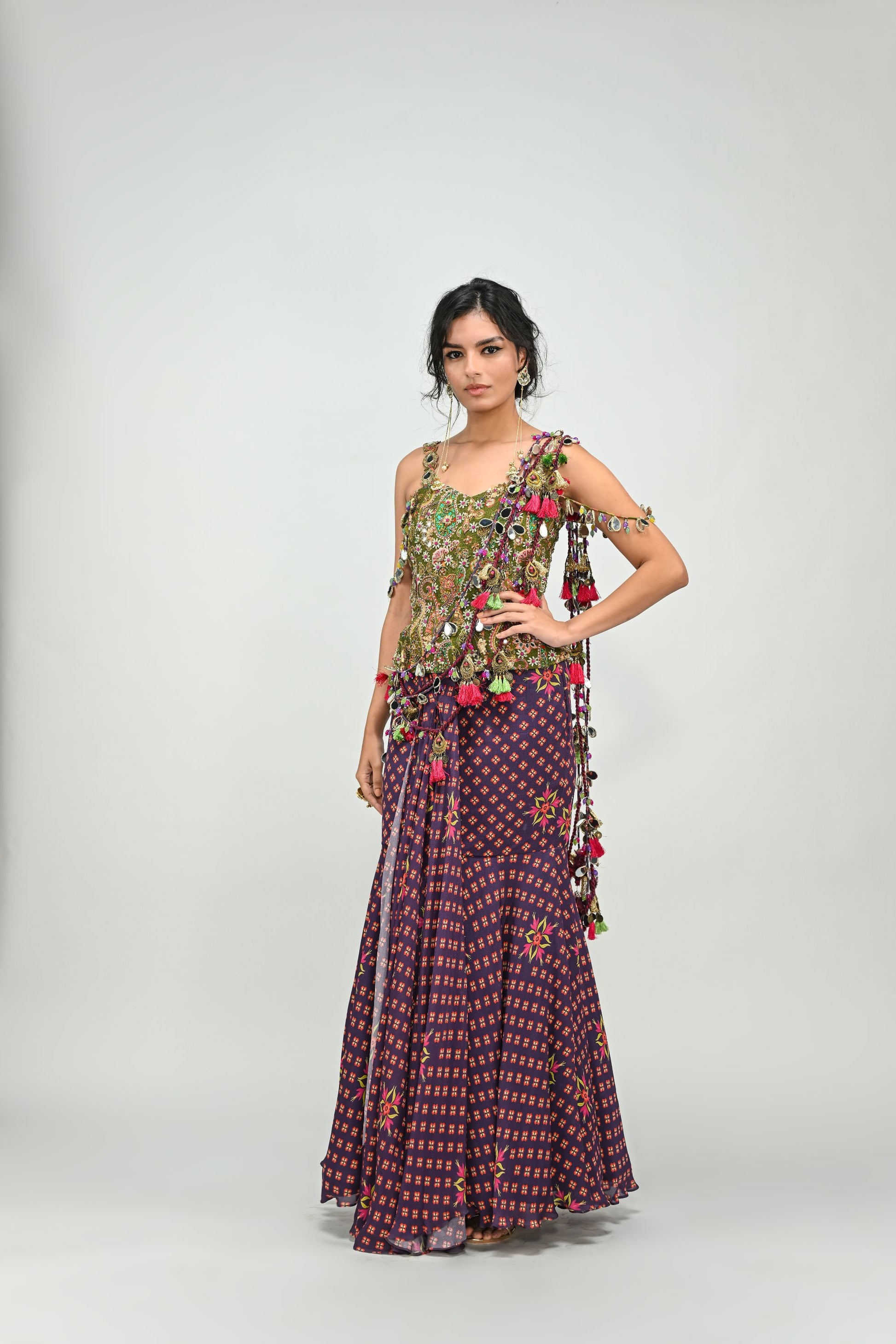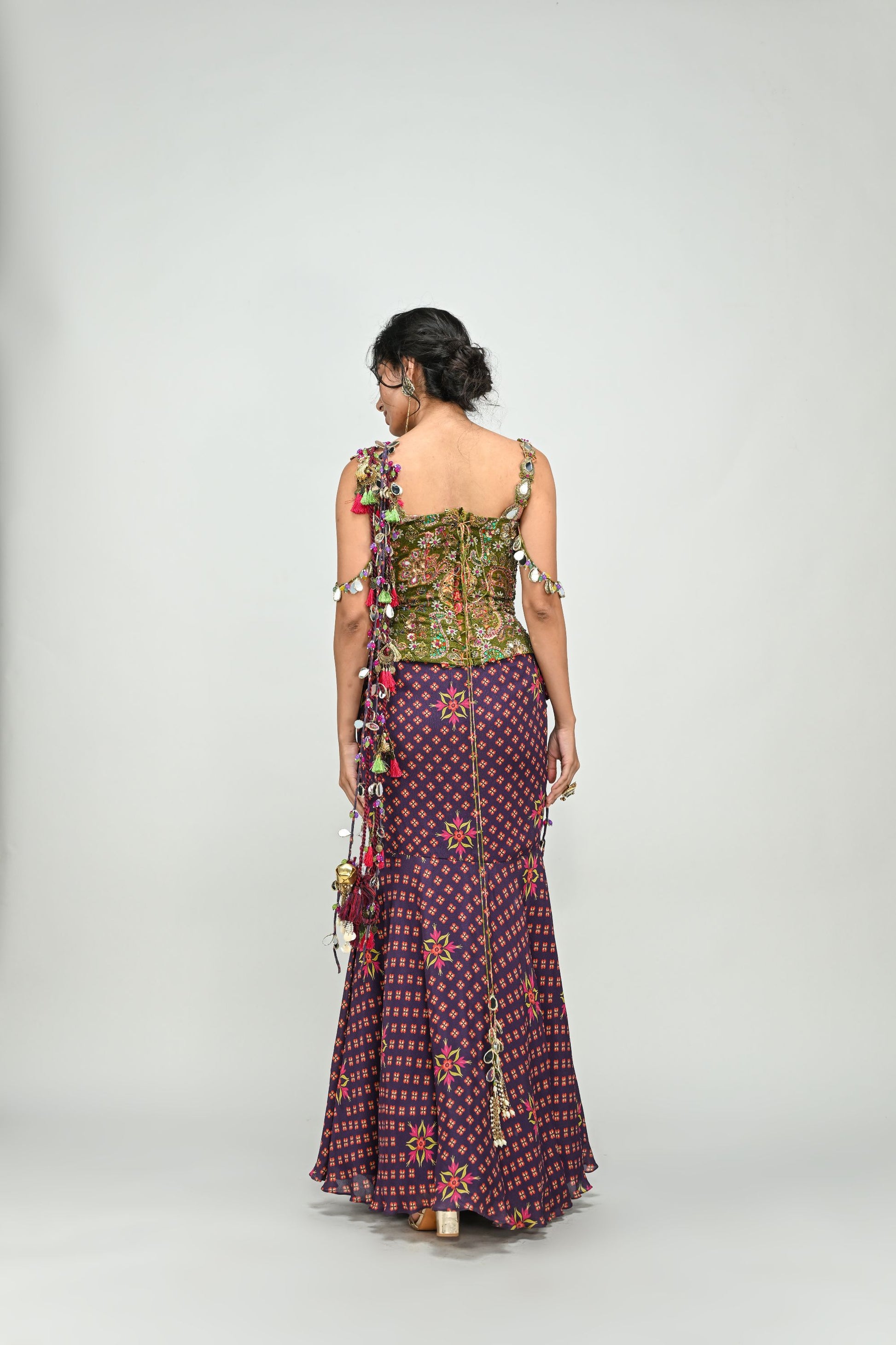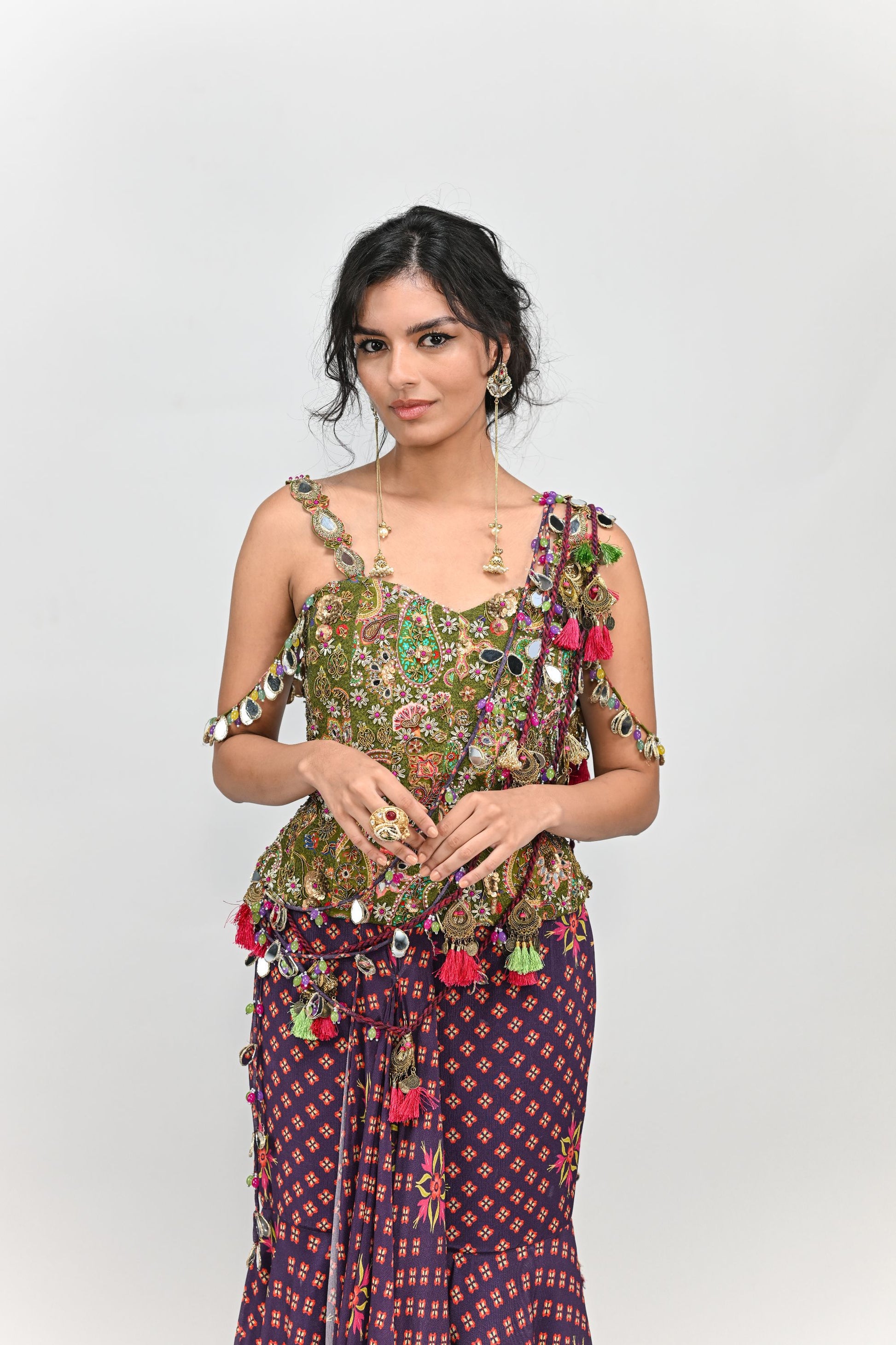 PLUM PRESTITCHED TASSEL SAREE PAIRED WITH BADLA EMBROIDERED GREEN CORSET