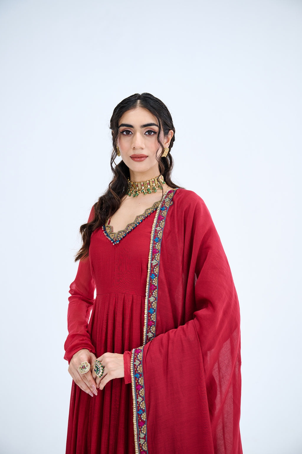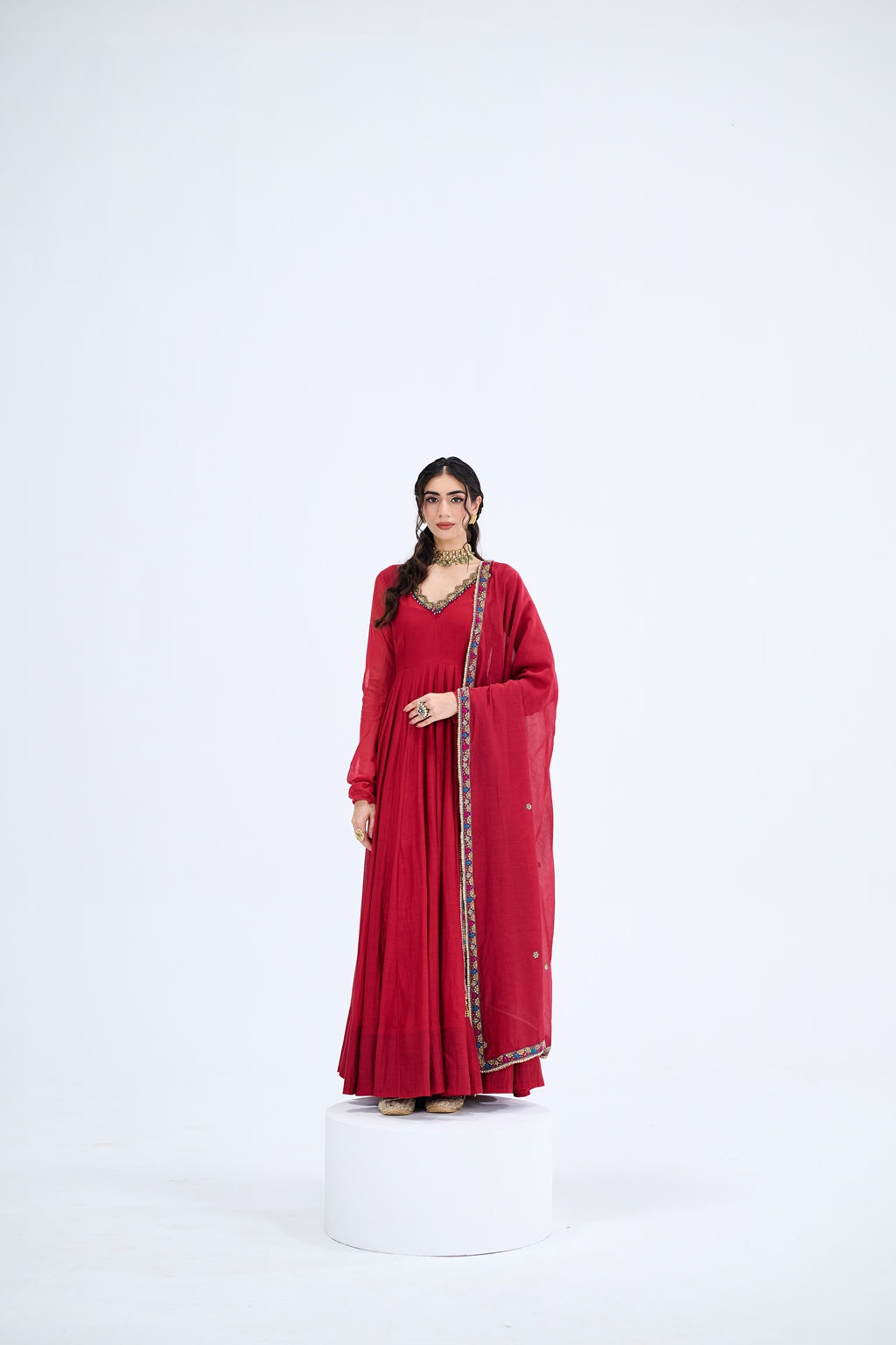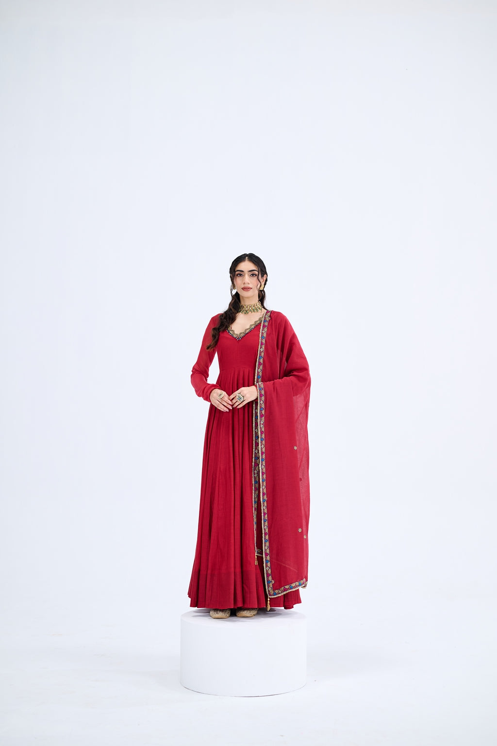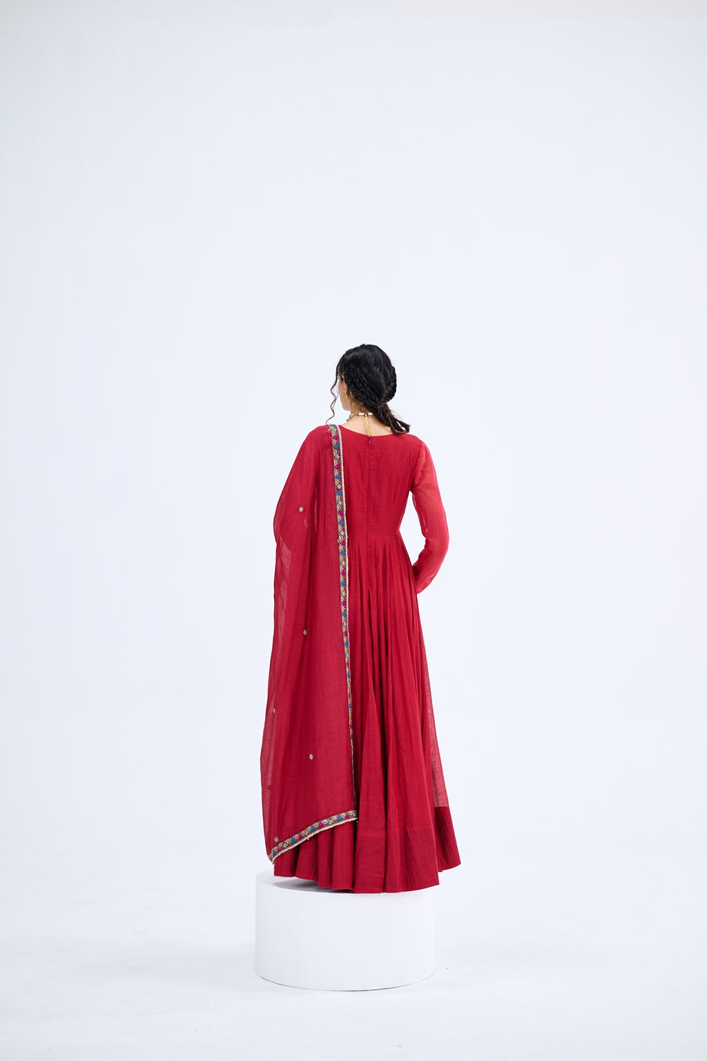 RED ANARKALI WITH MULCHANDERI DUPATTA