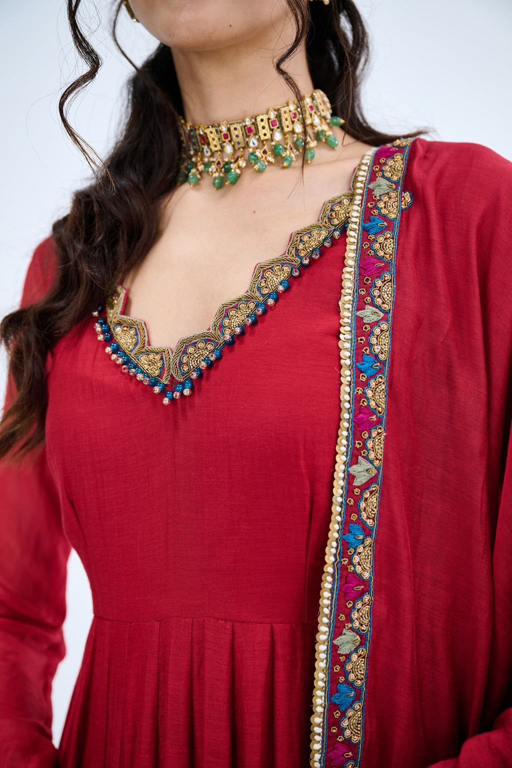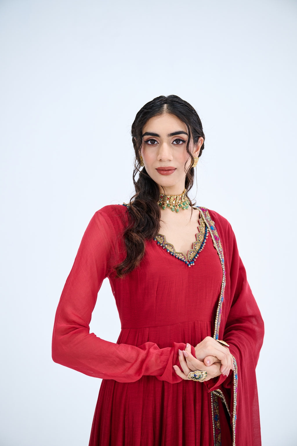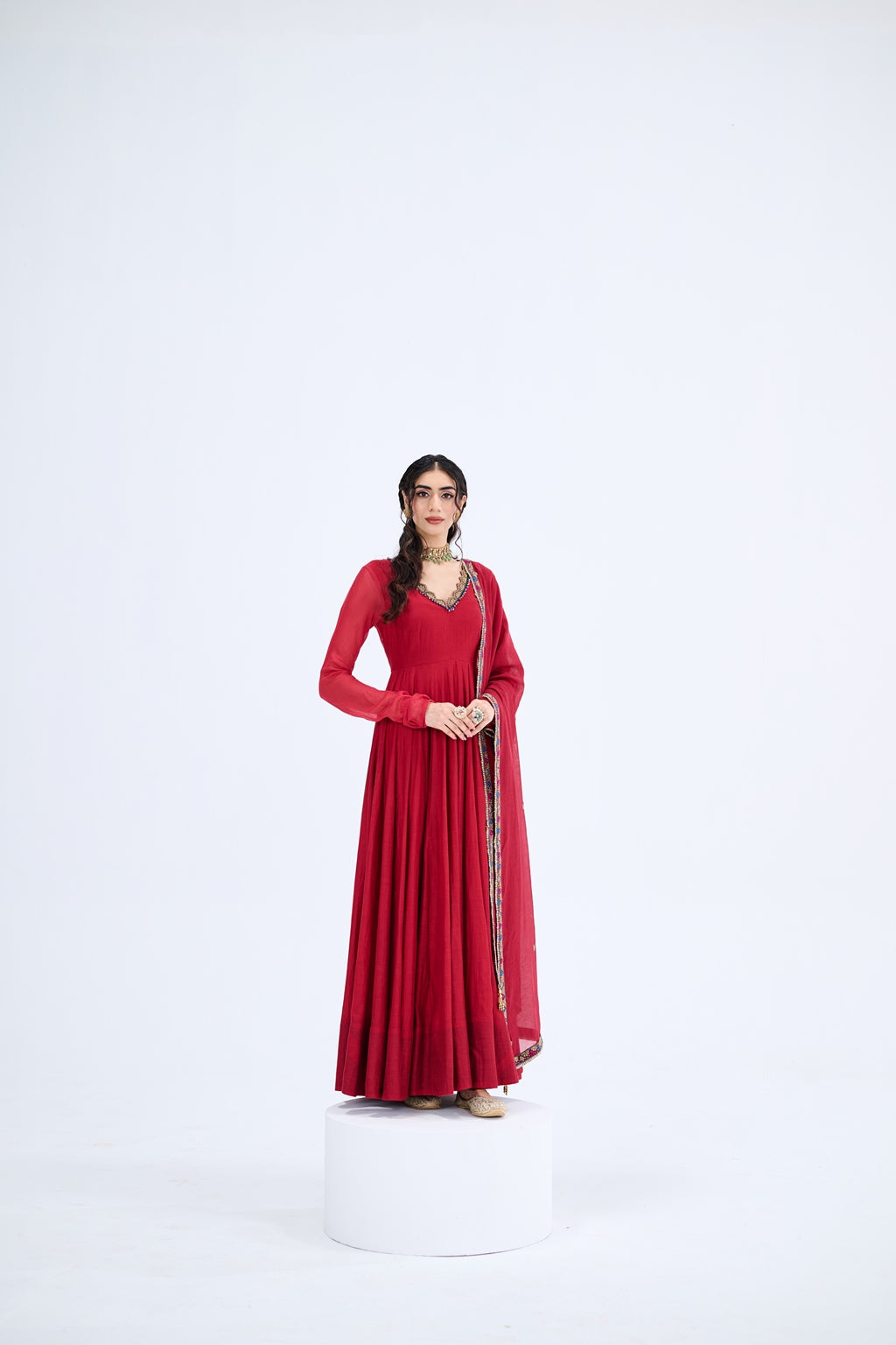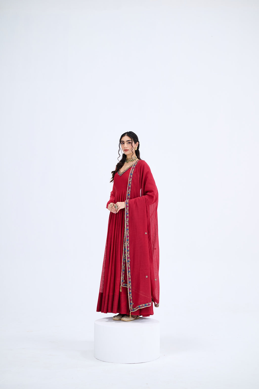 RED ANARKALI WITH MULCHANDERI DUPATTA