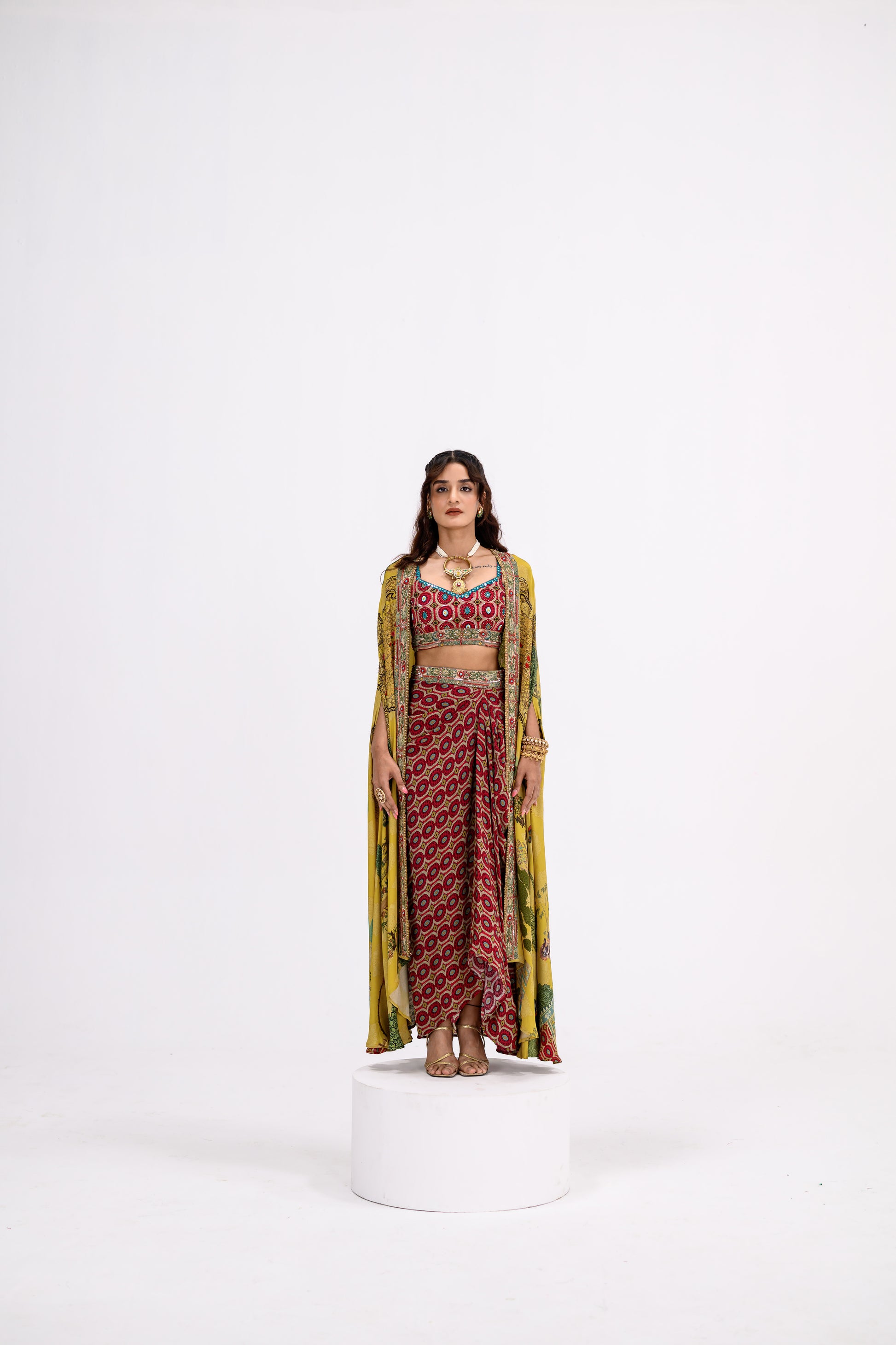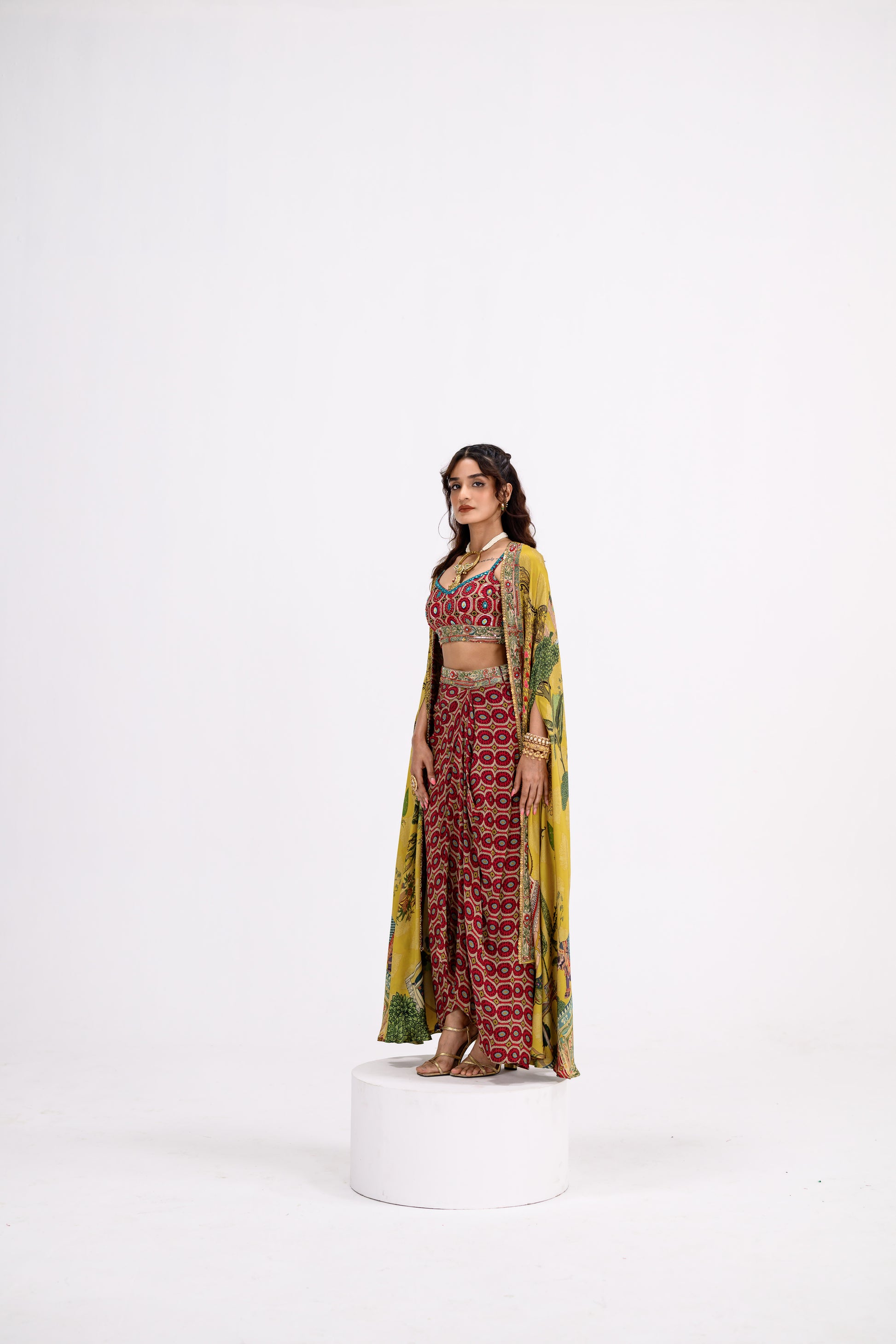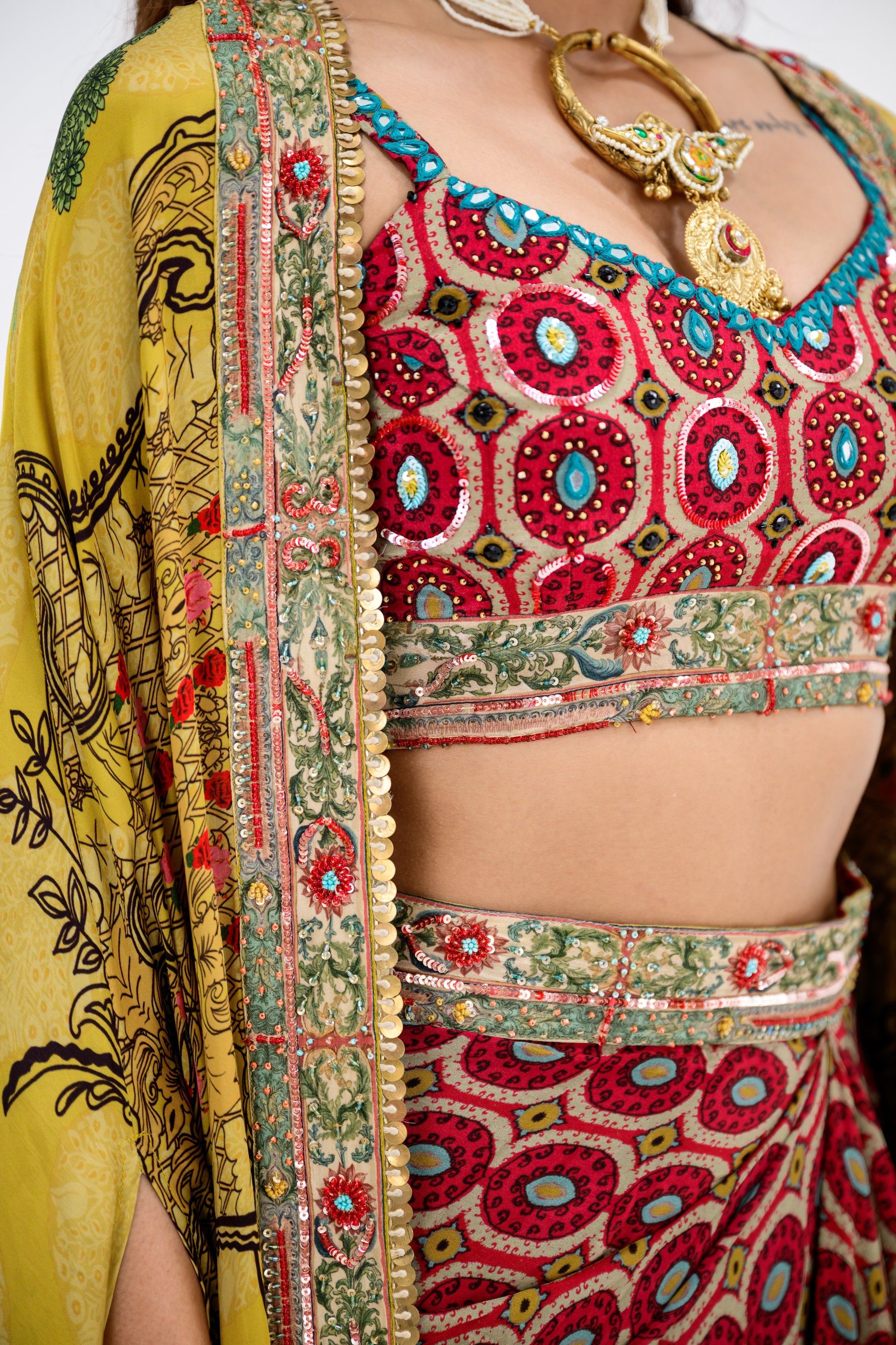 Red Honeycomb Bralette And Skirt Paired With Mustard Mughal Garden Cape
