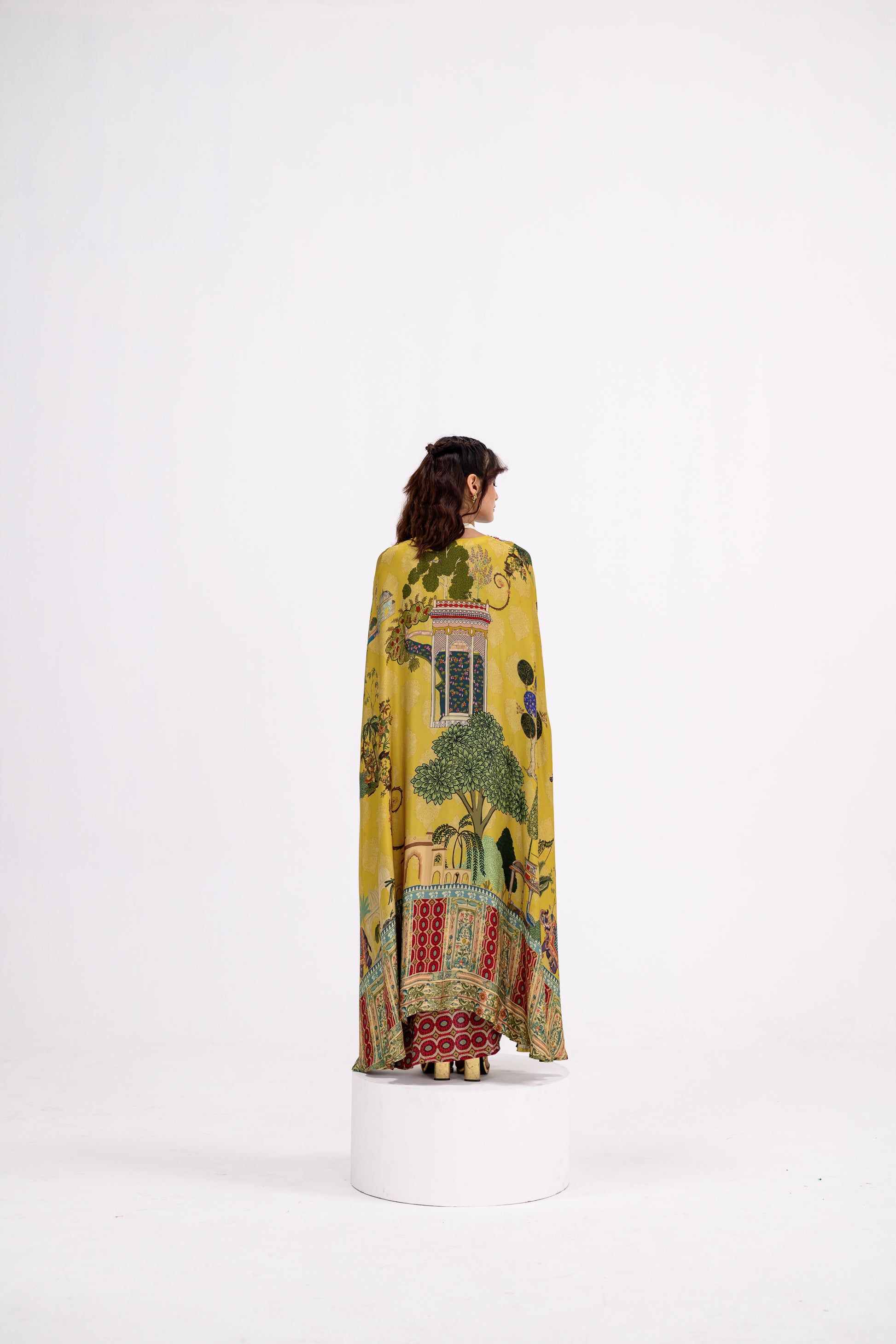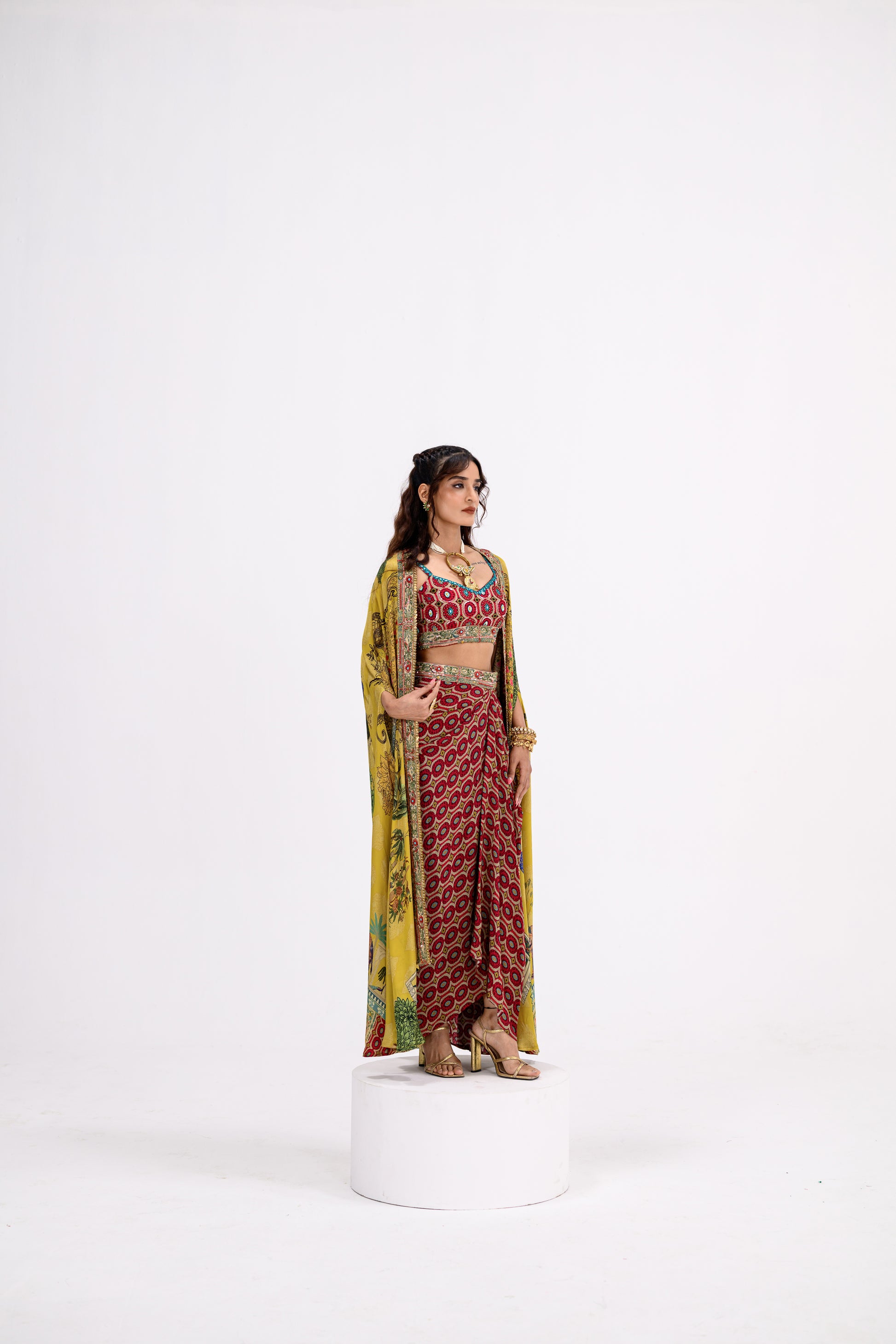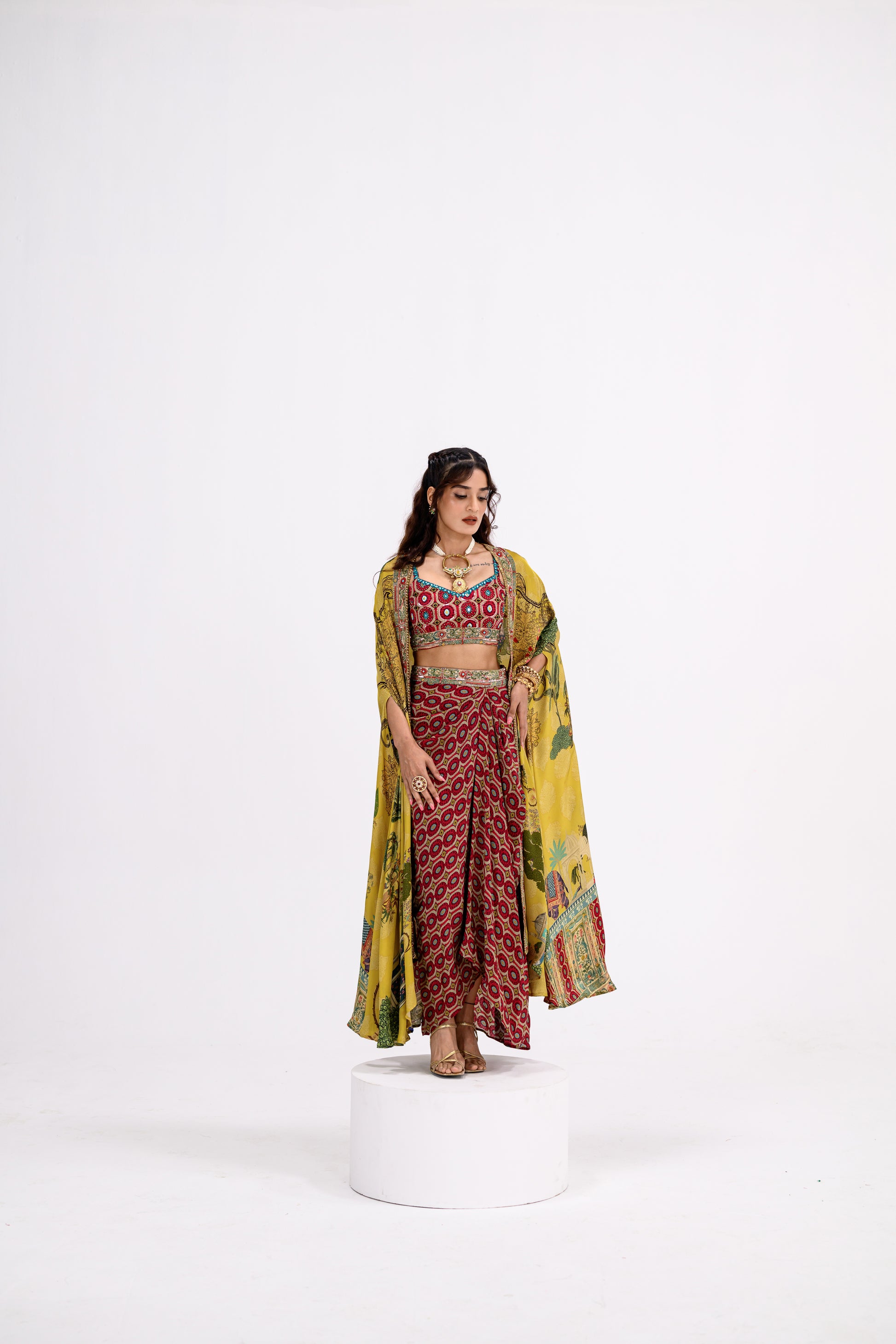 Red Honeycomb Bralette And Skirt Paired With Mustard Mughal Garden Cape