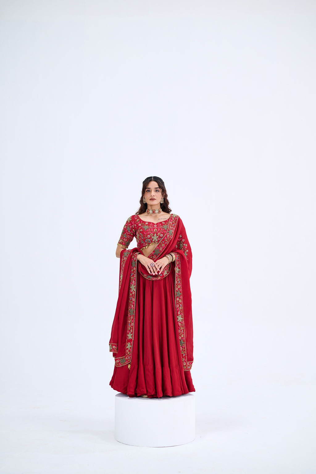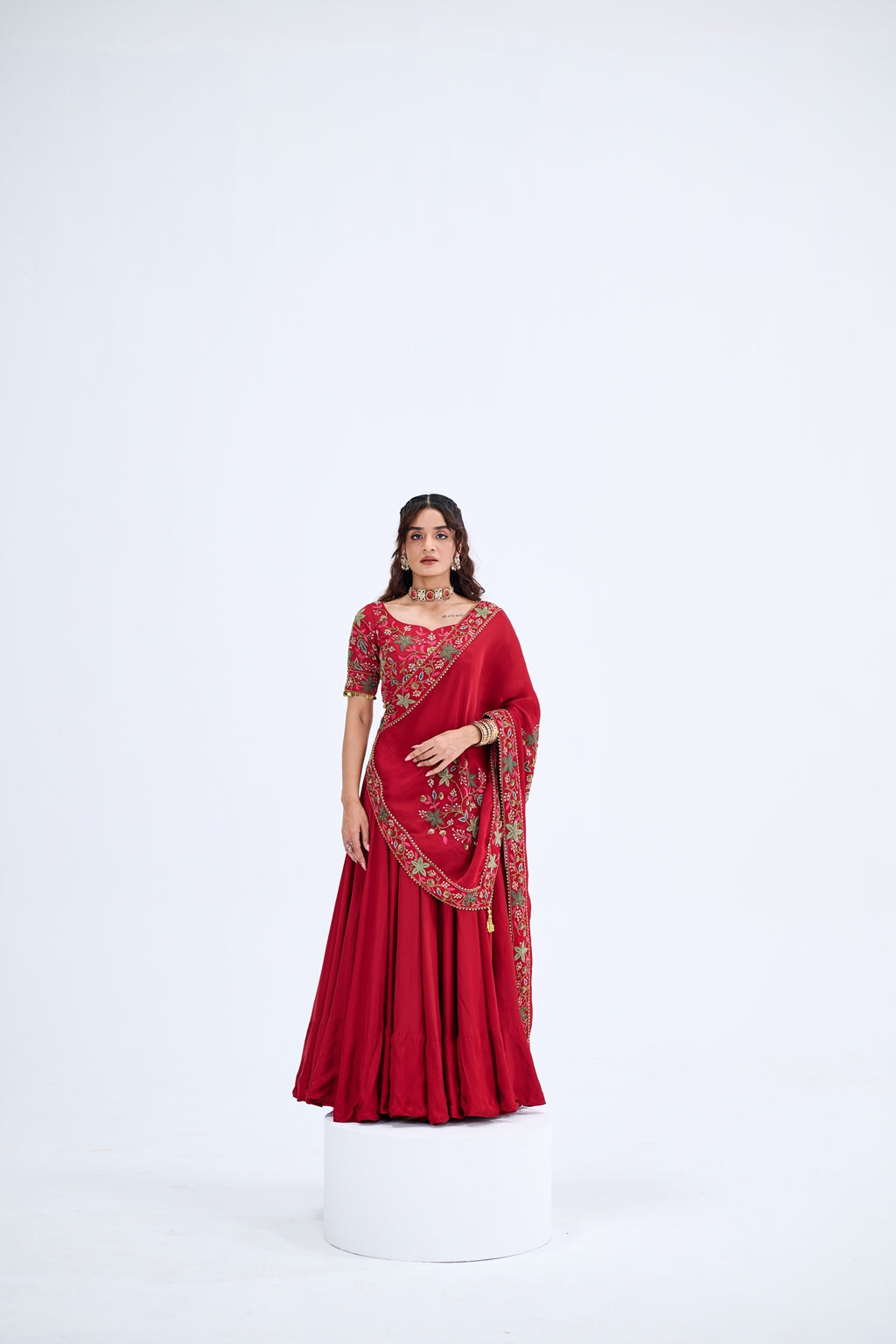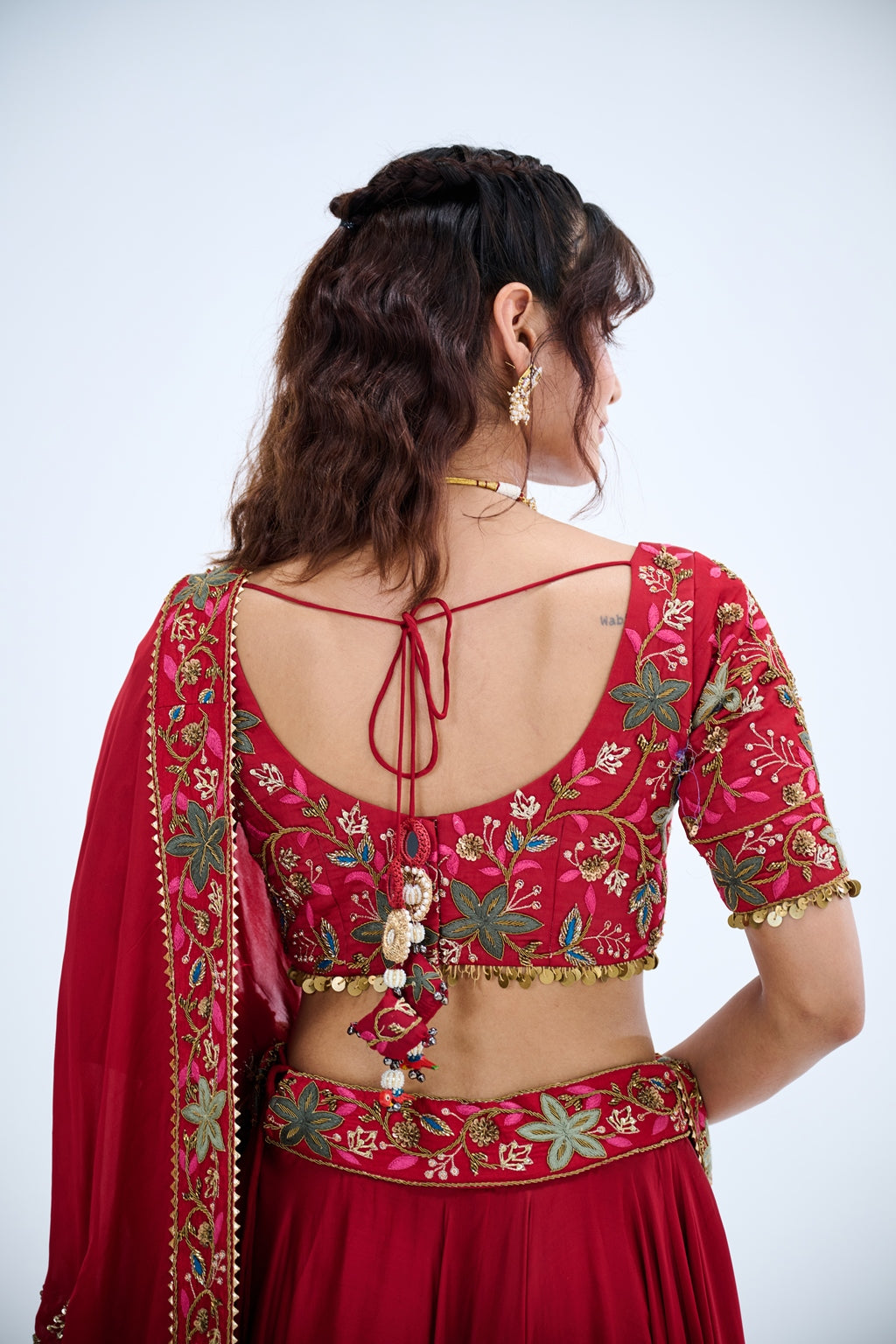 RED LEHENGA WITH EMBROIDERED BLOUSE PAIRED WITH EMBROIDERED BUTI DUPATTA