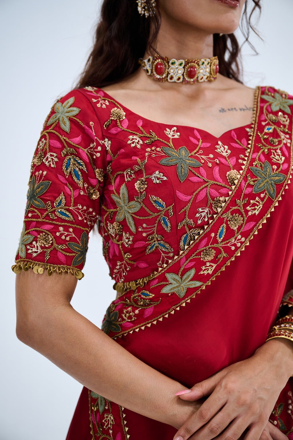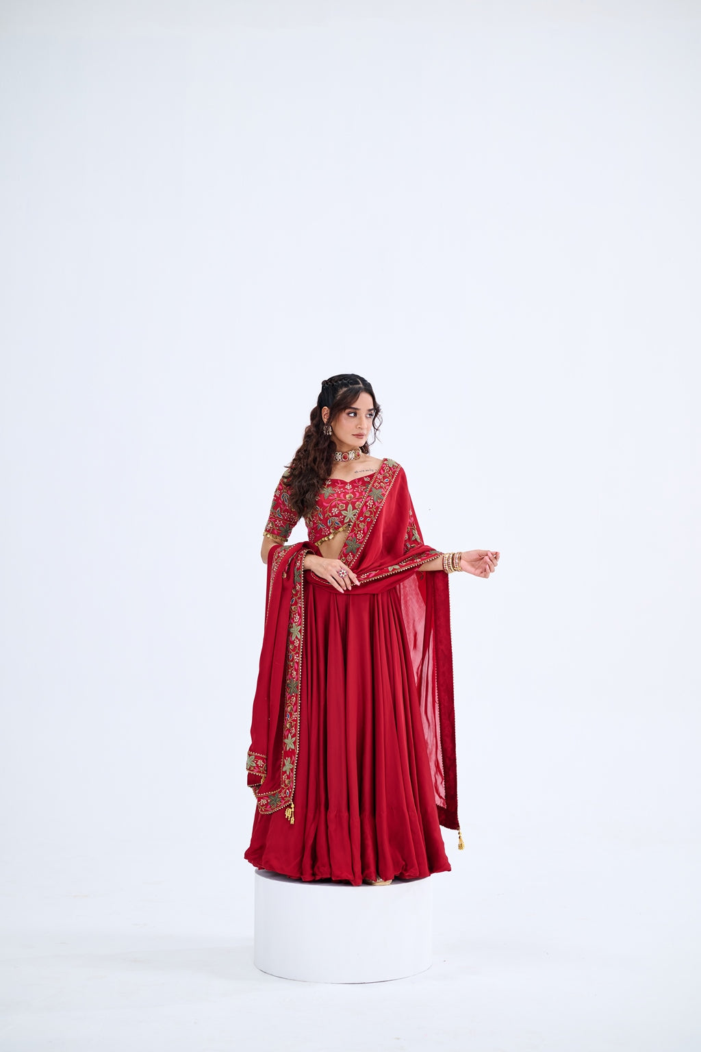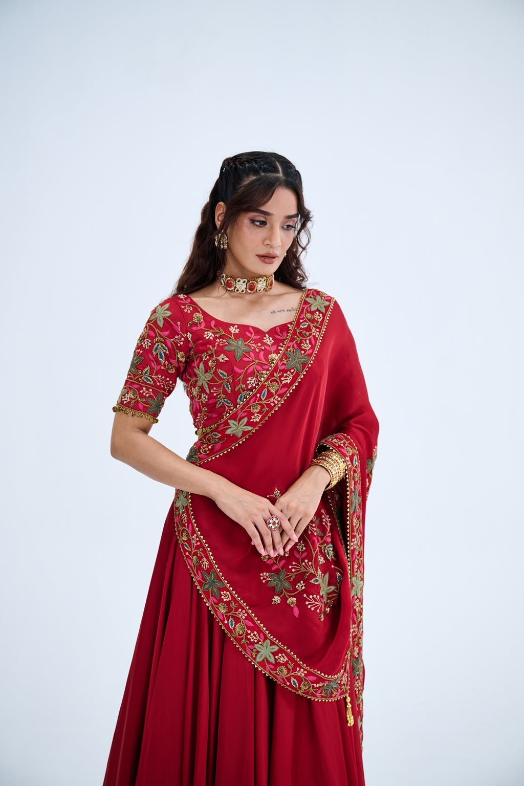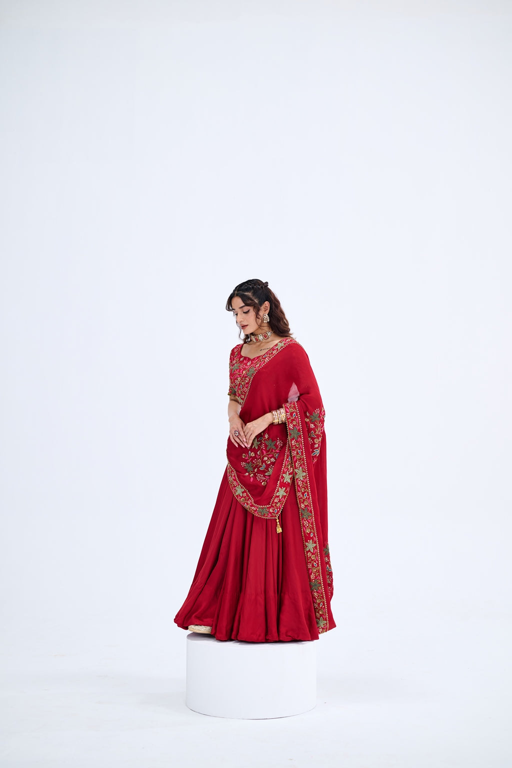 RED LEHENGA WITH EMBROIDERED BLOUSE PAIRED WITH EMBROIDERED BUTI DUPATTA