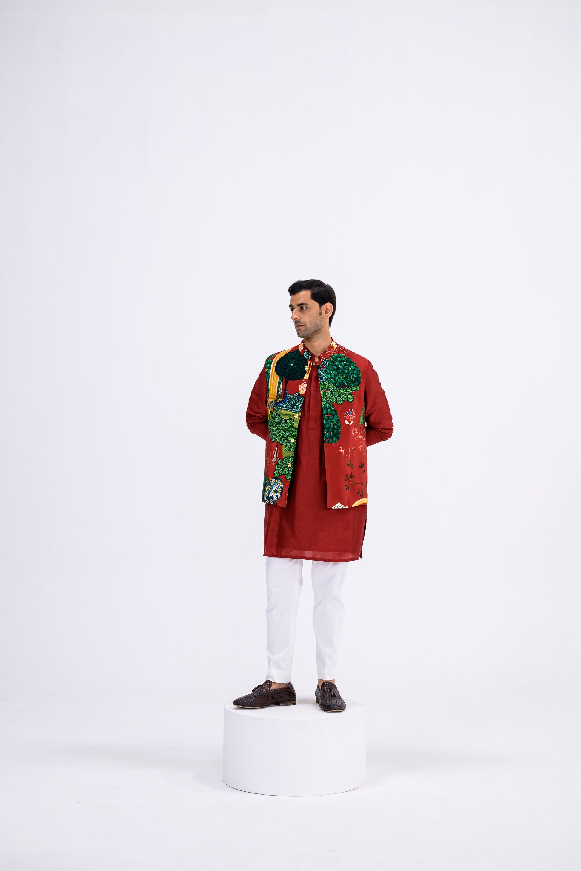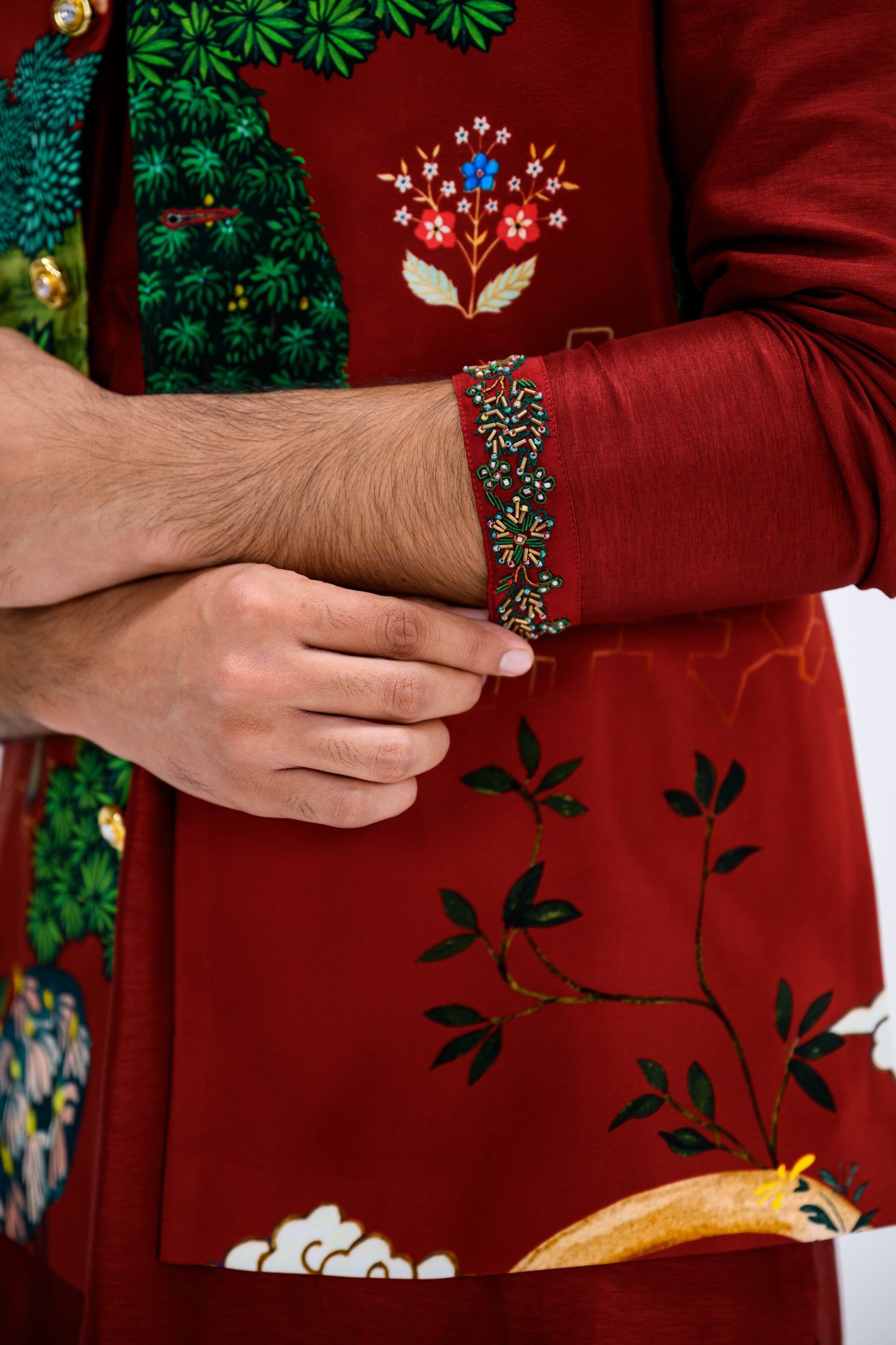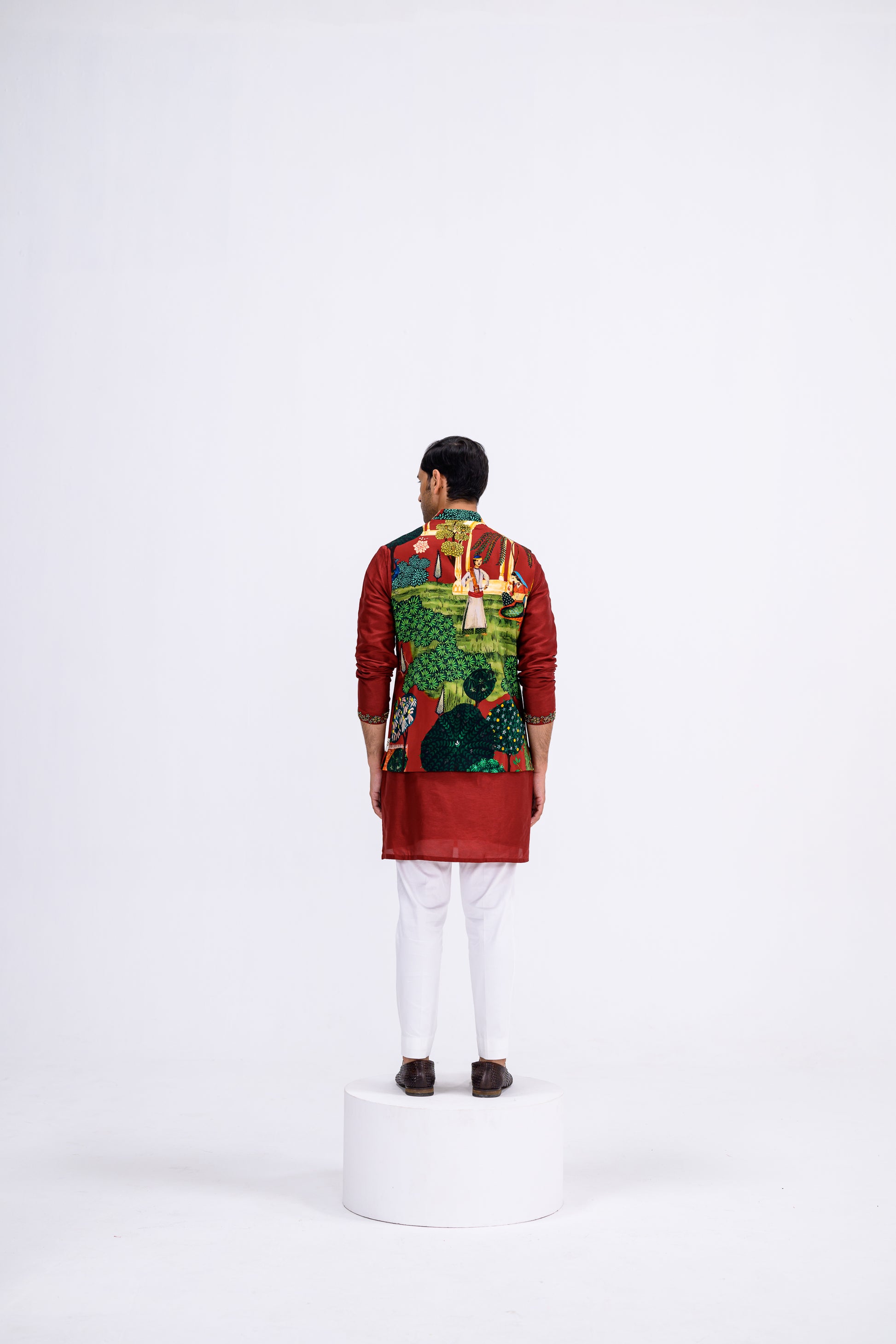 Red Mughal Garden Bundi Paired With Kurta And Pants Set