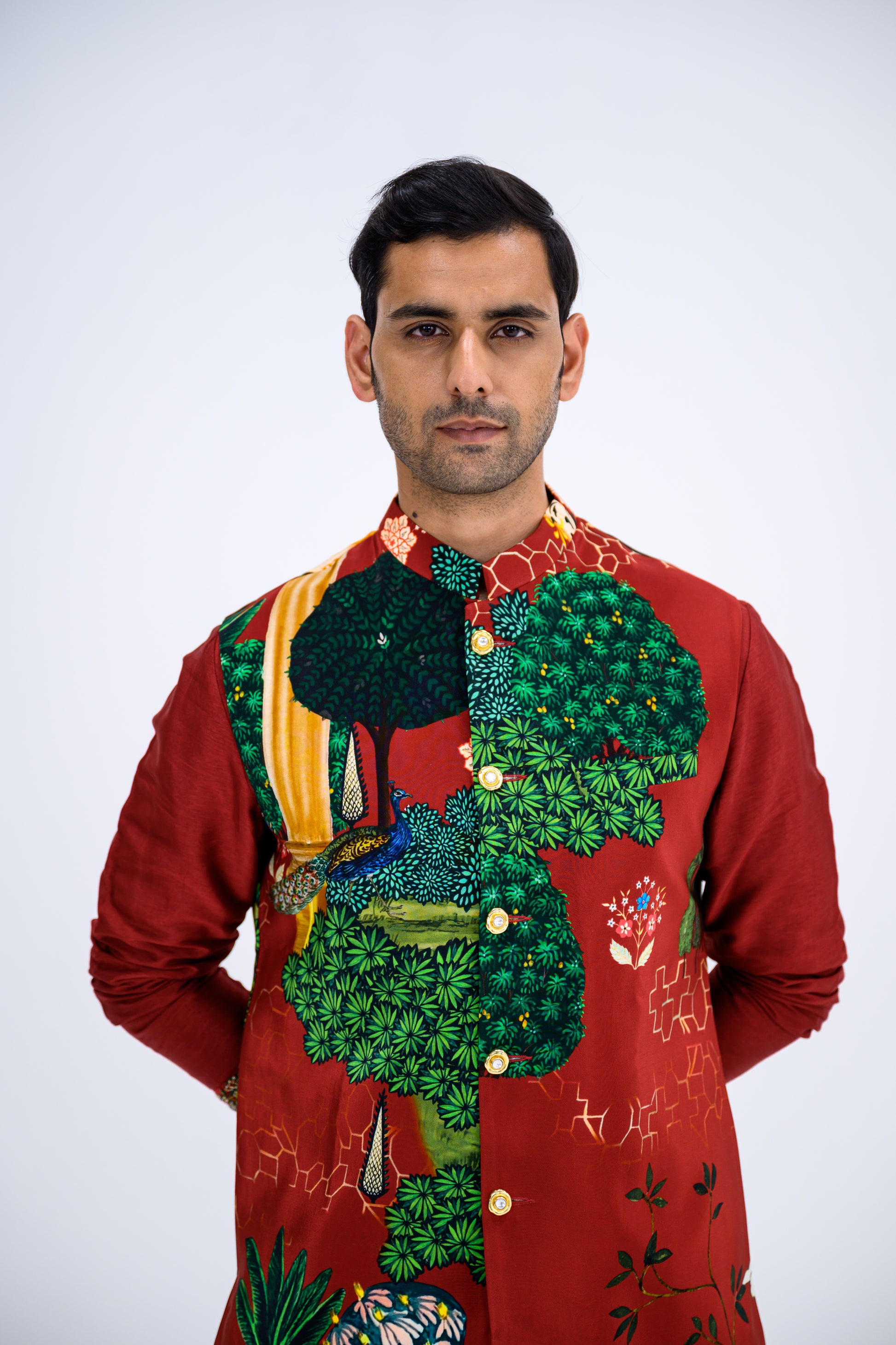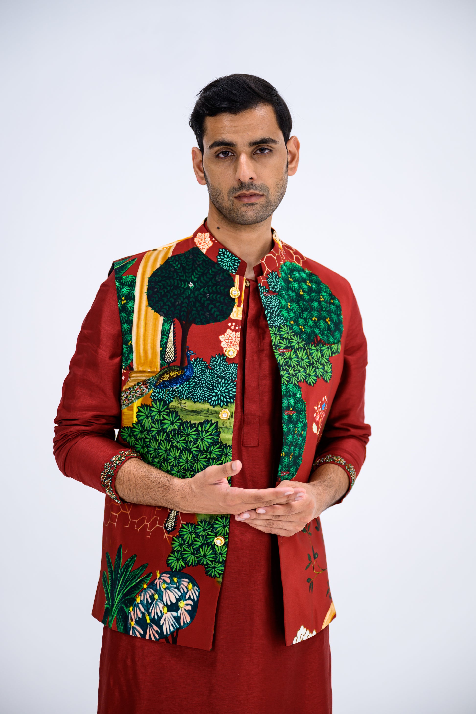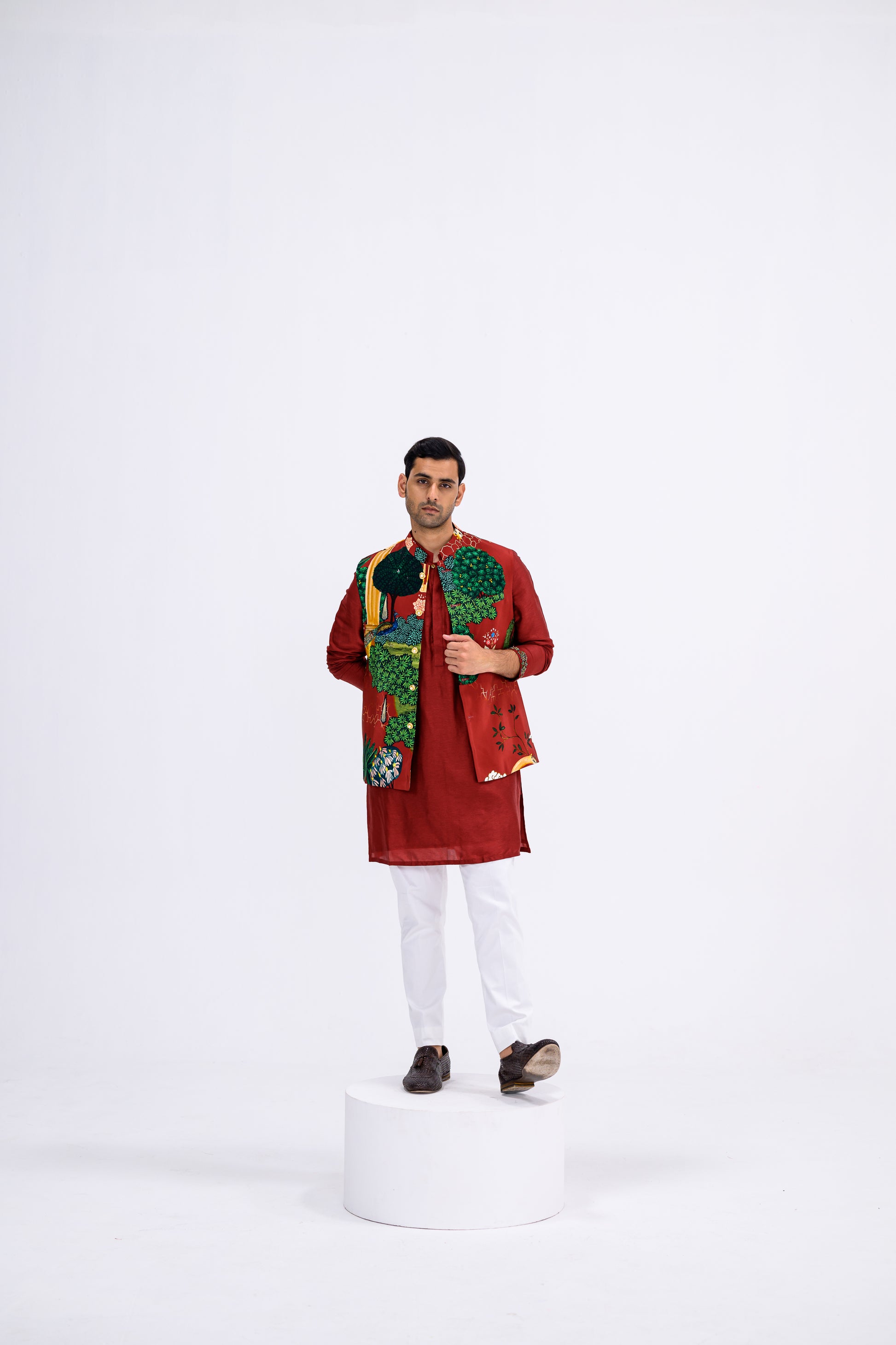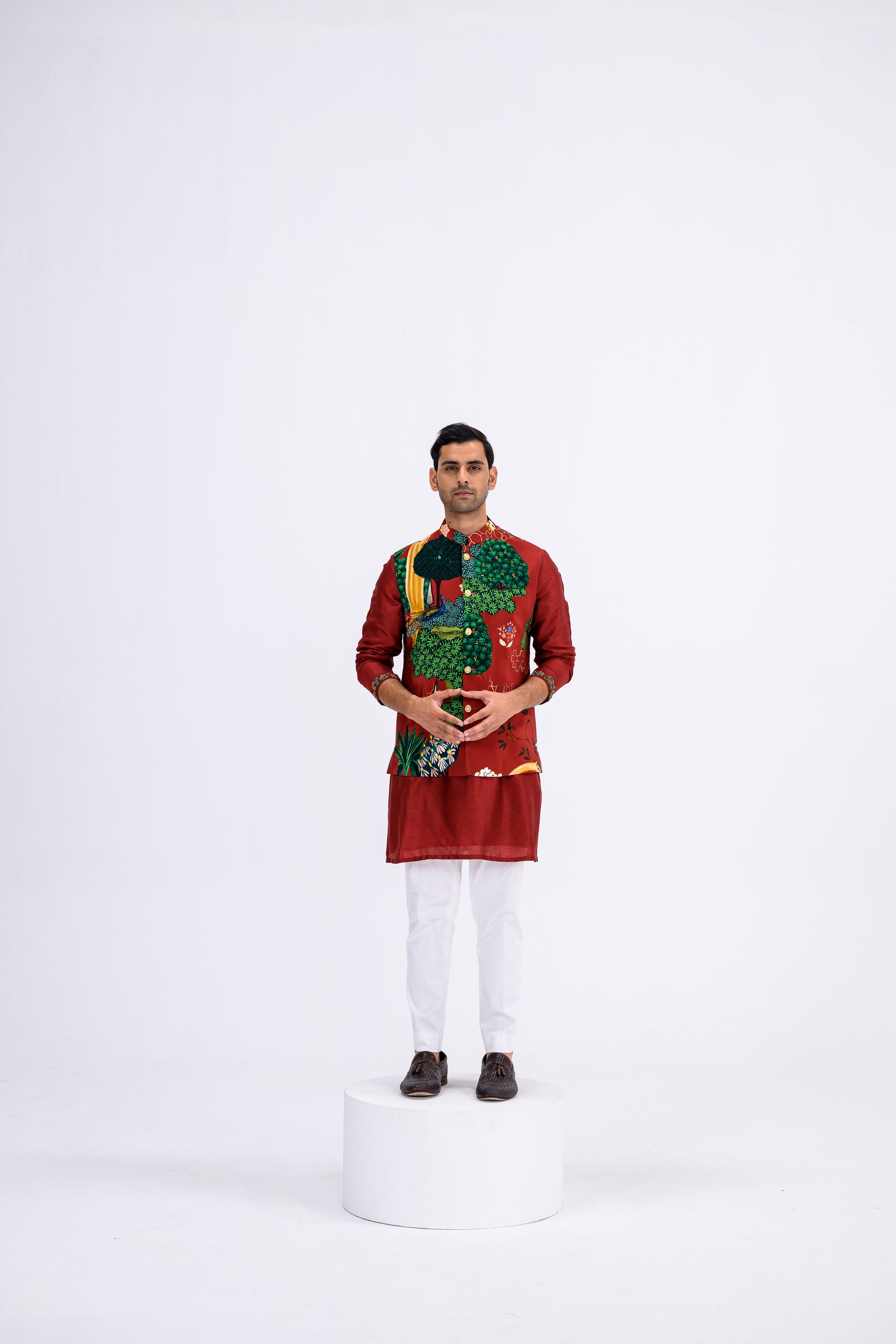 Red Mughal Garden Bundi Paired With Kurta And Pants Set