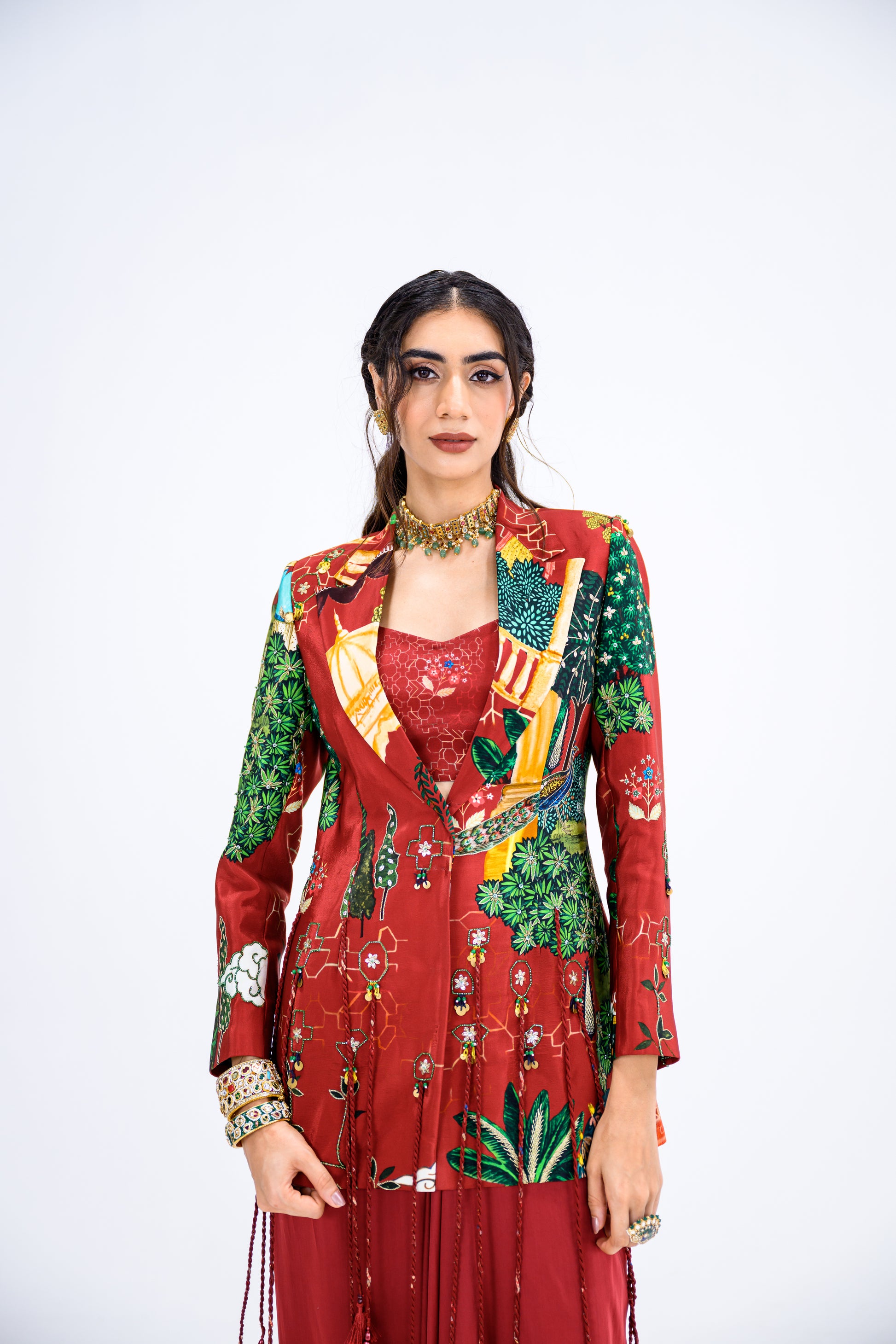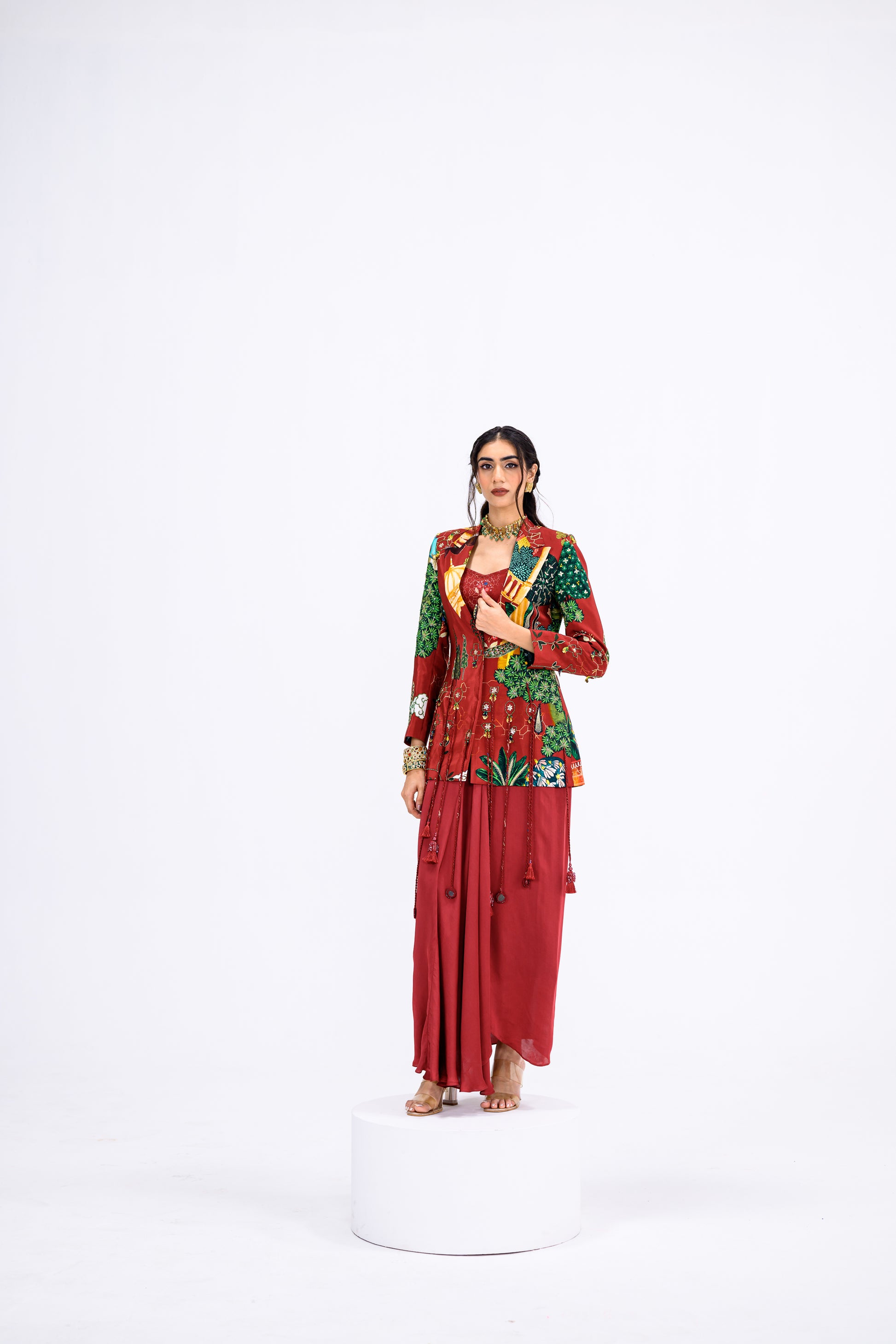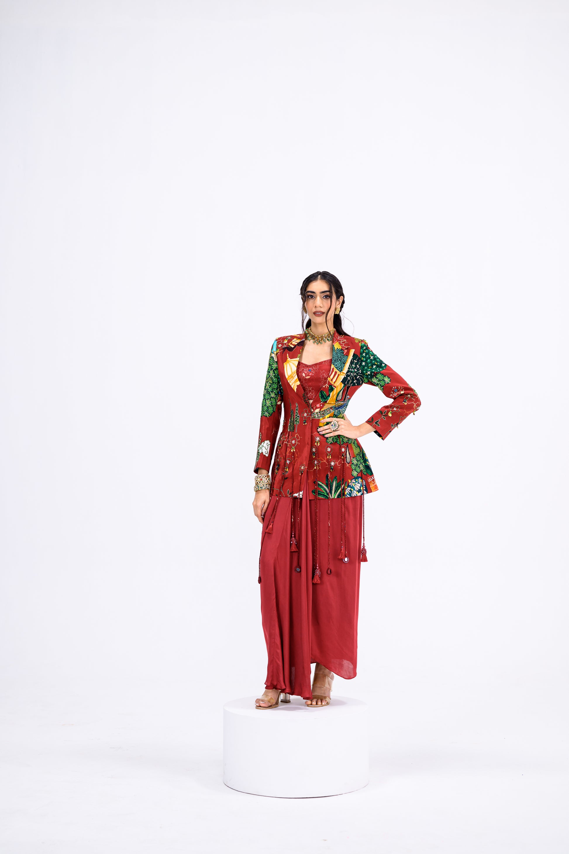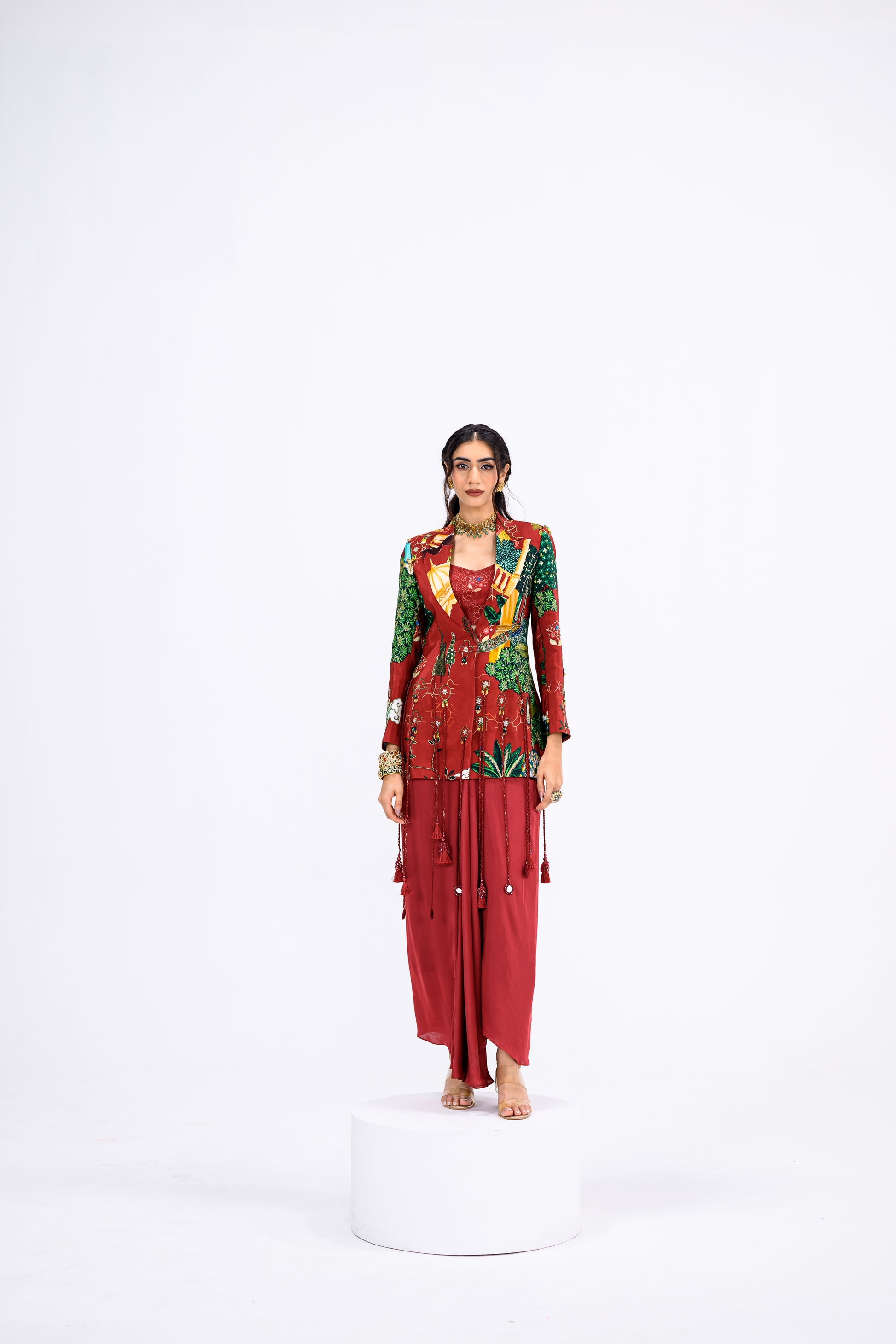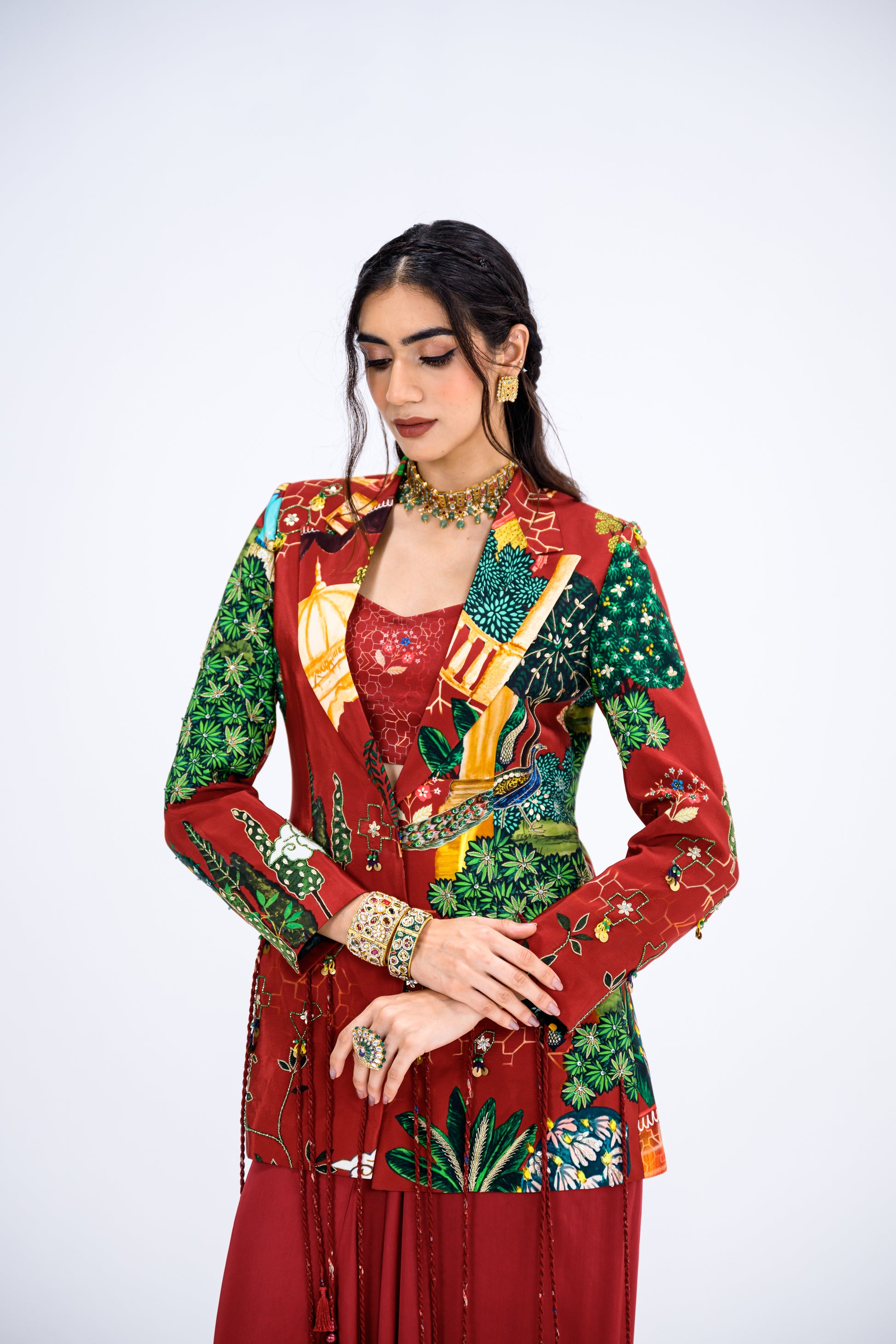 Red Mughal Highlight Blazer With Bralette And Dhoti Set