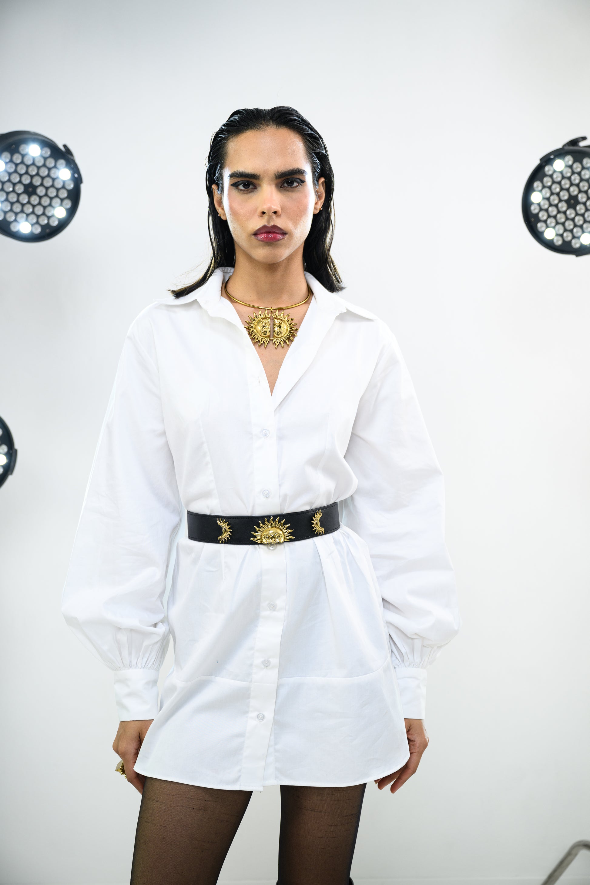 WHITE SHIRT DRESS PAIRED WITH SUN MOON BELT