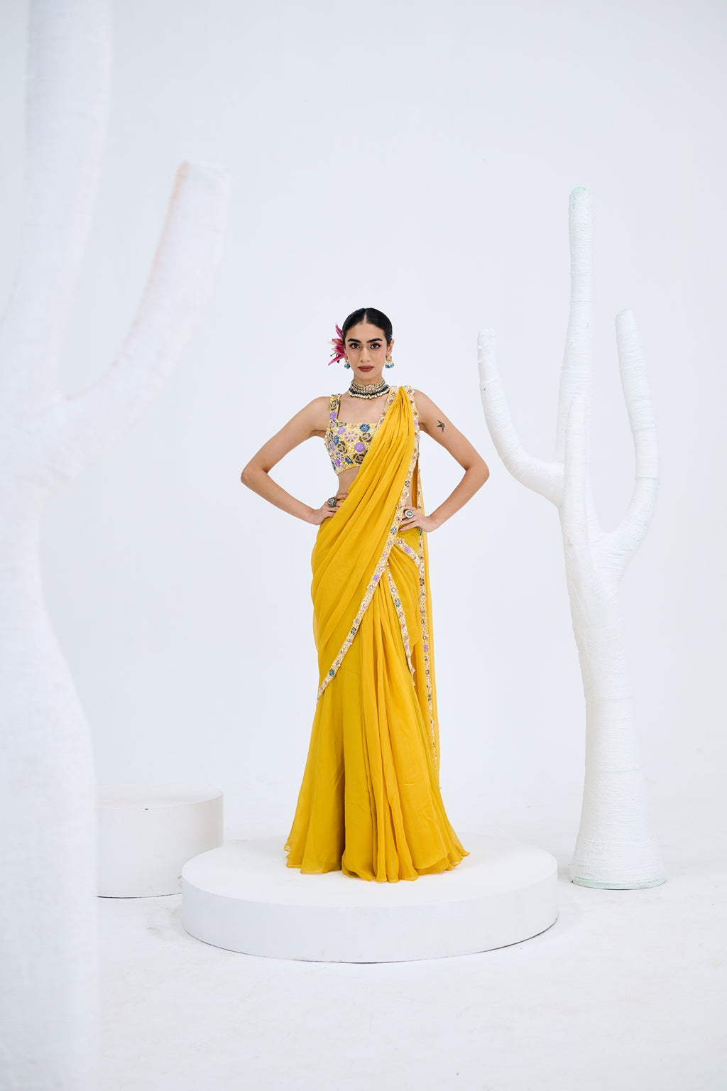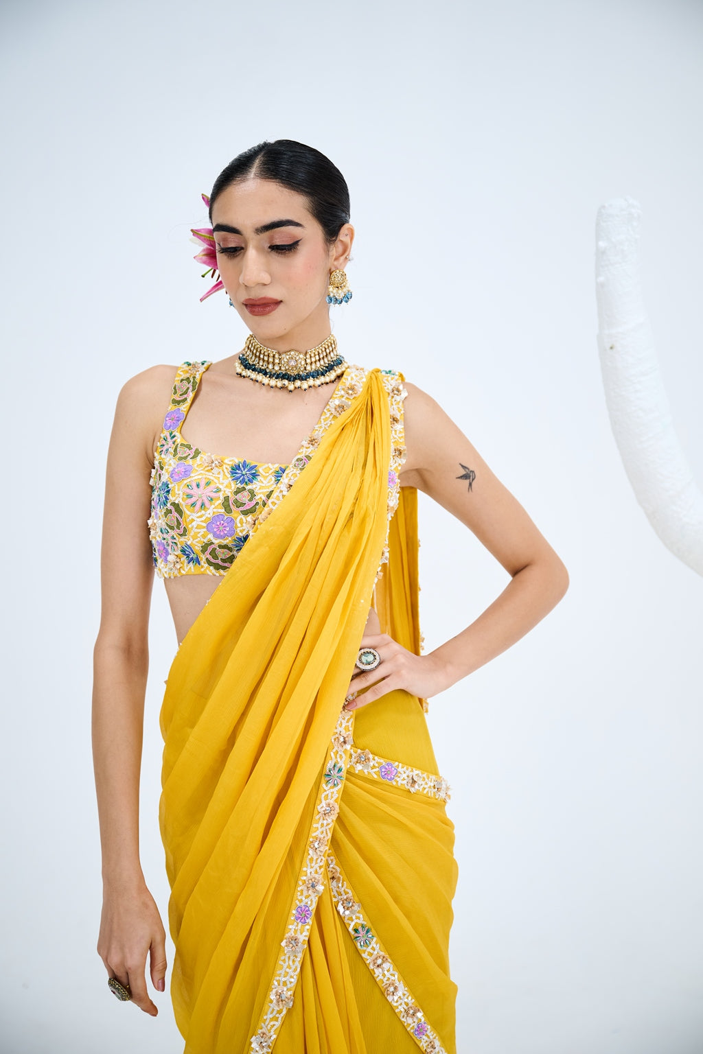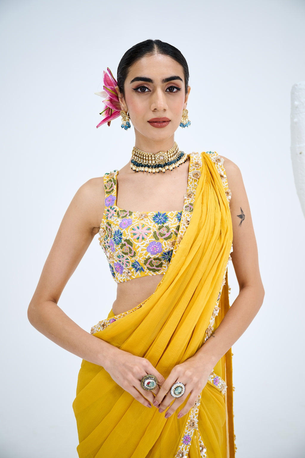 YELLOW PRE DRAPED SAREE WITH EMBROIDERED BLOUSE