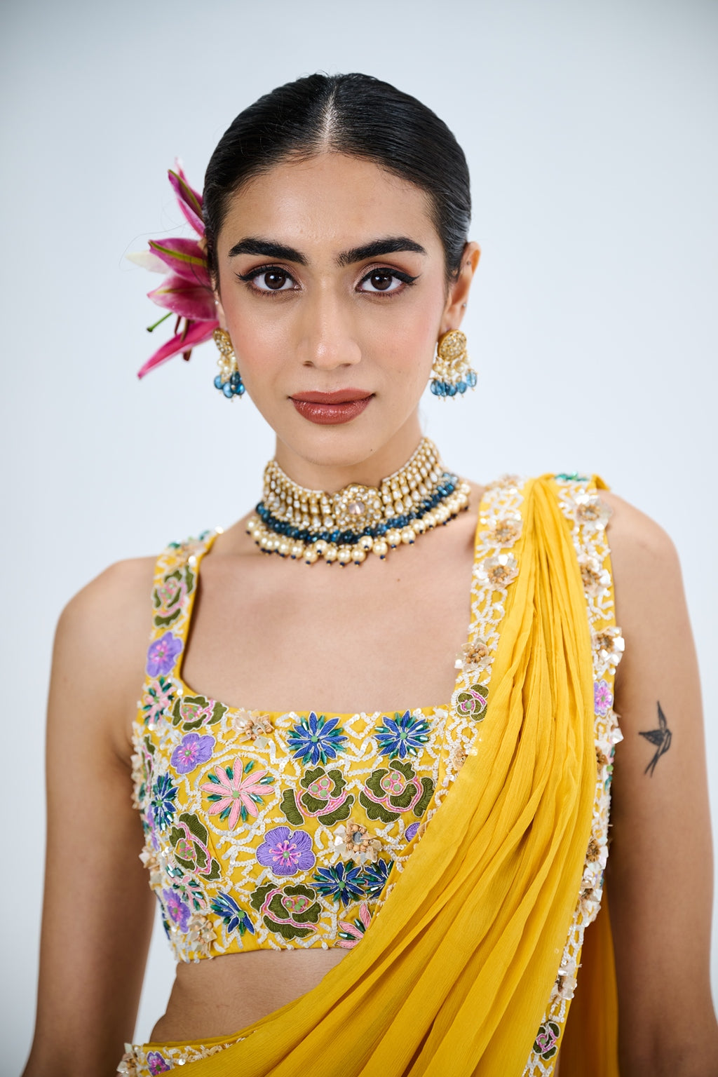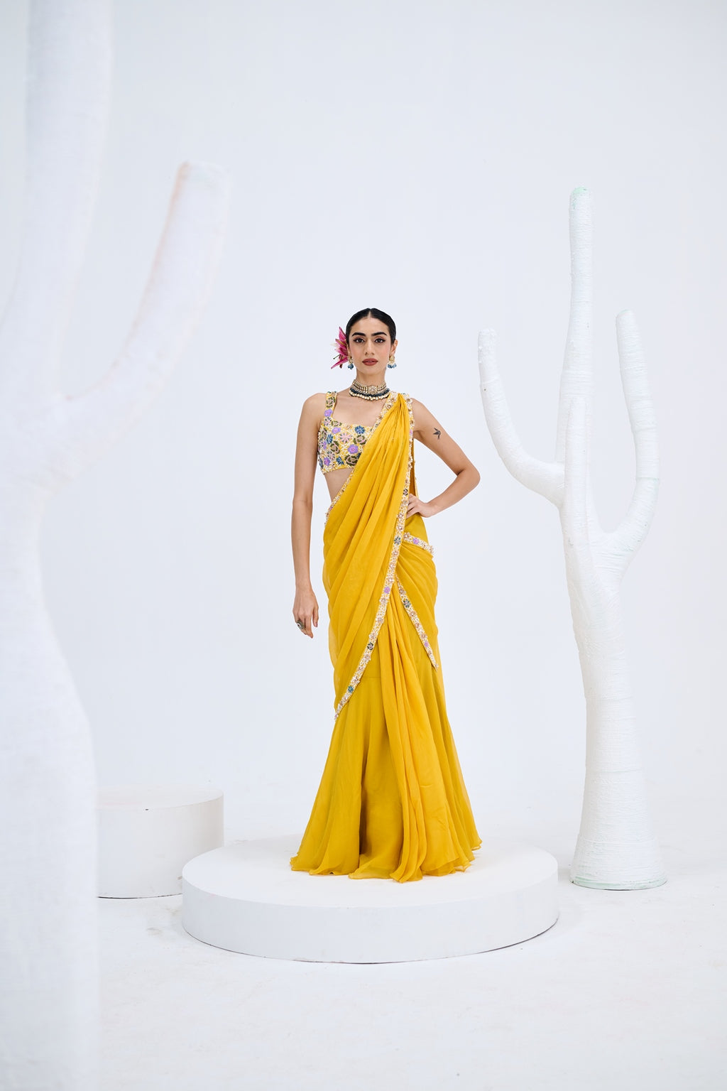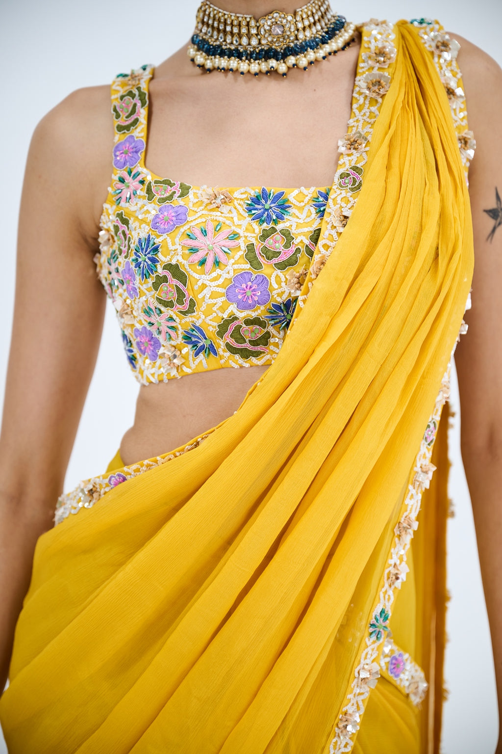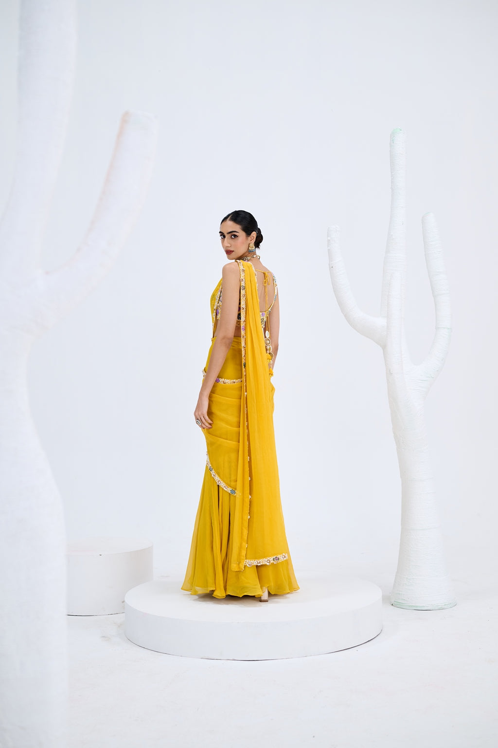 YELLOW PRE DRAPED SAREE WITH EMBROIDERED BLOUSE